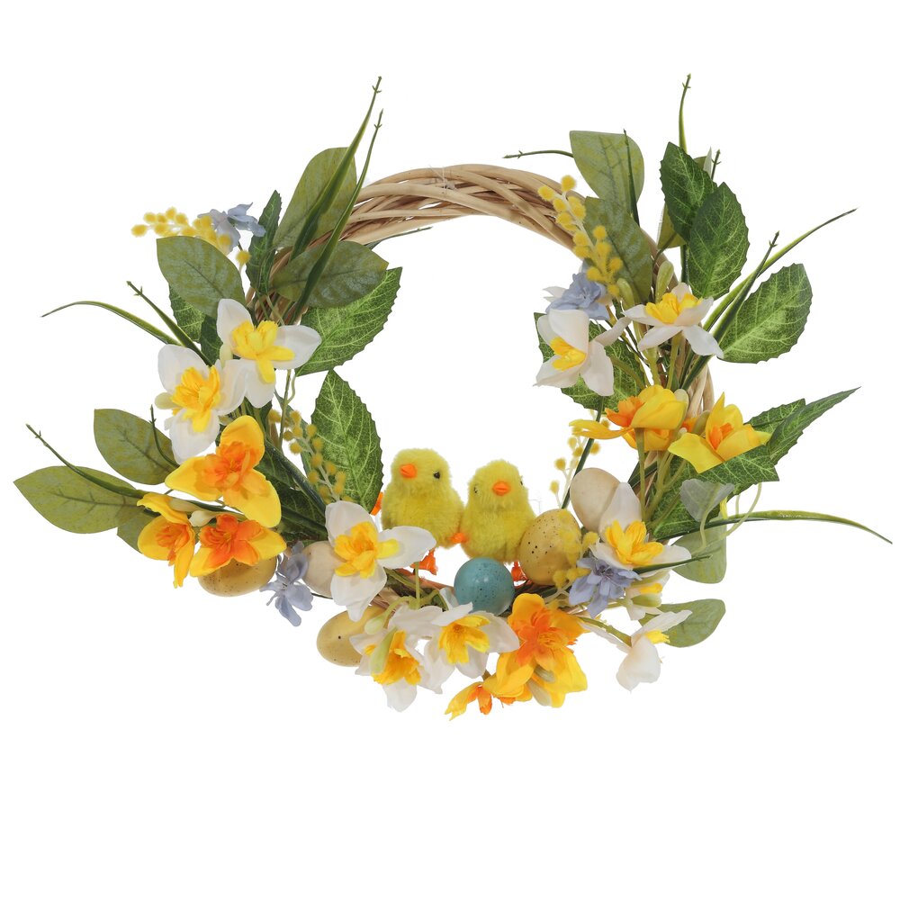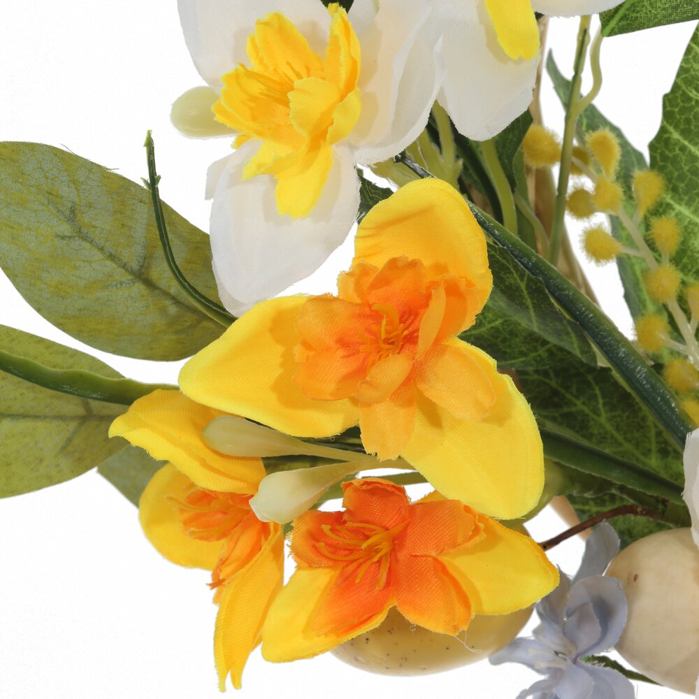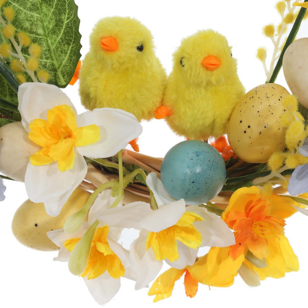 Декоративное изделие «Венок пасхальный» станет ярким акцентом весеннего интерьера и создаст атмосферу праздника в доме. Основа оформлена пышной зеленью и нежными весенними цветами в жёлто-белой гамме. Композицию дополняют декоративные пасхальные яйца и милые цыплята, символизирующие обновление и начало новой жизни. Венок можно повесить на дверь, стену, окно или использовать как центр композиции на праздничном столе. Изготовлен из текстильных, полимерных и натуральных материалов, что обеспечивает долговечность и аккуратный внешний вид изделия. Отличный вариант для украшения дома к Пасхе или в подарок близким.