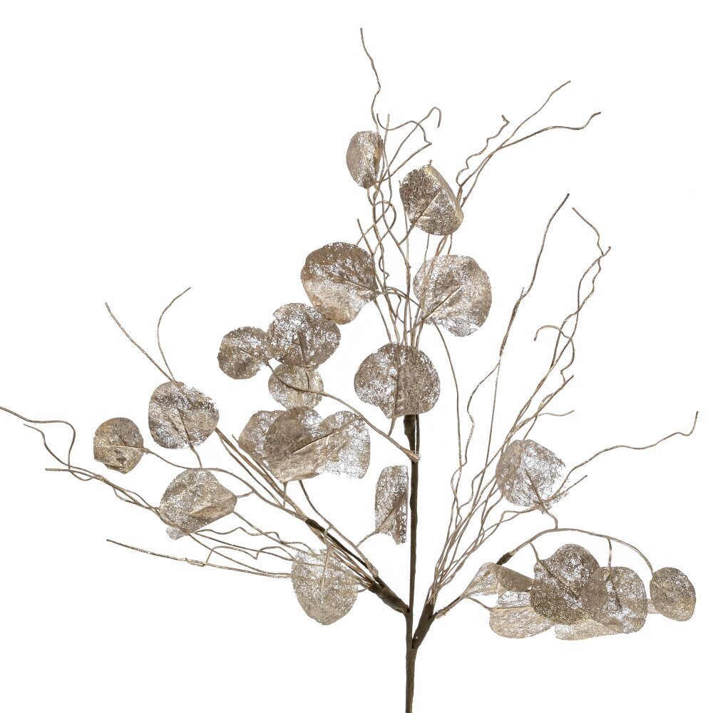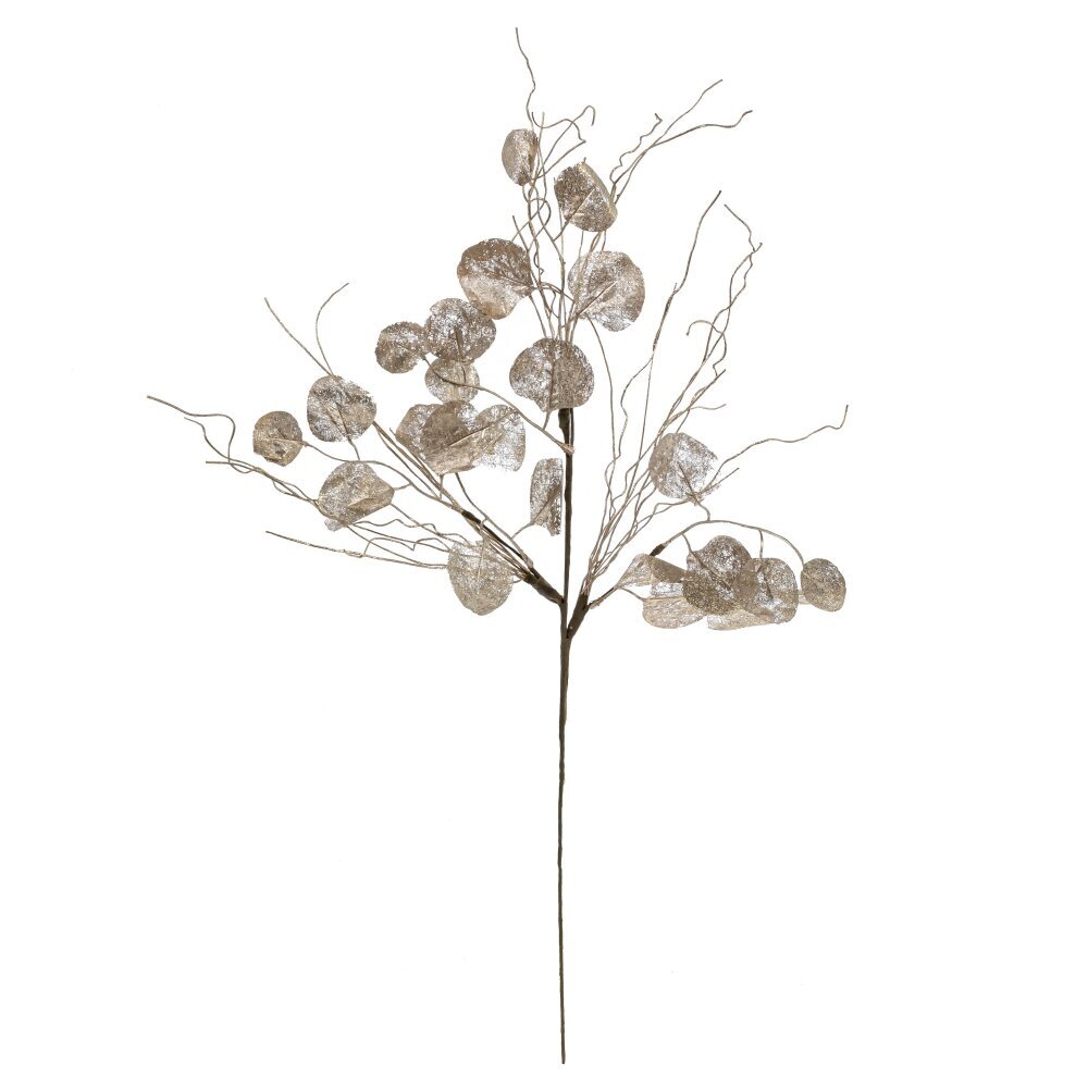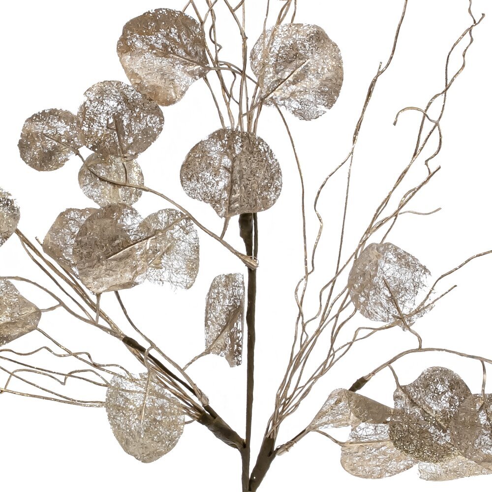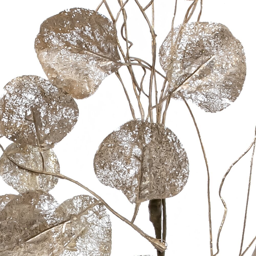 Декоративная ветка – утонченное и изысканное украшение для вашего интерьера. Эта ветка имеет длину 75 см. Нежные округлые золотистые листья придают этой ветке особую изысканность. Внутри ветки имеется проволока, которая позволяет изгибать ее в нужное положение. Этот элемент декора станет прекрасным дополнением к новогодней композиции в вазе, икебане или на елке, создавая атмосферу уюта и волшебства.