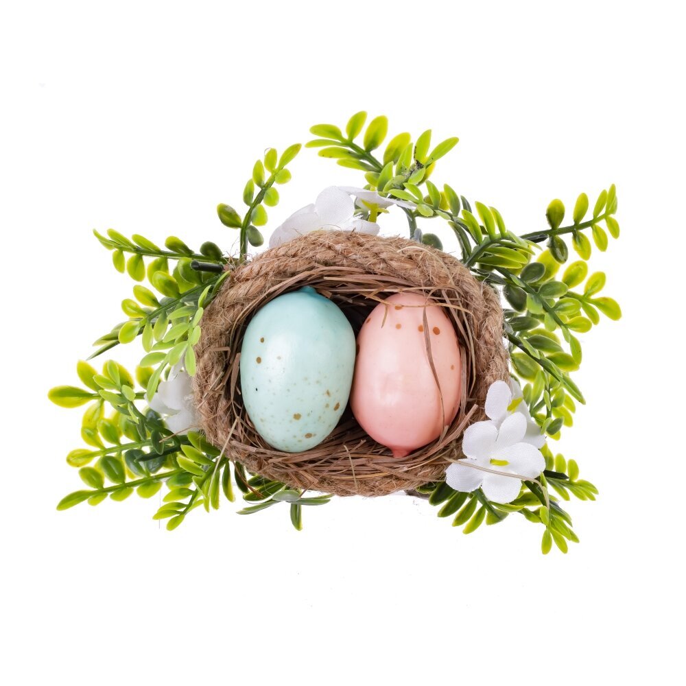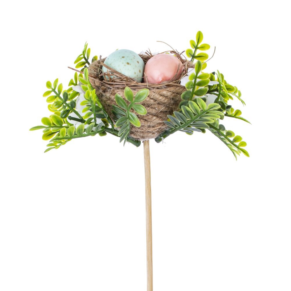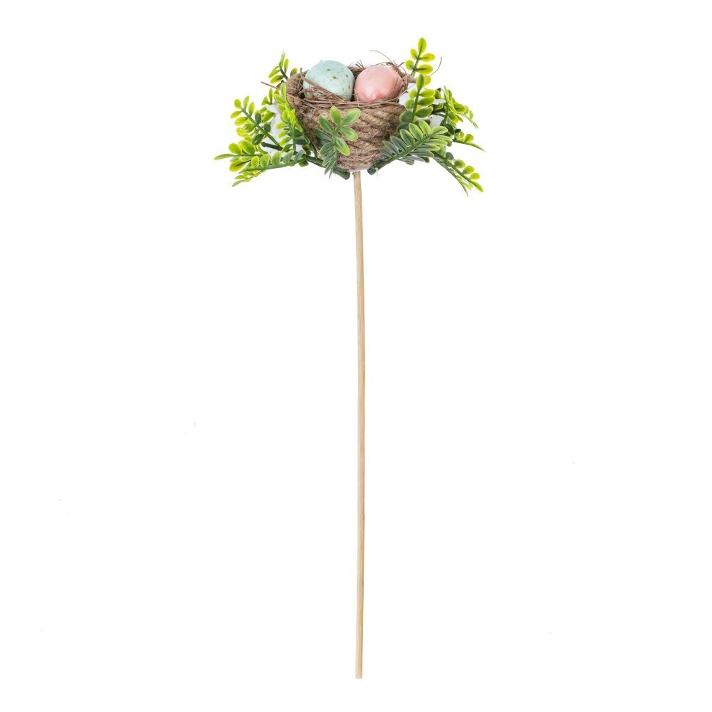 Декоративное изделие-вставка «Гнездо пасхальное» — нежный акцент для весеннего и пасхального декора. На тонкой деревянной палочке закреплено миниатюрное гнездо из натуральных материалов, украшенное плотной зеленью и двумя аккуратными яйцами из полимерных материалов пастельных оттенков. Композиция выглядит очень естественно и подчёркивает атмосферу обновления и уюта. Вставку удобно использовать для оформления цветочных композиций, корзин, букетов, подарочных наборов, праздничного стола или интерьера в эко?стиле. Лёгкая и прочная, она многократно пригодна для сезонного декора дома, офиса или витрин магазина.
