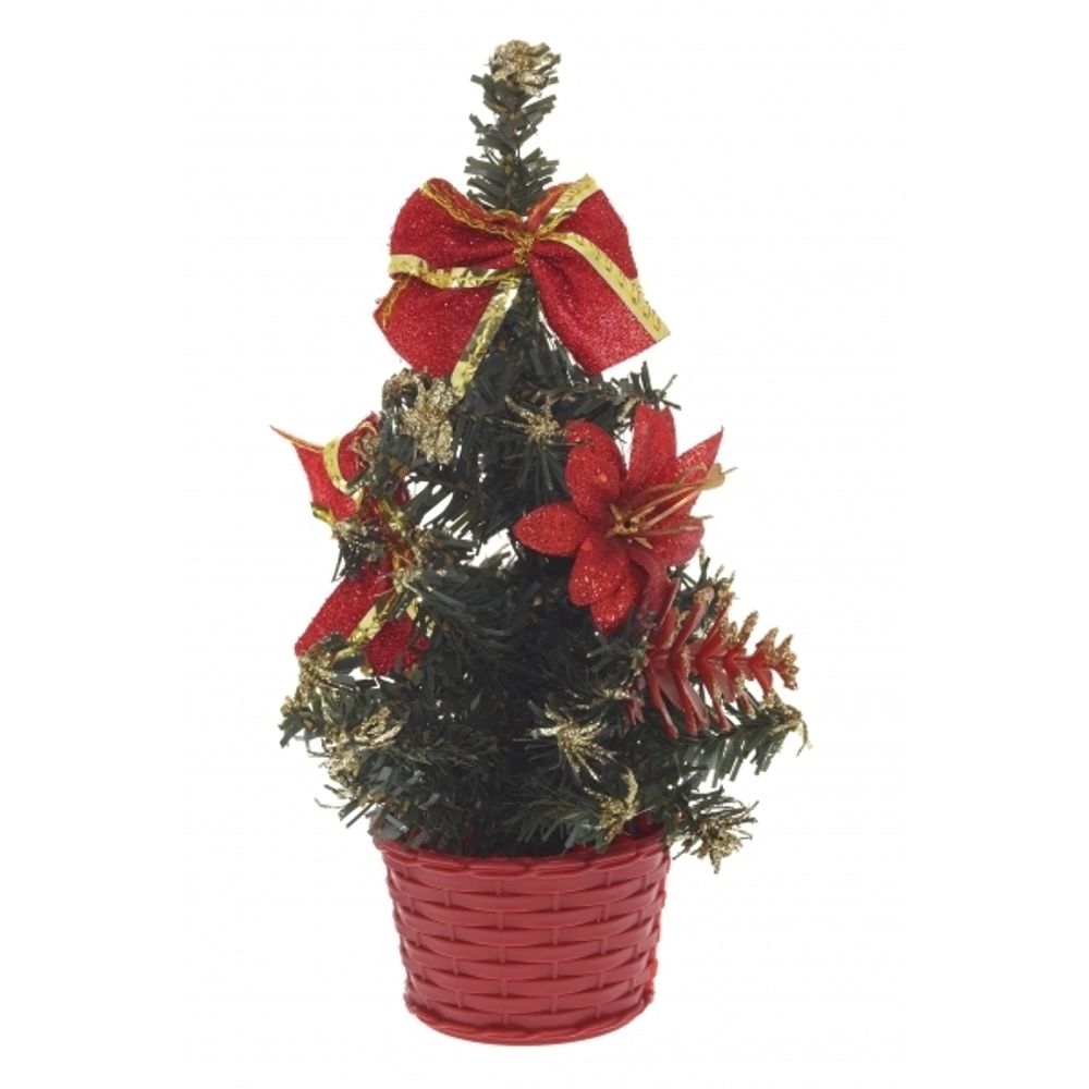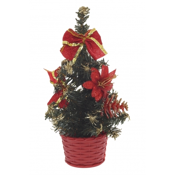 Елка искусственная с украшениями высотой 20см. Сделана из металла , полимерной пленки и фольги. Игрушки и корзина - из пластика, цветы и бант - из текстиля, шишки натуральные. Все украшения в классическом красном цвете. Создат праздничную обстановку и украсит любой интерьер. Упаковка- пакет