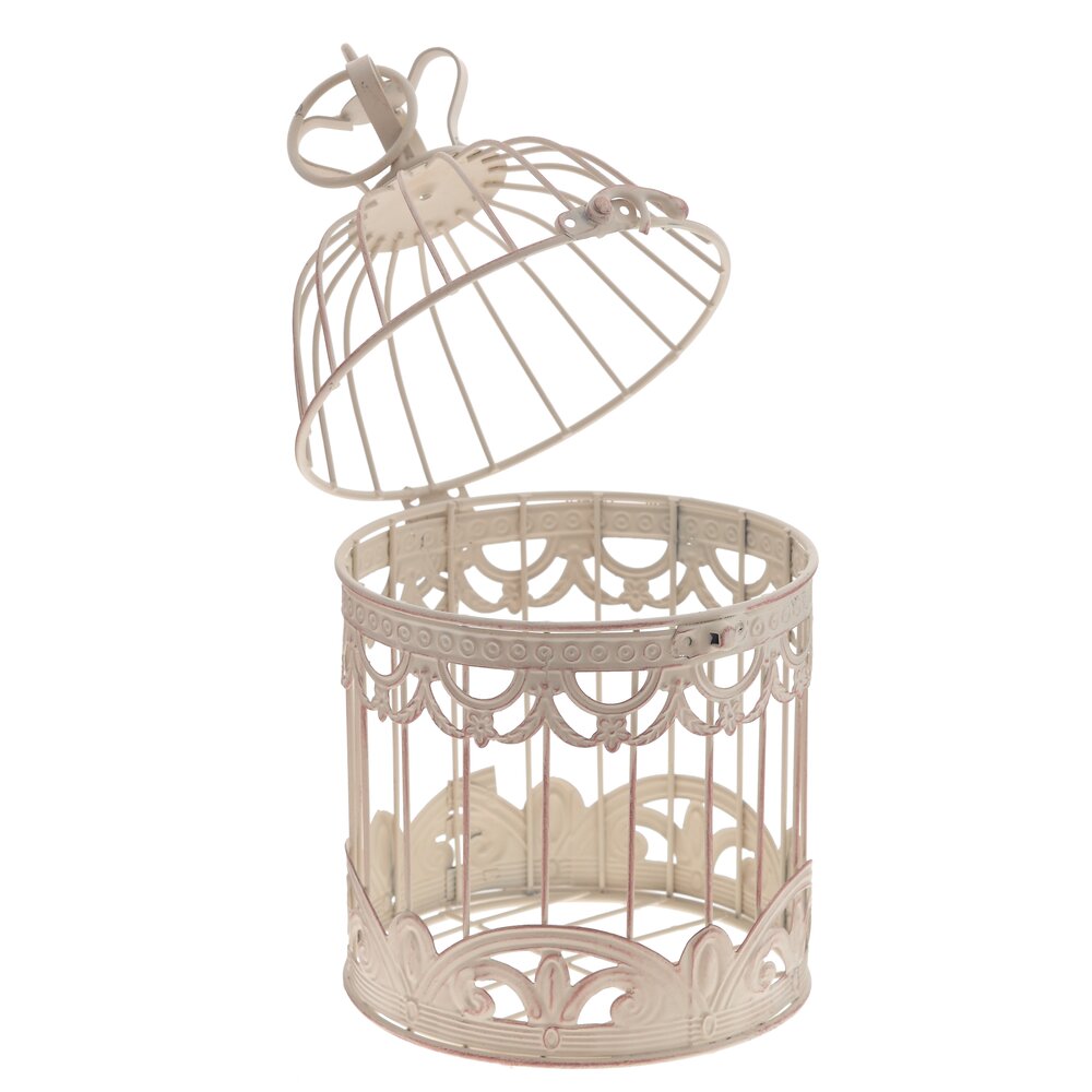 Эта декоративная клетка белого цвета выполнена из металла. Она имеет потертости, которые придают ей винтажный вид и добавляют характер. Клетка может использоваться для декорирования стола, полки или другой поверхности, для хранения различных предметов, таких как свечи, цветы, а так же для создания декоративных композиций. В целом, это очень универсальный и стильный декоративный предмет, который добавит изюминку в любой дом.