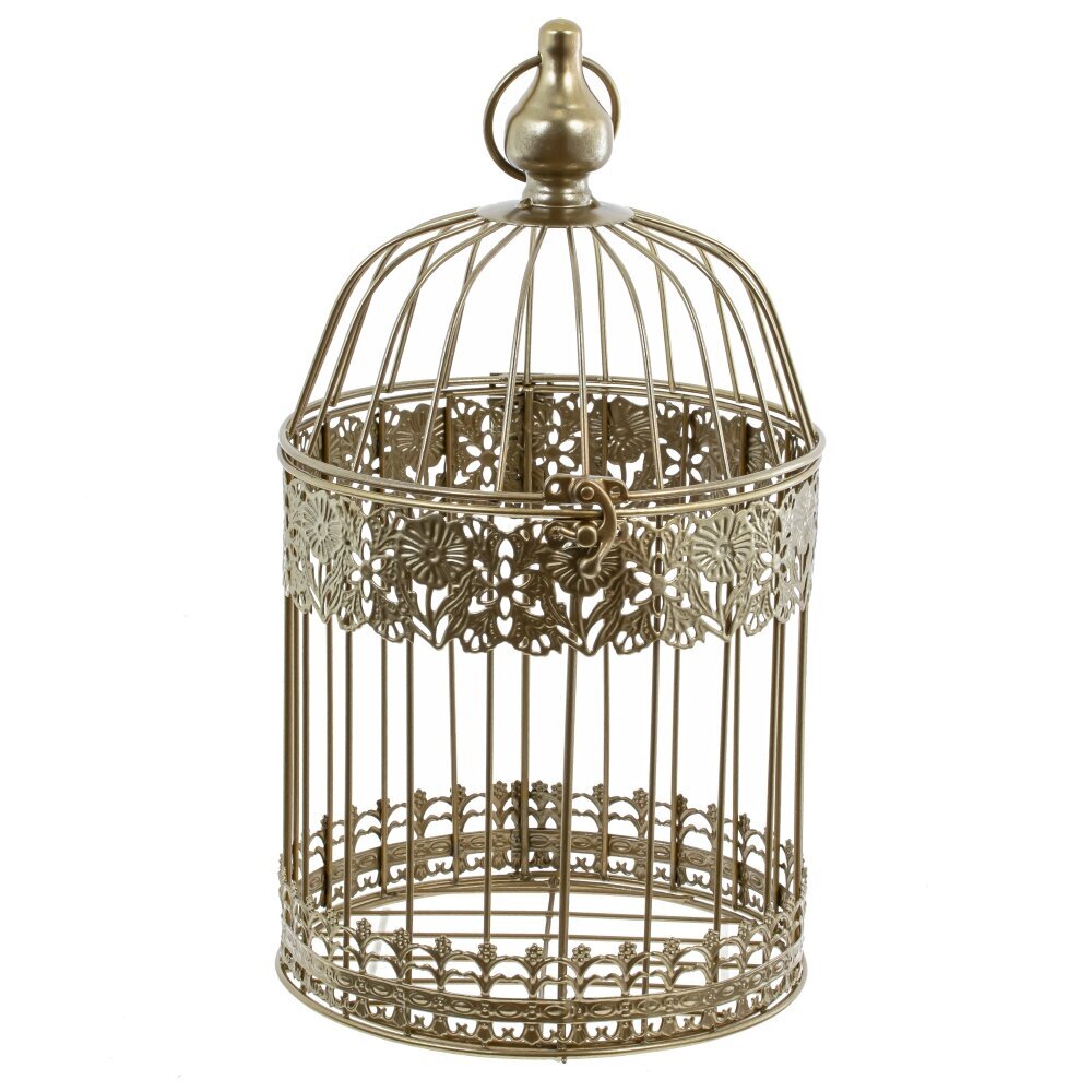 Декоративная клетка изготовлена из прочного металла, который обеспечивает ей долгую службу и сохраняет первоначальный вид на протяжении длительного времени. Ее золотистый цвет делая ее превосходным дополнением к любому интерьеру. Благодаря кольцу для подвешивания, она может быть удобно размещена в любом месте вашего дома, добавив стиля и изысканности.