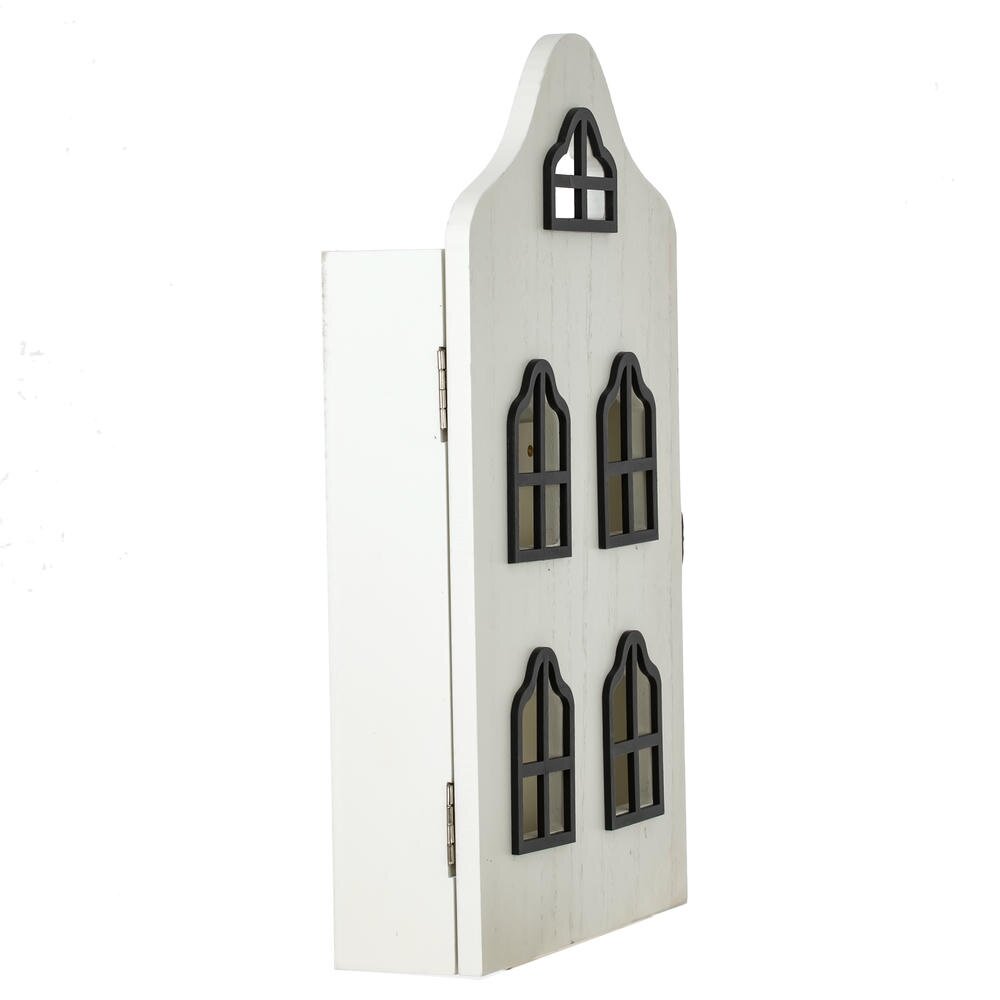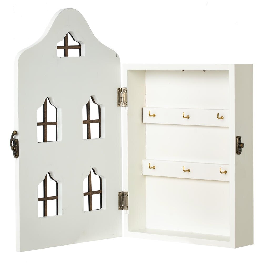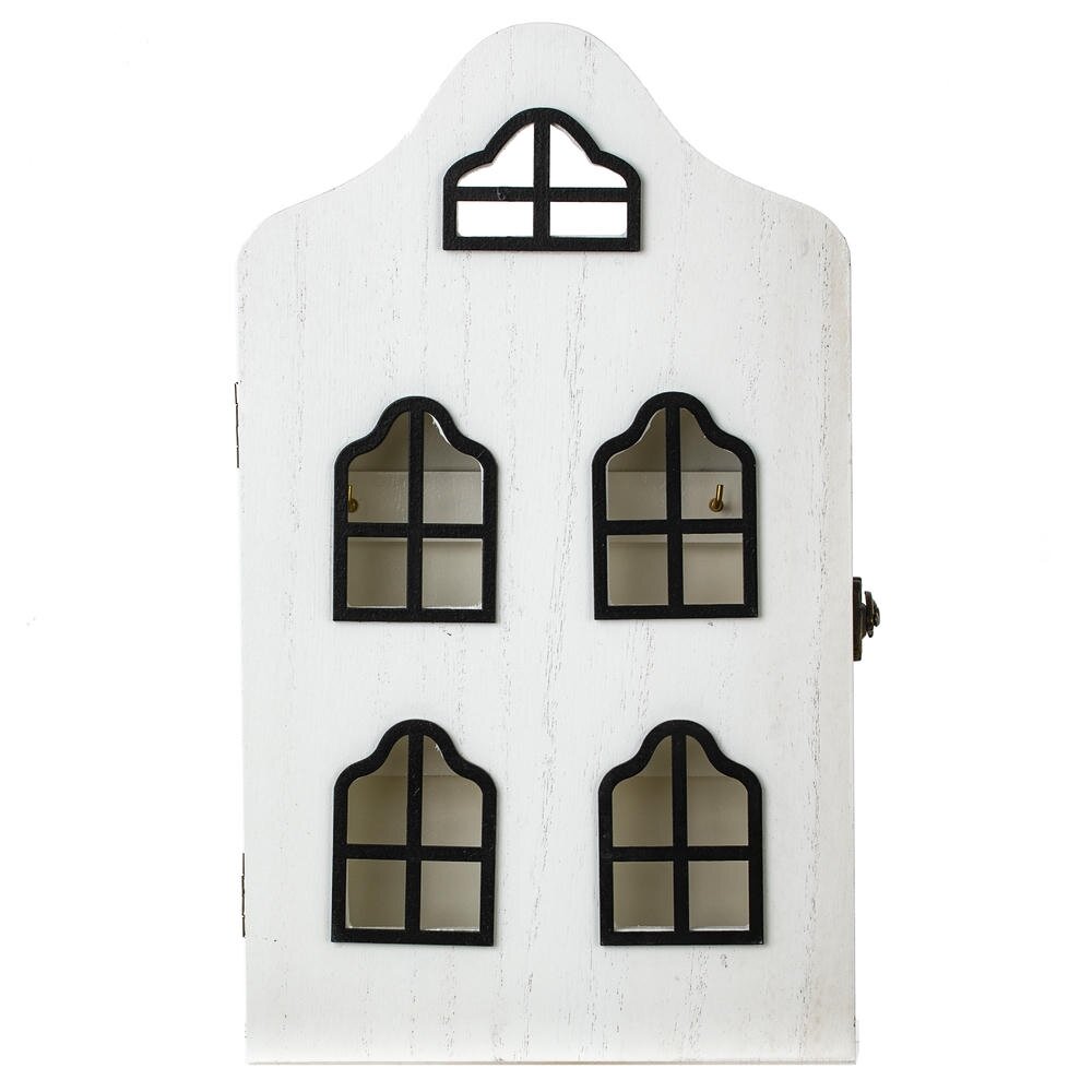 Настенная ключница из дерева и металла, выполненная в виде фасада домика, станет стильным акцентом в прихожей и поможет навести порядок в ключах. Корпус из прочного дерева окрашен в белый цвет, фронтальная панель украшена декоративными «окнами», что создаёт эффект маленького окошка и делает изделие заметным и оригинальным. Внутри предусмотрены металлические крючки 6 шт для аккуратного размещения ключей всех членов семьи. Надёжная металлическая защёлка фиксирует дверцу и предотвращает случайное открывание. Ключница органично впишется в интерьер в стиле классика, прованс, сканди и модерн, подчёркивая вкус владельцев и освобождая пространство от лишних мелочей. Идеальный практичный подарок для дома или офиса.