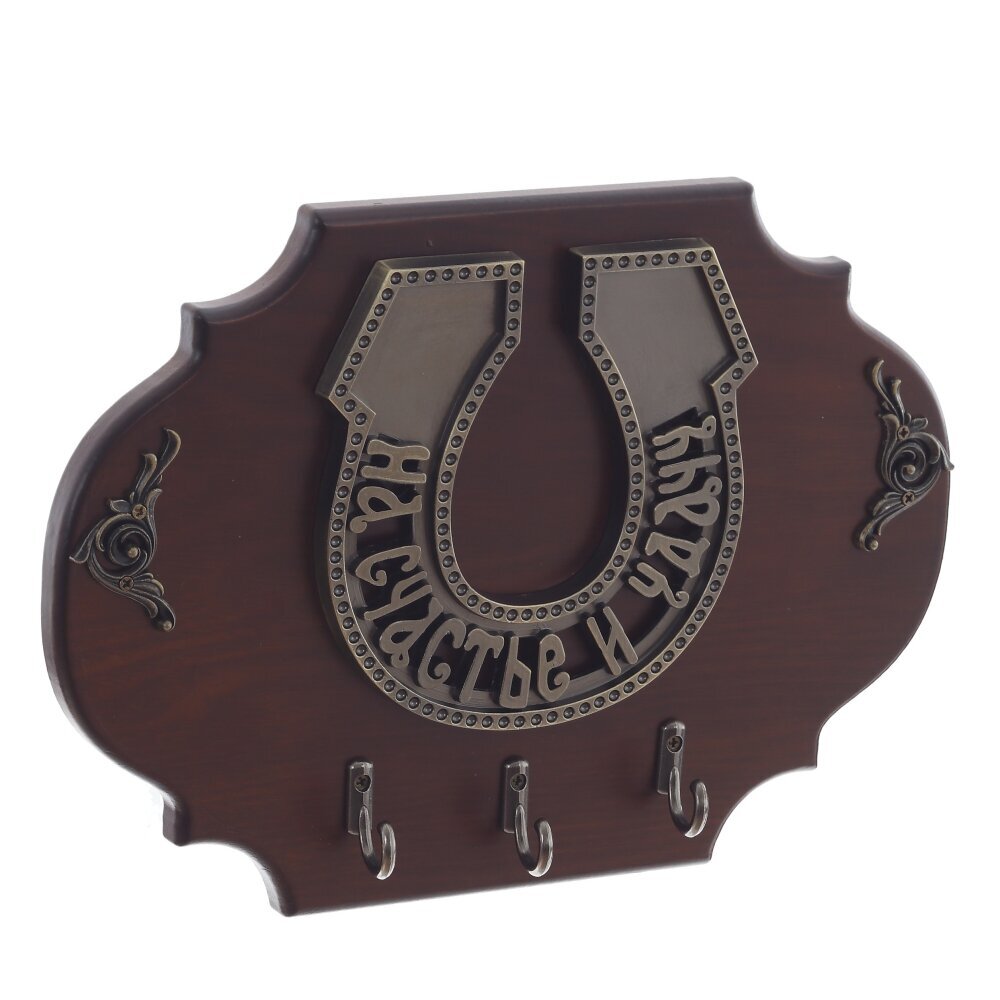 Ключница настенная, открытого типа, с тремя металлическими крючками и декором в виде подковы с надписью "На счастье и удачу" и ажурных угловых элементов. Ключница – предмет не только красивый, но и функциональный, поэтому ей найдется место и в офисе, и в квартире, и в загородном доме.