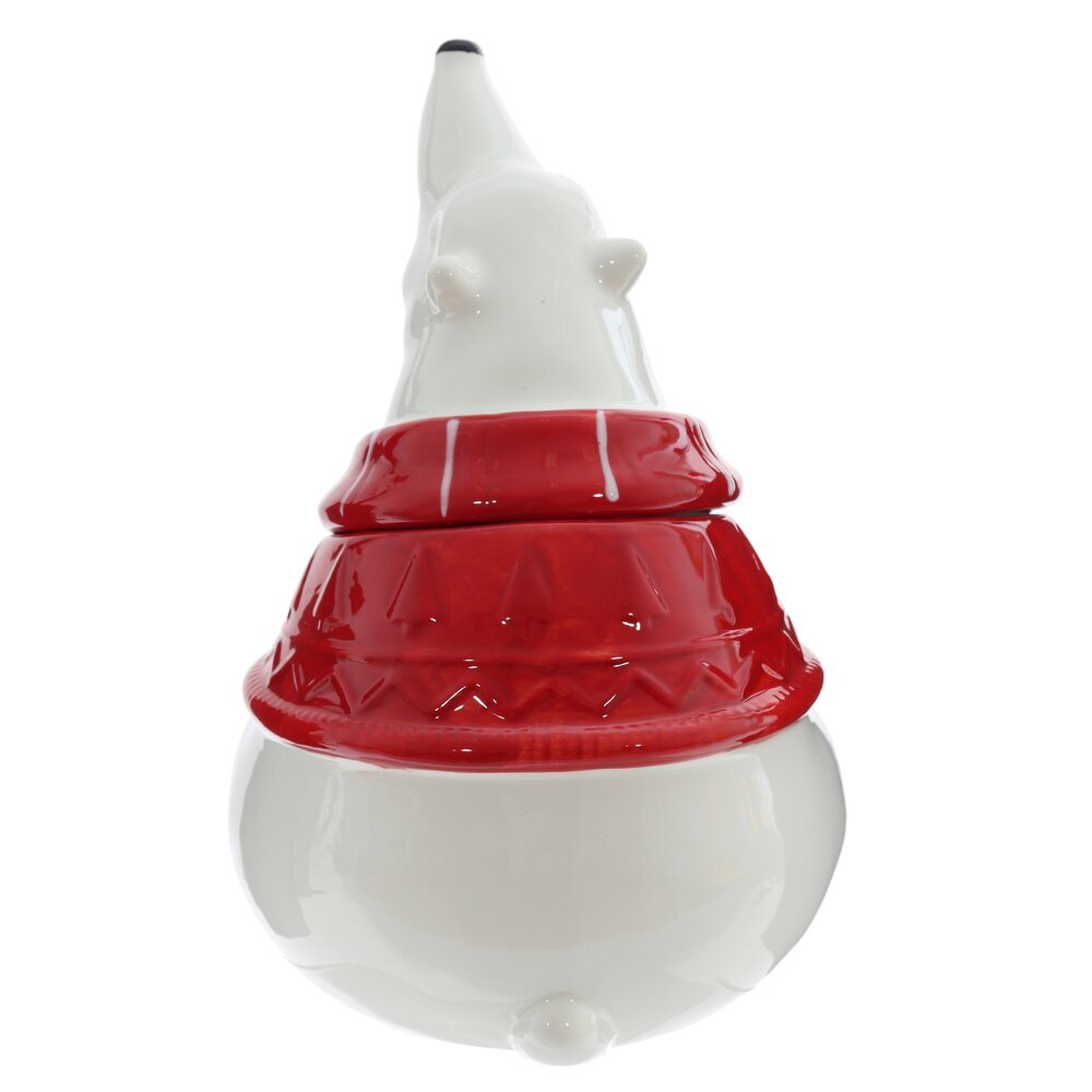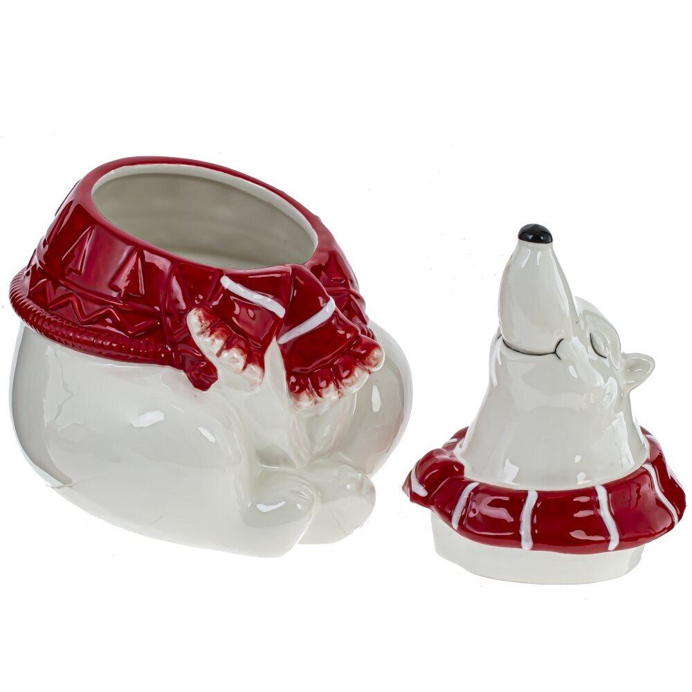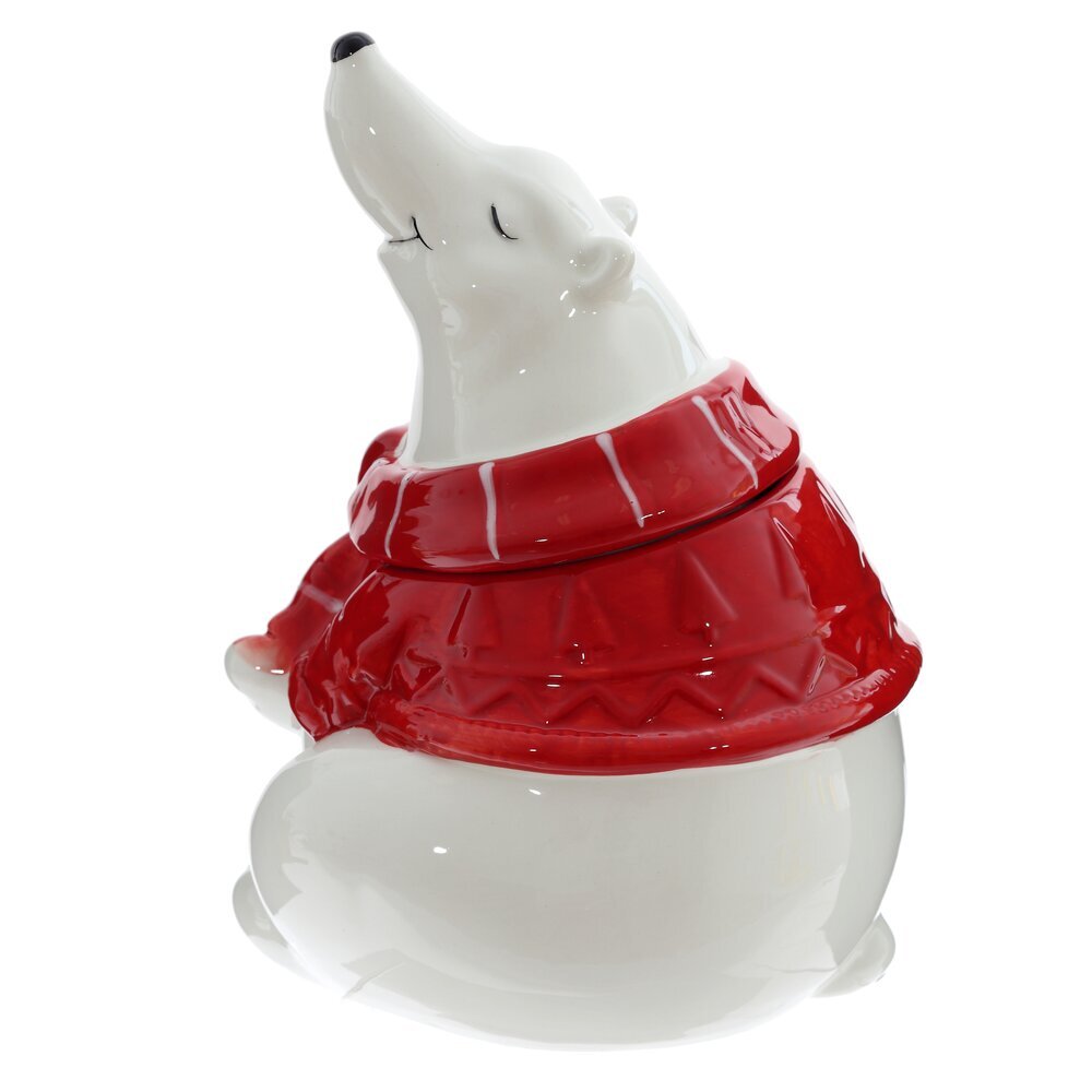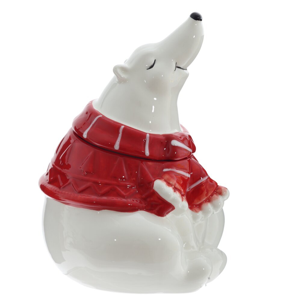 Белый медведь, одетый в красный свитер и шарф, мечтательно закрывает глаза, словно предаваясь зимним грезам. Его расслабленная поза и мягкая улыбка приносят ощущение тепла и спокойствия, а крышка в форме головы медведя делает ее не только практичной, но и игривой.