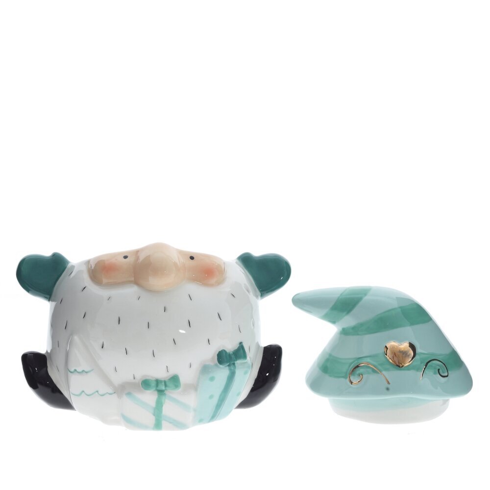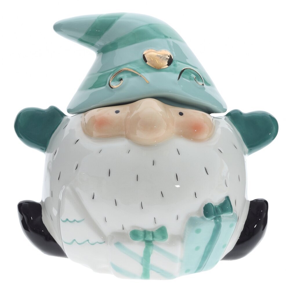 На его голове красуется бирюзовый колпак в полоску, увенчанный золотым сердечком, символизирующим тепло и заботу. Его белоснежная борода скрывает множество маленьких подарков, добавляя элемент неожиданности и веселья.