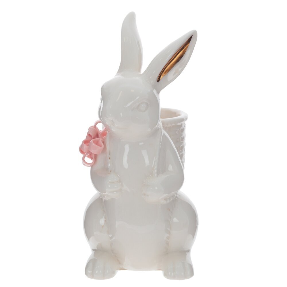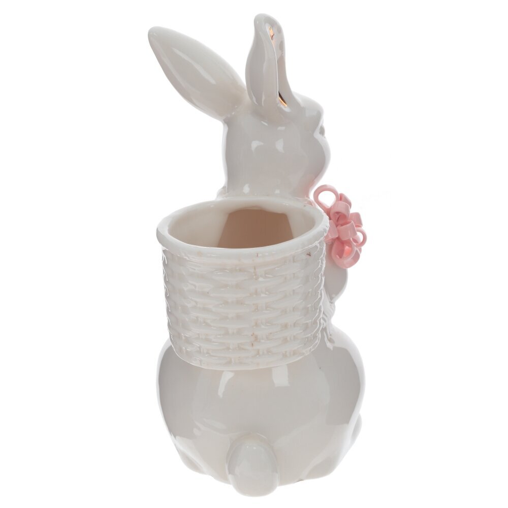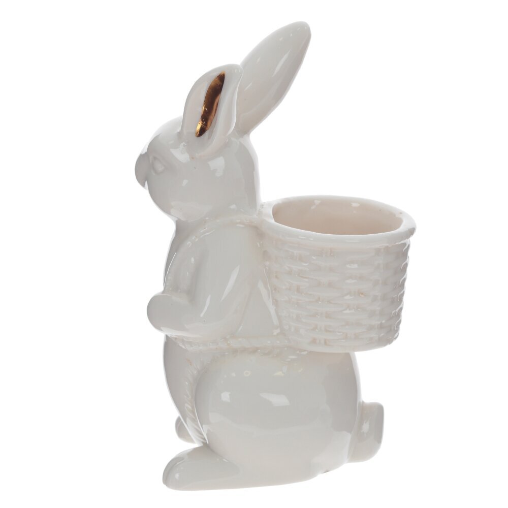 Фарфоровая конфетница «Заяц» – нежное пасхальное украшение для вашего дома. Изящный белый зайчик с плетёной корзинкой за спиной станет очаровательным акцентом праздничного стола. Внутрь корзинки можно положить конфеты, драже, мини?яйца или небольшие сувениры для гостей. Ушки украшены золотистым покрытием, на груди – розовый бантик, придающий композиции особое очарование. Гладкая глянцевая глазурь легко очищается и надолго сохраняет первоначальный блеск. Подойдёт для сервировки пасхального завтрака, детского праздника или как милый подарок близким.