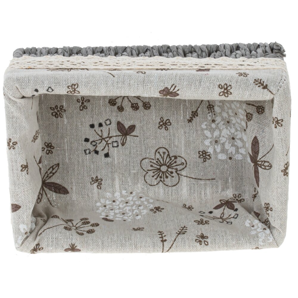 Прямоугольная корзина-органайзер. Основание сплетено из натуральных материалов, окрашенных в графитово-серый цвет; плетение плотное, аккуратное. Для жесткости и долговечности внутри предусмотрен тонкий металлический каркас. Внутри — мягкая текстильная вкладка с бежевым фоном и коричневым цветочно-травяным рисунком, верх украшен кремовой кружевной тесьмой. Корзина сочетает натуральное плетение, текстильные материалы и металл, благодаря чему одновременно выглядит уютно и остается прочной. Подходит для хранения белья, косметики, аксессуаров, пряжи или детских вещей, гармонично вписывается в интерьеры в стиле эко, прованс и сканди.