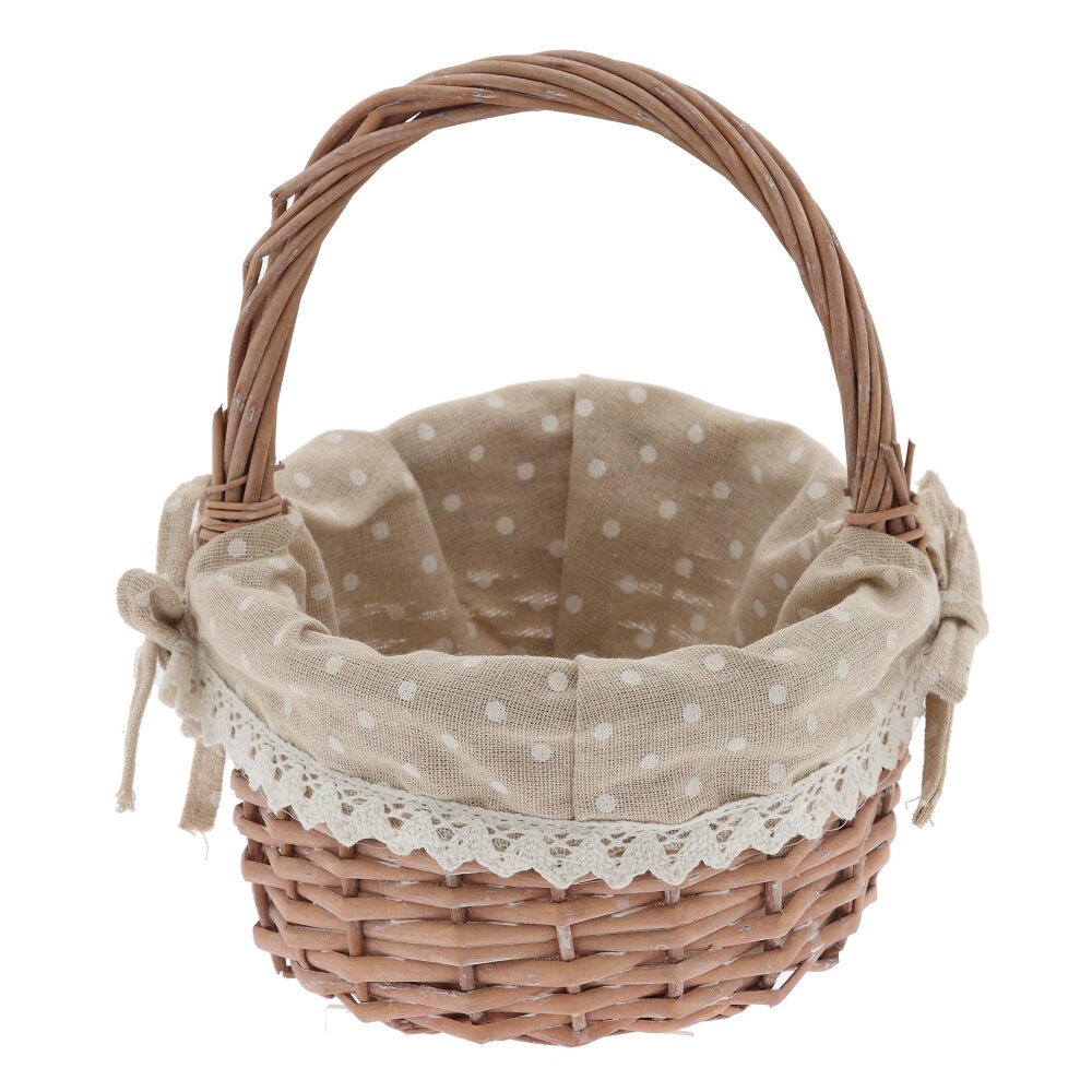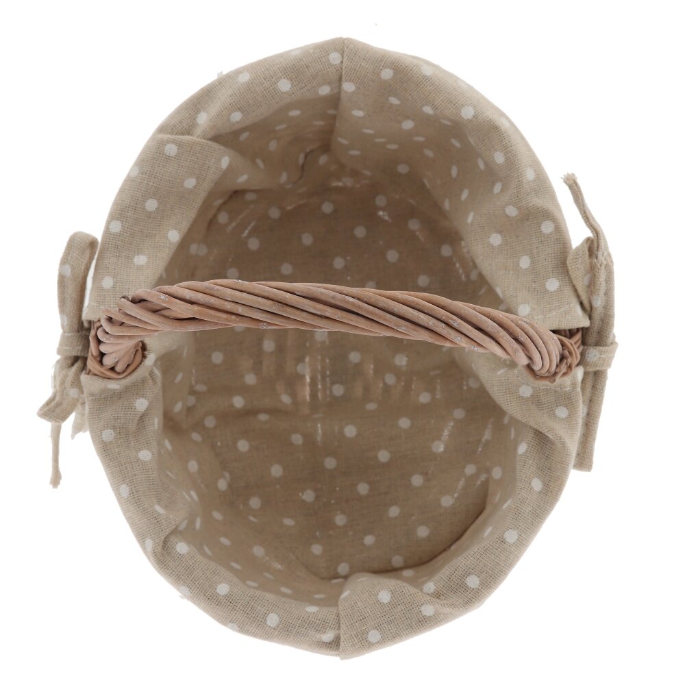 Плетёная корзина с ручкой и текстильной вставкой – стильный и практичный аксессуар для дома и дачи. Основа выполнена из прочной лозы натурального оттенка, аккуратно и плотно сплетённой для надёжности и долговечности. Внутри корзина оформлена съёмным бежевым чехлом из ткани в белый горошек, по краю украшенным ажурным кружевом и бантиком. Такой декор придаёт изделию уютный, деревенский шарм и позволяет использовать корзину не только для хранения мелочей, рукоделия или косметики, но и как красивый элемент сервировки стола, подарочную упаковку или пасхальную корзинку. Лёгкая, удобная и компактная, она гармонично впишется в любой интерьер.