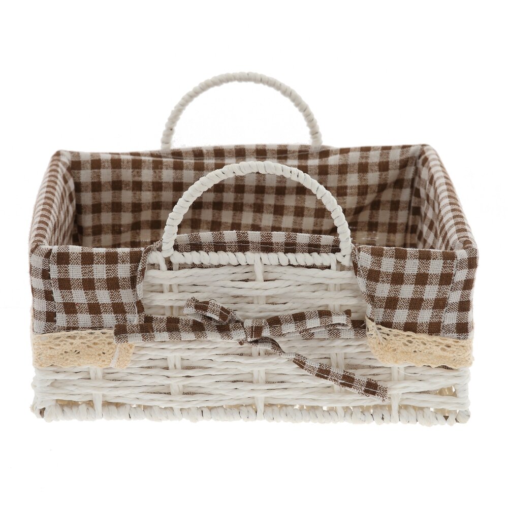 Стильная корзина – практичный и декоративный аксессуар для дома. Основа выполнена из прочного светлого плетения. Внутри – текстильный чехол в коричнево-белую клетку, который легко вынимается и стирается при необходимости. Две удобные ручки позволяют без труда переносить корзину. Изделие идеально подходит для хранения косметики, мелких аксессуаров, рукоделия, чайных пакетиков, сладостей или хлебобулочных изделий на кухне. Корзина компактна, не занимает много места на полке или столе и одновременно служит уютным элементом декора, подчеркивающим атмосферу кухни, гостиной, спальни или дачного домика.