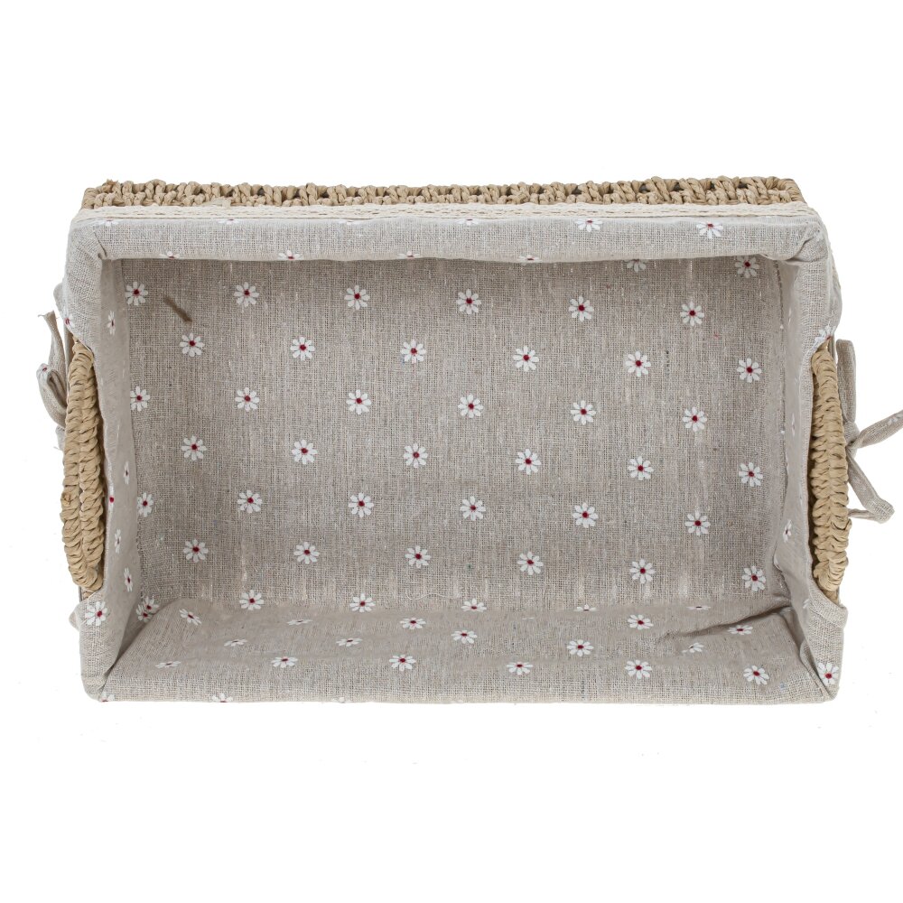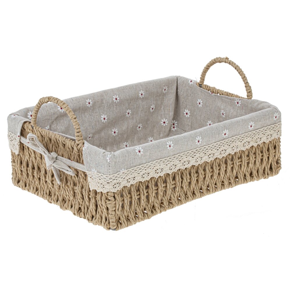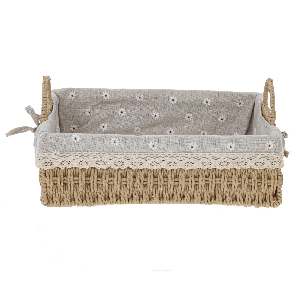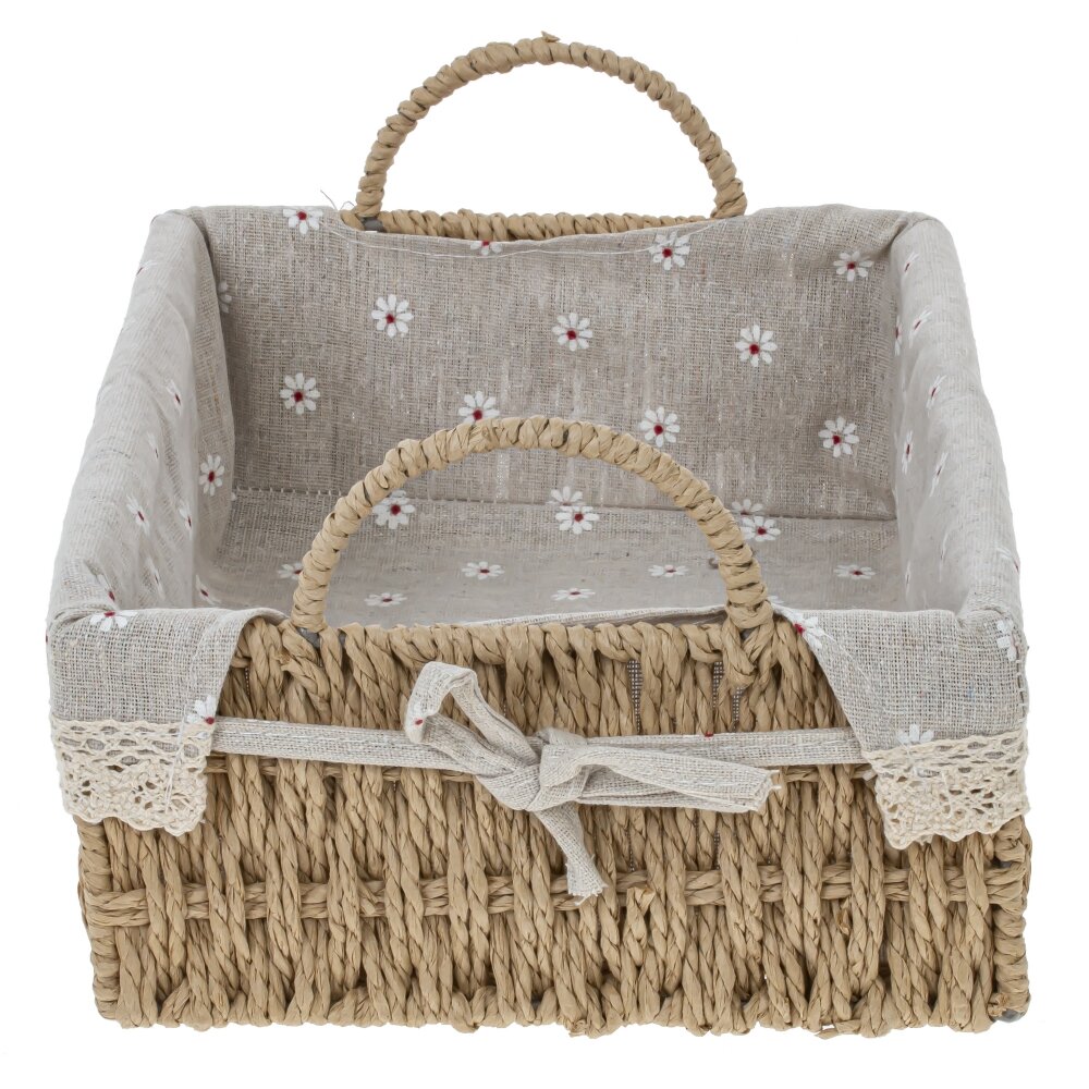 Элегантная корзина из натуральных материалов для уютного дома. Основание выполнено с аккуратным ручным плетением; форму стабилизирует скрытый металлический каркас , благодаря чему корзина не деформируется при нагрузке. Внутри — съемный текстильный чехол с мелким цветочным рисунком и кружевной отделкой; завязки по бокам позволяют надежно фиксировать его и легко снимать для стирки. Две витые ручки удобны для переноса. Подходит для сервировки хлеба и фруктов, хранения полотенец, косметики или аксессуаров в спальне, ванной и на кухне. Нейтральные оттенки и натуральная фактура подчеркнут стиль прованс, эко или кантри.