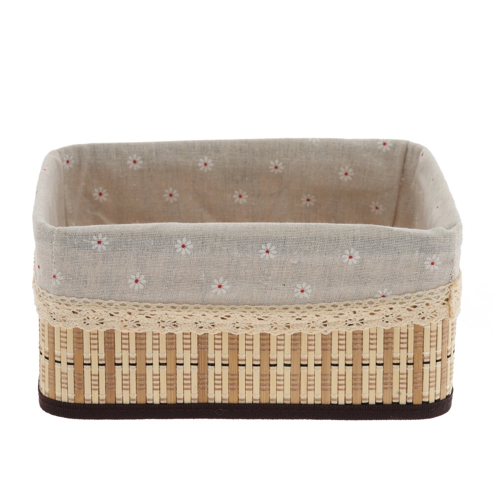 Прямоугольная плетёная корзина с текстильной вставкой – стильное и практичное решение для хранения мелочей в доме. Основание выполнено из прочного натурального материала в бежево?коричневых тонах. Внутри – съёмный тканевый чехол спокойного светло?серого цвета с мелким цветочным принтом, который легко стирать и очищать. Корзина подойдёт для хранения косметики, аксессуаров, канцелярии, кухонных принадлежностей, а также идеально смотрится в ванной, спальне или на полке в прихожей, добавляя интерьеру уют и порядок.