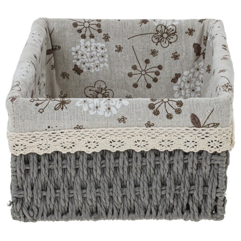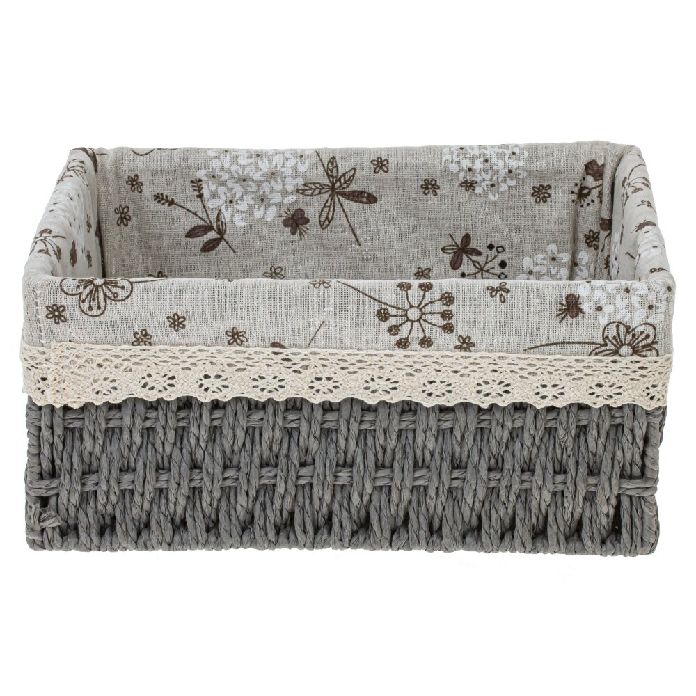Прямоугольная корзина-органайзер. Основание сплетено из натуральных материалов, окрашенных в графитово-серый цвет; плетение плотное, аккуратное. Для жесткости и долговечности внутри предусмотрен тонкий металлический каркас. Внутри — мягкая текстильная вкладка с бежевым фоном и коричневым цветочно-травяным рисунком, верх украшен кремовой кружевной тесьмой. Корзина сочетает натуральное плетение, текстильные материалы и металл, благодаря чему одновременно выглядит уютно и остается прочной. Подходит для хранения белья, косметики, аксессуаров, пряжи или детских вещей, гармонично вписывается в интерьеры в стиле эко, прованс и сканди.