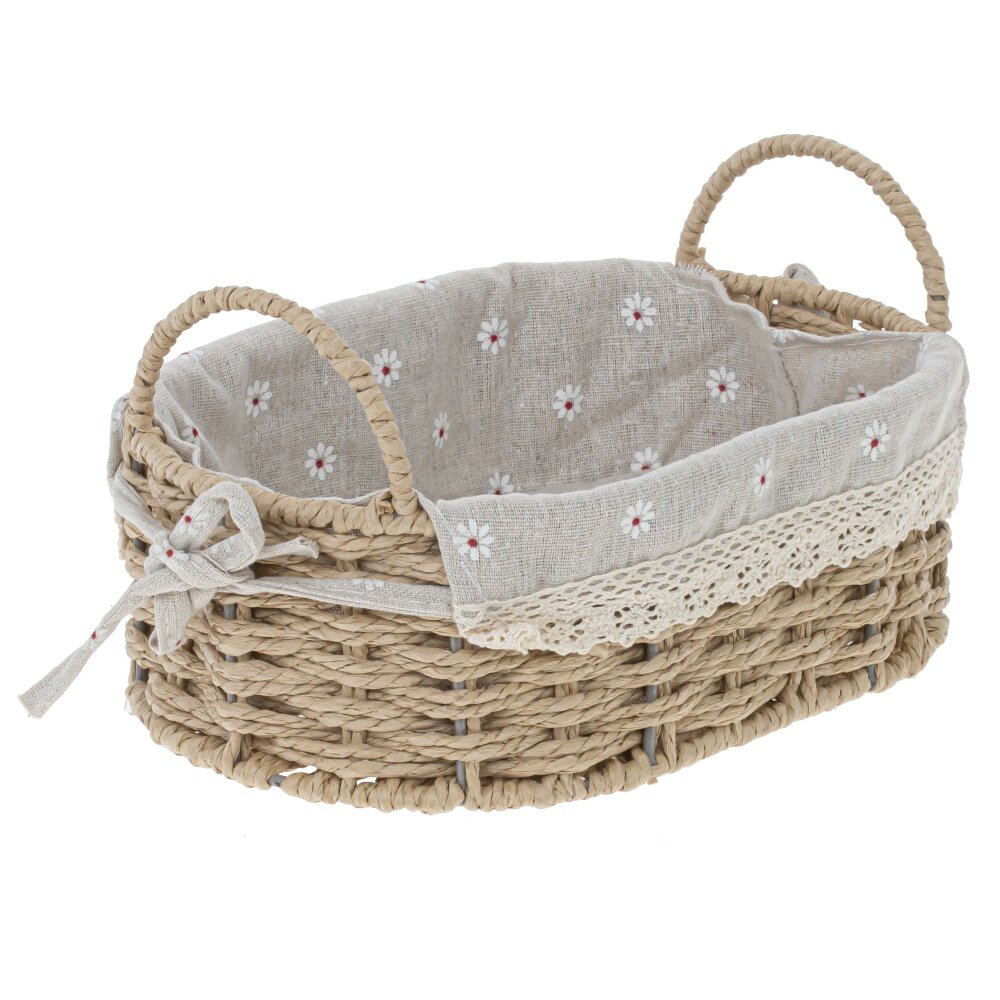 Элегантная корзина из натуральных материалов для уютного дома. Основание выполнено с аккуратным ручным плетением; форму стабилизирует скрытый металлический каркас , благодаря чему корзина не деформируется при нагрузке. Внутри — съемный текстильный чехол с мелким цветочным рисунком и кружевной отделкой; завязки по бокам позволяют надежно фиксировать его и легко снимать для стирки. Две витые ручки удобны для переноса. Подходит для сервировки хлеба и фруктов, хранения полотенец, косметики или аксессуаров в спальне, ванной и на кухне. Нейтральные оттенки и натуральная фактура подчеркнут стиль прованс, эко или кантри.