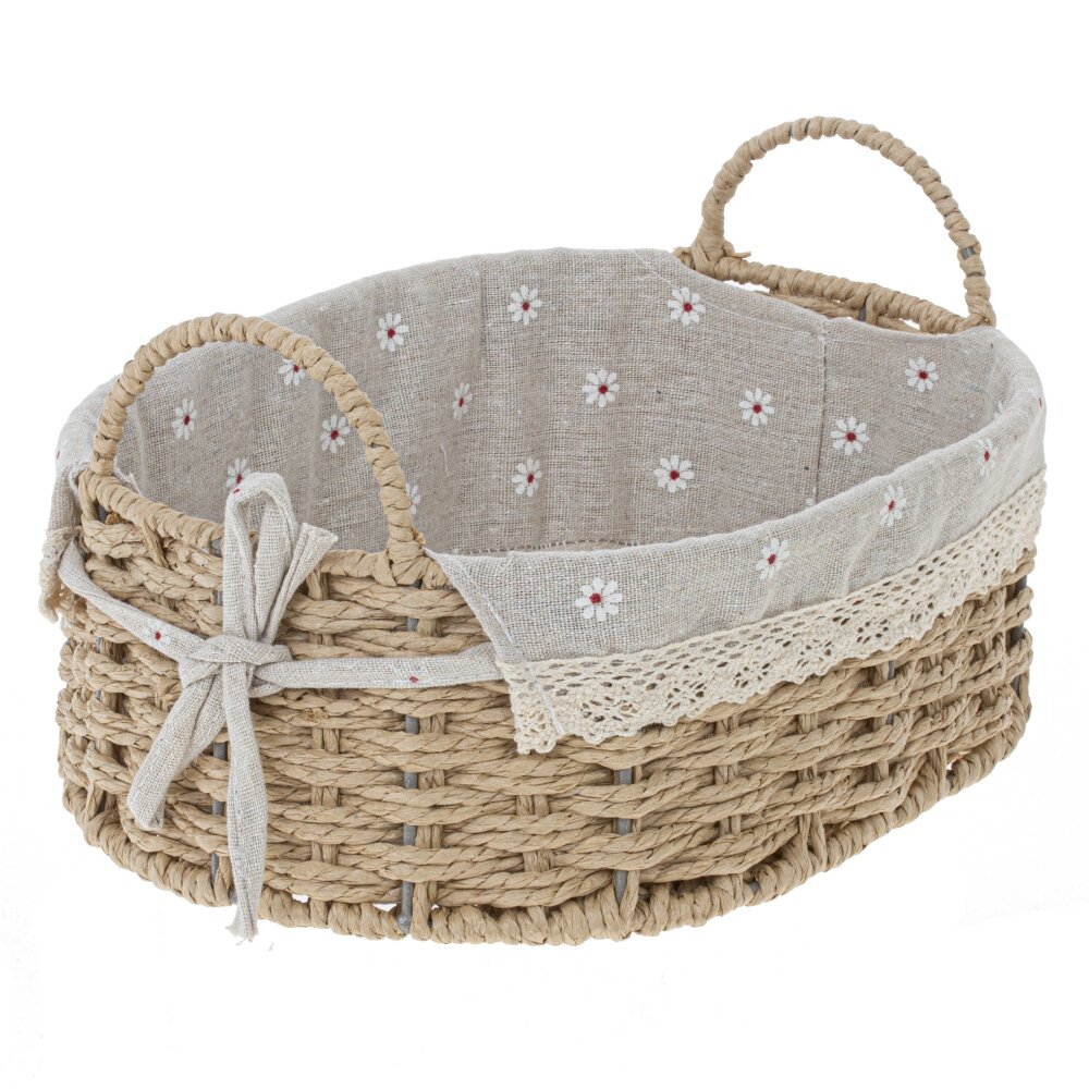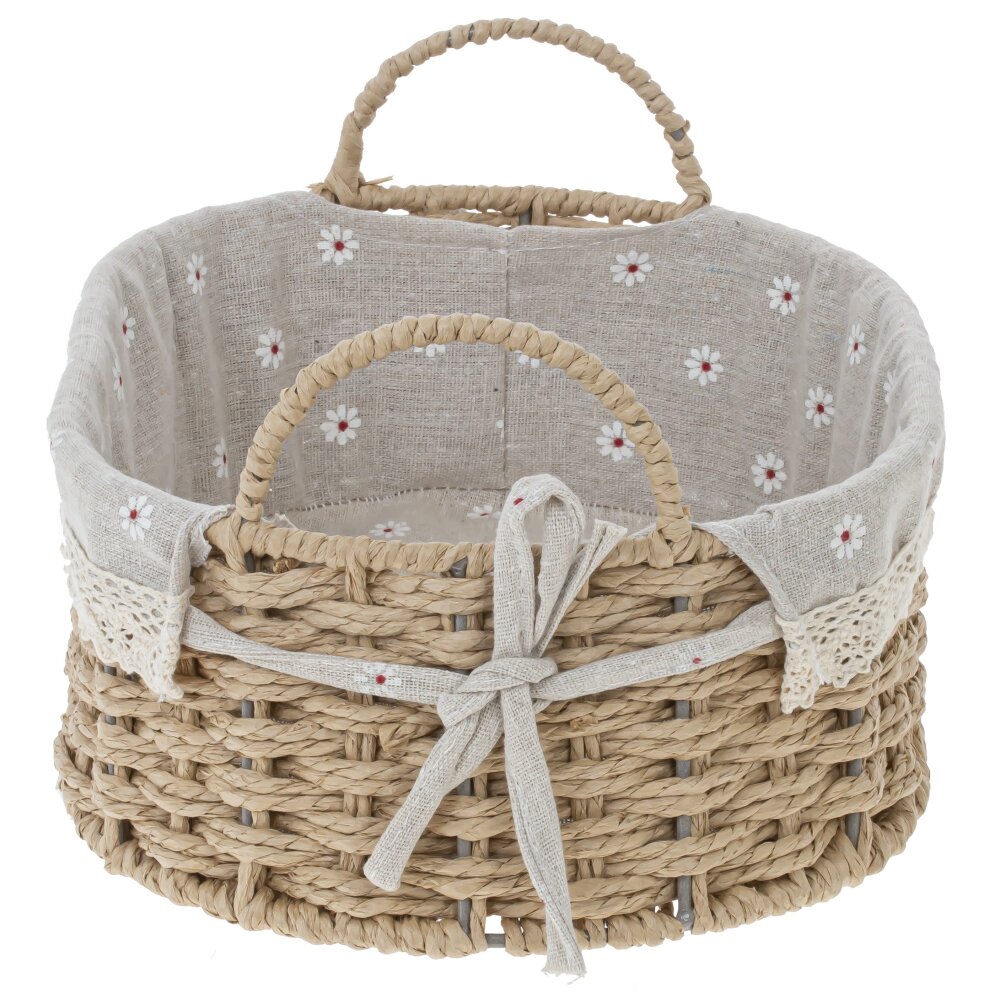Элегантная корзина из натуральных материалов для уютного дома. Основание выполнено с аккуратным ручным плетением; форму стабилизирует скрытый металлический каркас , благодаря чему корзина не деформируется при нагрузке. Внутри — съемный текстильный чехол с мелким цветочным рисунком и кружевной отделкой; завязки по бокам позволяют надежно фиксировать его и легко снимать для стирки. Две витые ручки удобны для переноса. Подходит для сервировки хлеба и фруктов, хранения полотенец, косметики или аксессуаров в спальне, ванной и на кухне. Нейтральные оттенки и натуральная фактура подчеркнут стиль прованс, эко или кантри.