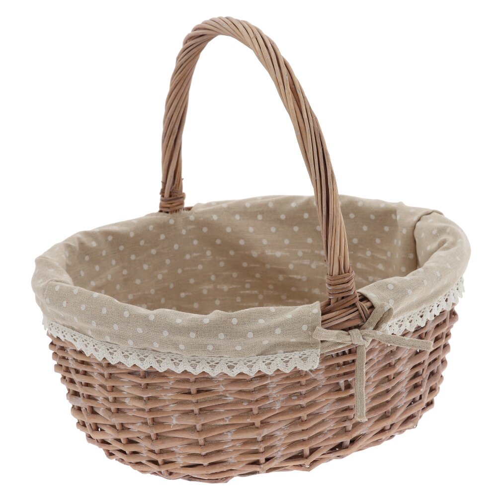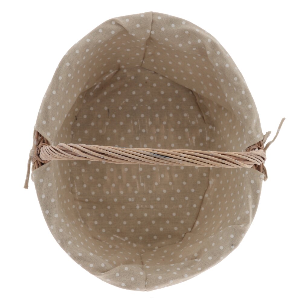 Плетёная корзина с ручкой и текстильной вставкой – стильный и практичный аксессуар для дома и дачи. Основа выполнена из прочной лозы натурального оттенка, аккуратно и плотно сплетённой для надёжности и долговечности. Внутри корзина оформлена съёмным бежевым чехлом из ткани в белый горошек, по краю украшенным ажурным кружевом и бантиком. Такой декор придаёт изделию уютный, деревенский шарм и позволяет использовать корзину не только для хранения мелочей, рукоделия или косметики, но и как красивый элемент сервировки стола, подарочную упаковку или пасхальную корзинку. Лёгкая, удобная и компактная, она гармонично впишется в любой интерьер.