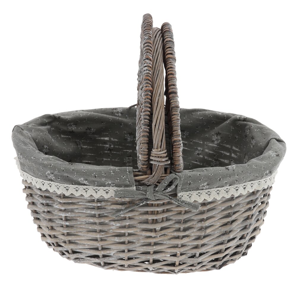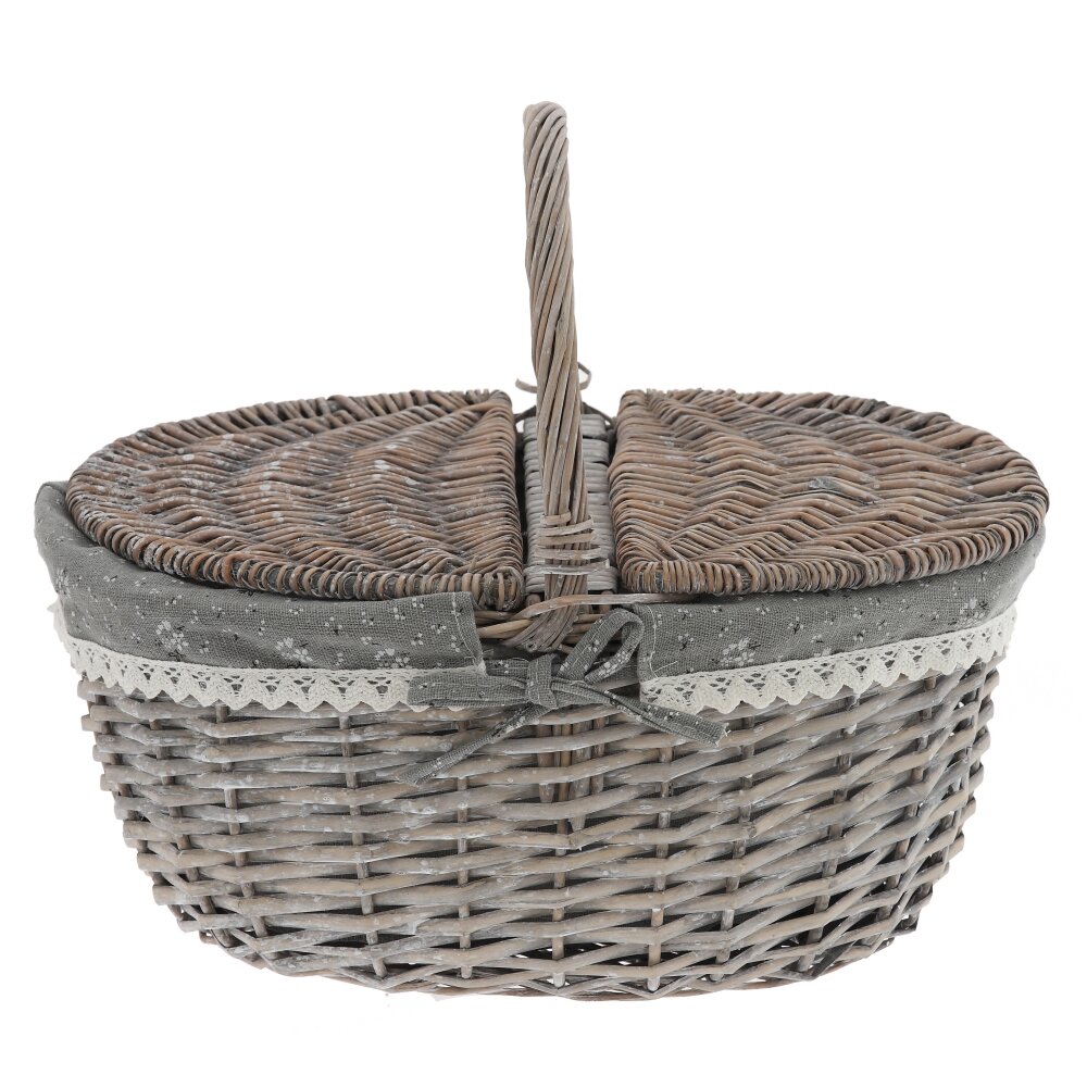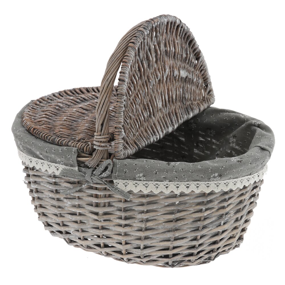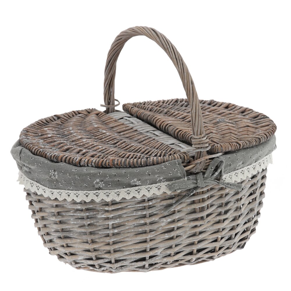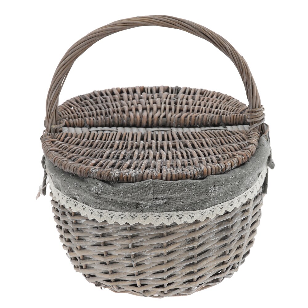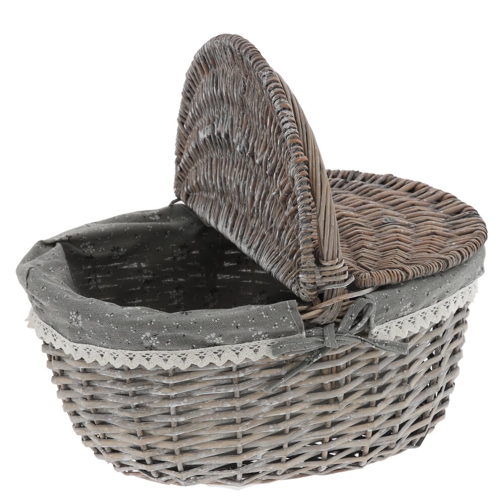 Элегантная плетёная корзина в винтажном стиле – практичный и декоративный аксессуар для вашего дома и отдыха. Корзина выполнена из прочной лозы в благородном серо-коричневом оттенке, оснащена удобной ручкой и двусторонней откидной крышкой, которая надёжно защищает содержимое от пыли и солнечных лучей. Внутри корзина оформлена съёмным чехлом из ткани , по краю украшенным ажурным кружевом и бантиком. Такой декор придаёт изделию уютный, деревенский шарм и позволяет использовать корзину не только для хранения мелочей, рукоделия или косметики, но и как красивый элемент сервировки стола, подарочную упаковку или пасхальную корзинку. Лёгкая, удобная и компактная, она гармонично впишется в любой интерьер.