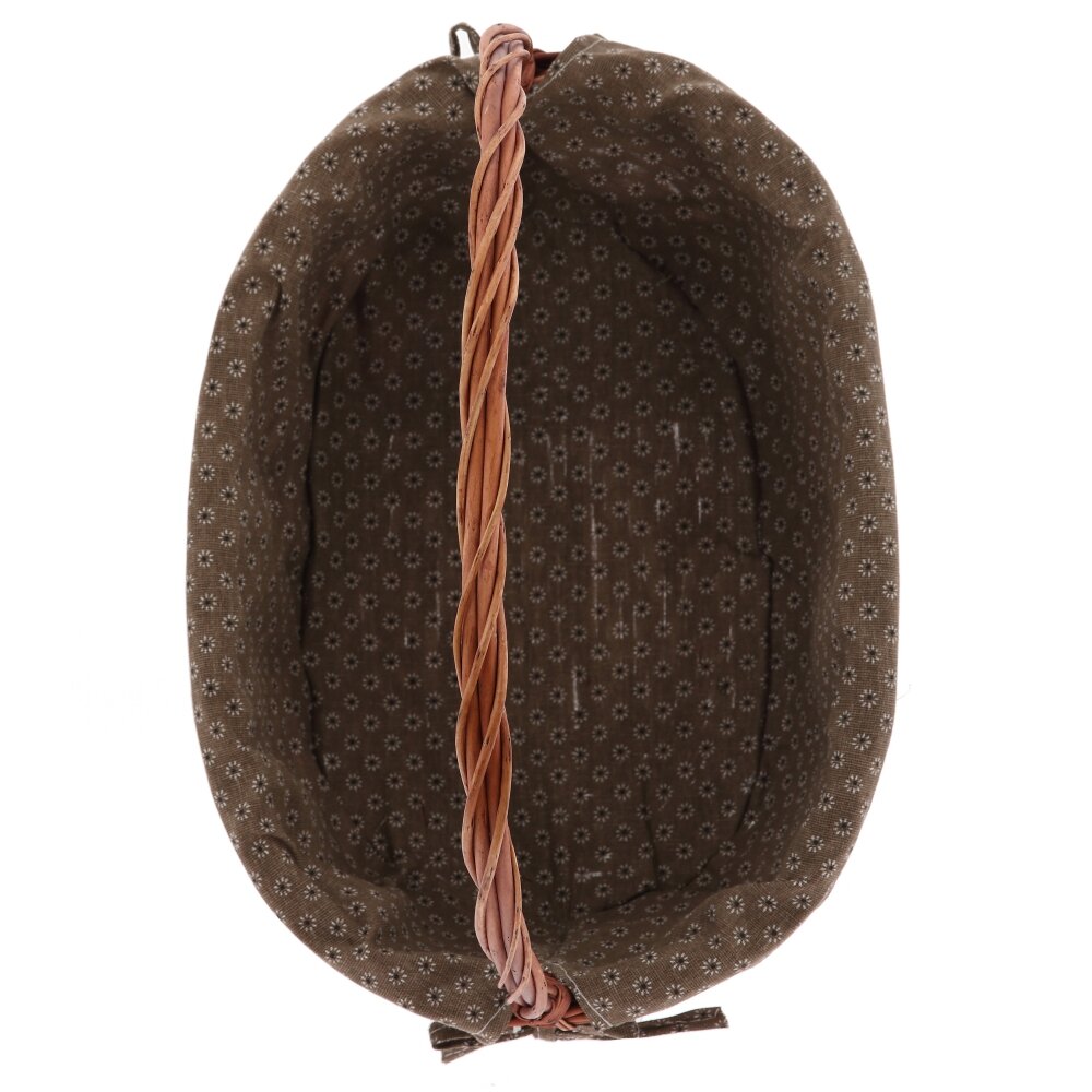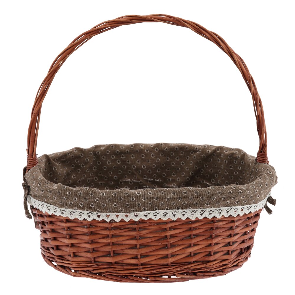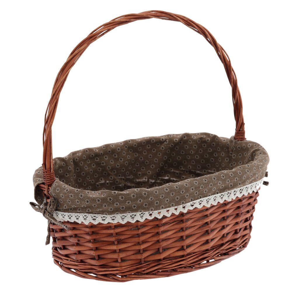 Элегантная плетёная корзина с прочной ручкой – универсальный аксессуар для дома и дачи. Корзина выполнена из натуральной лозы тёплого коричневого оттенка, что придаёт ей уютный, «деревенский» шарм. Внутри она полностью облицована мягкой тканевой вставкой коричневого цвета с мелким цветочным принтом, защищающей продукты и мелкие предметы от повреждений. Верхний край ткани украшен аккуратным кружевом, благодаря чему корзина выглядит особенно нарядно и подойдёт не только для похода за покупками, но и для сервировки стола, пикников, фотосессий, пасхальных и праздничных композиций. Прочная ручка удобно лежит в руке и выдерживает повседневные нагрузки. Такая корзина станет практичным и стильным элементом интерьера или приятным подарком для ценителей натуральных материалов.