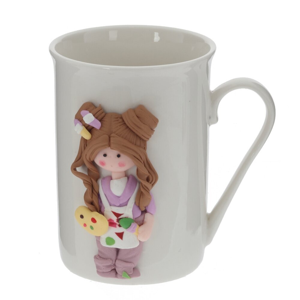 Оригинальная кружка объёмом 340 мл из качественного фарфора станет милым акцентом на вашем столе и отличным подарком для детей и взрослых. Фронтальная часть украшена объёмной фигуркой девочки?художницы из полимерных материалов: проработанные пряди волос, одежда и аксессуары создают эффект ручной лепки и делают каждую кружку особенной. Гладкая белая поверхность подчёркивает яркий декор, удобная изящная ручка обеспечивает комфортное удержание. Идеальна для чая, кофе, какао или горячего шоколада, подходит для домашнего использования и украшения интерьера.