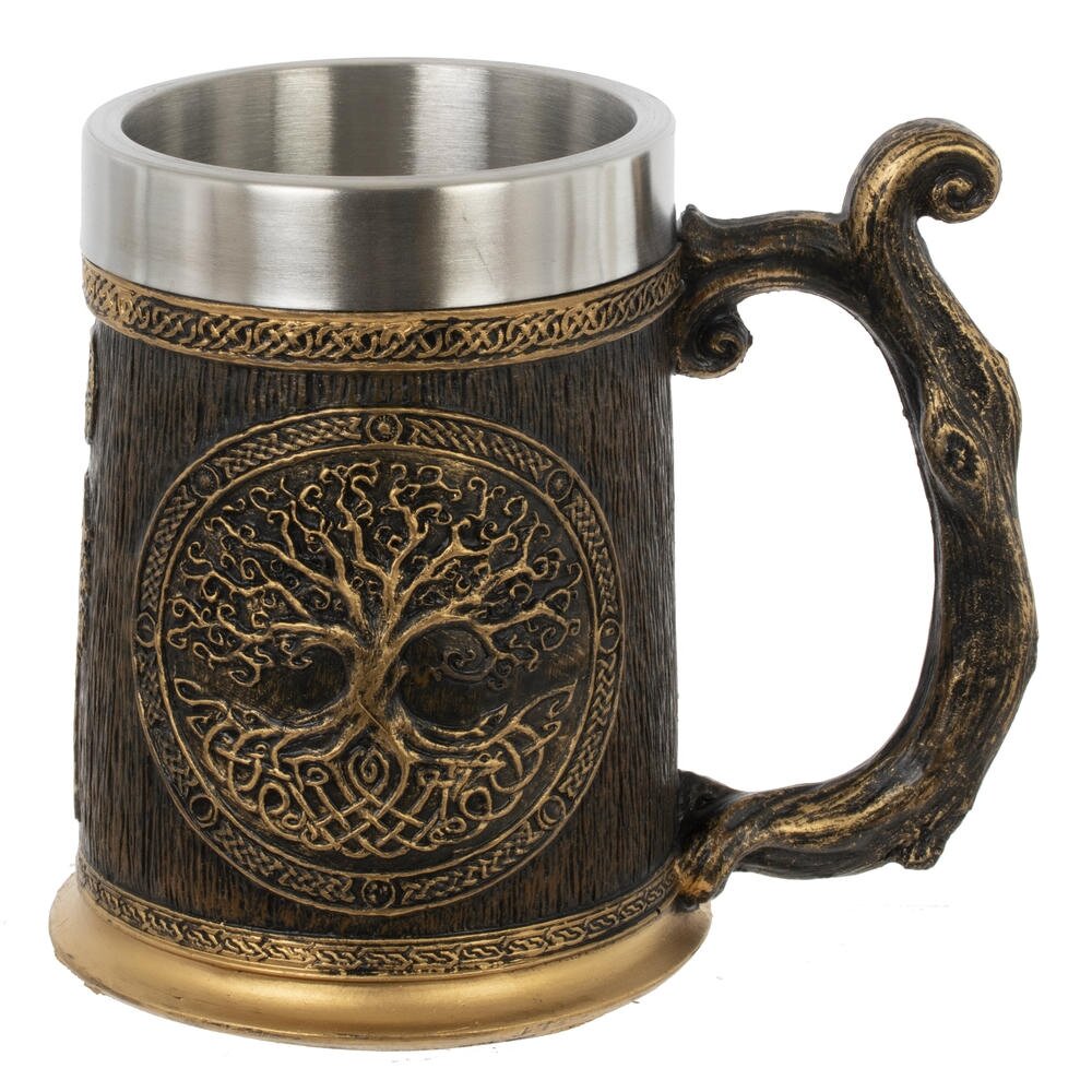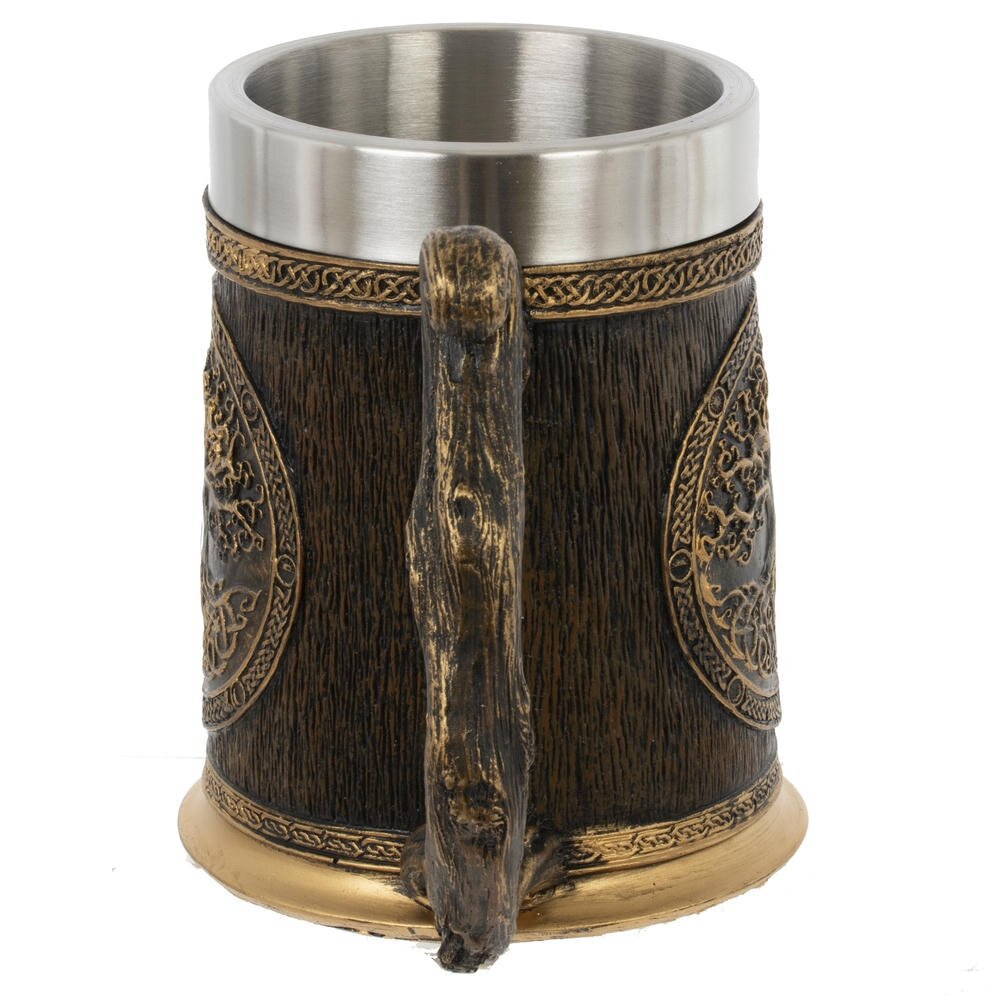Оригинальная кружка объёмом 550 мл в стиле средневекового кубка станет ярким акцентом на вашем столе. Внутренняя часть выполнена из нержавеющей стали, что позволяет долго сохранять температуру напитка и облегчает уход. Снаружи кружка декорирована фактурой под тёмное дерево и объёмным барельефом с изображением Древа жизни, обрамлённым кельтским орнаментом. Фигурная ручка с благородным «под старую бронзу» покрытием удобно ложится в руку и подчёркивает атмосферу фэнтези или викинг-стиля. Подходит для пива, кваса, чая и других напитков, станет отличным подарком коллекционерам и любителям необычной посуды.