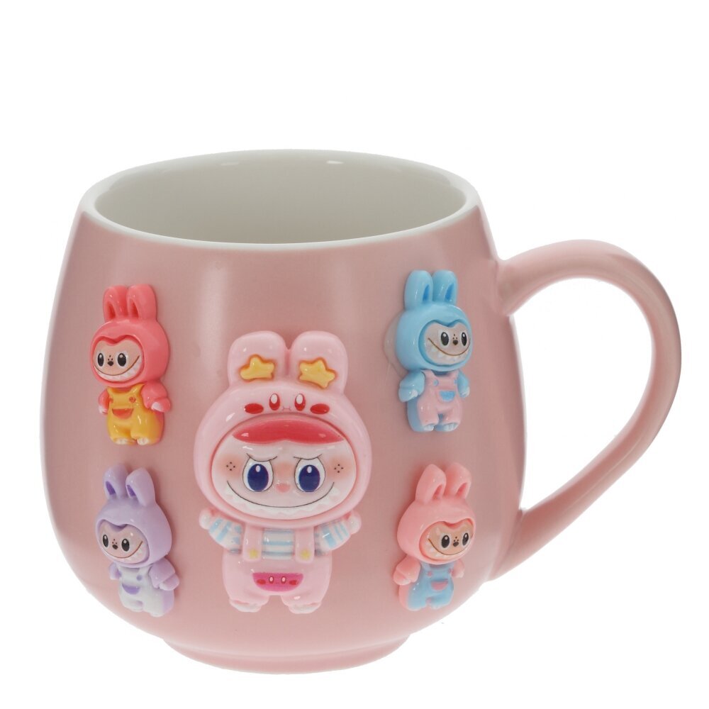 Очаровательная кружка объёмом 340 мл станет любимой посудой ребёнка и поднимет настроение взрослым. Изготовлена из гладкого прочного фарфора, внутри – классическая белая поверхность, удобная для ежедневного использования. Снаружи кружка покрыта нежно?розовой глазурью и украшена объёмным декором из полимерных материалов: забавные персонажи в ярких костюмчиках с ушками создают эффект 3D и приятно ощутимы на ощупь. Удобная округлая форма и эргономичная ручка подходят для детских рук, кружку комфортно держать даже с горячим напитком. Идеальный вариант для чая, какао или молока, а также милый подарок к любому празднику.