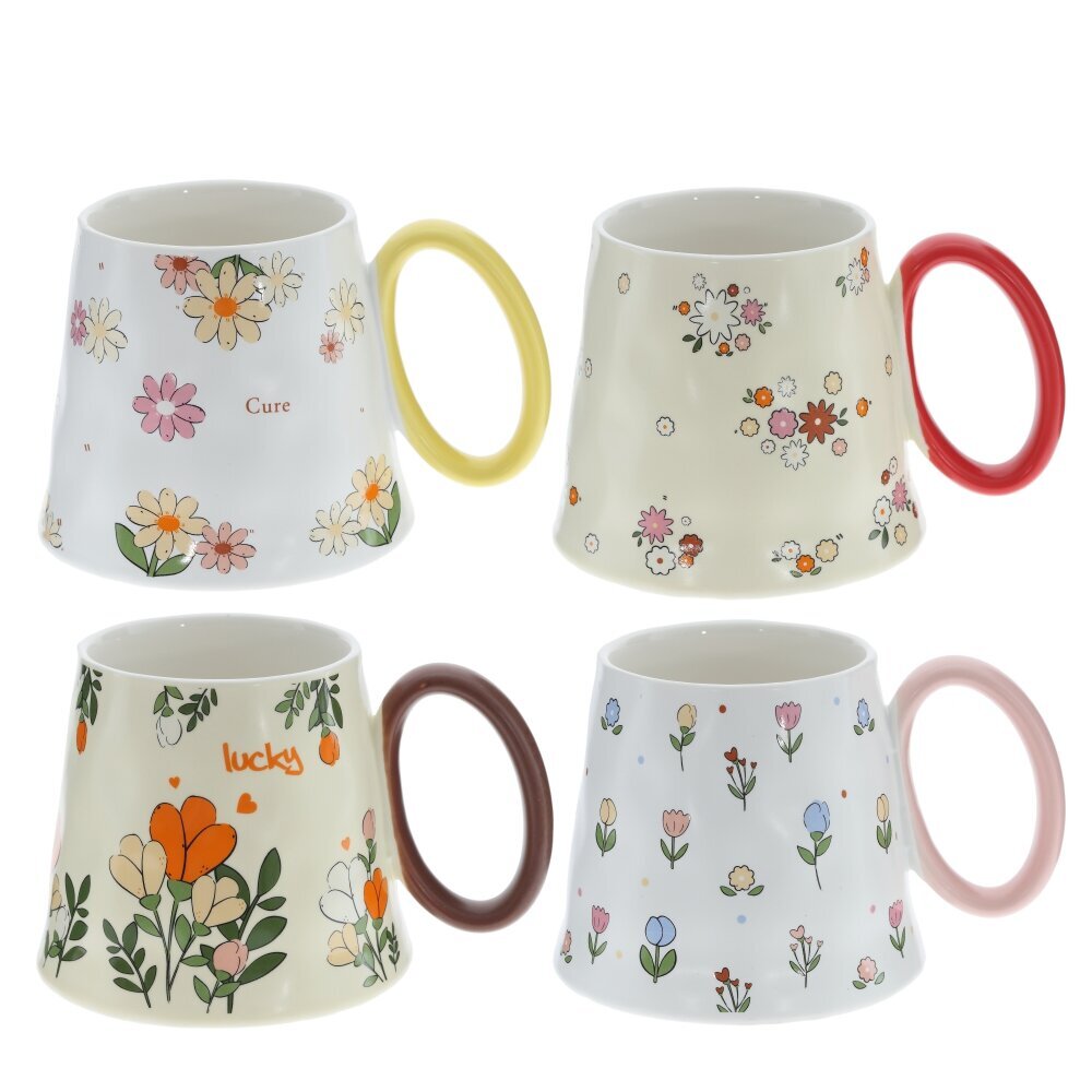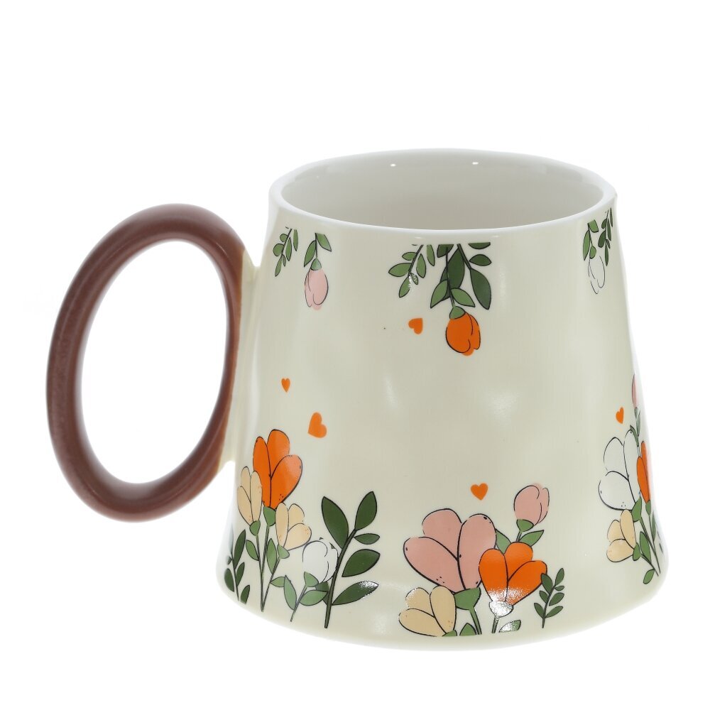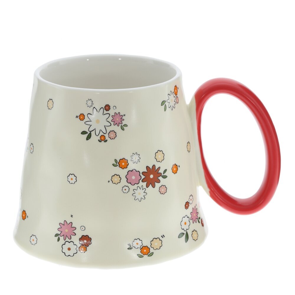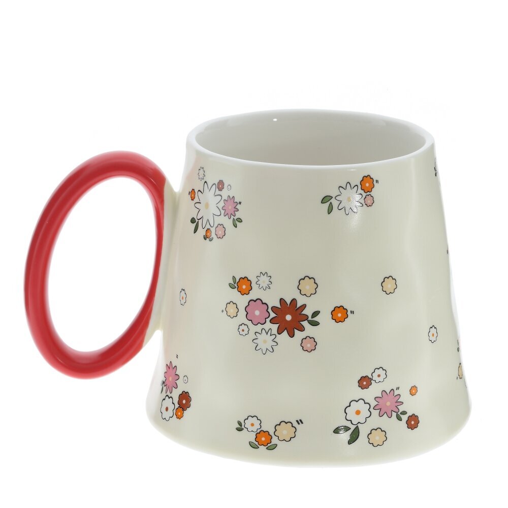 Кружка из фарфора объемом 350 мл с нежно?кремовой поверхностью, украшенной мелкими цветами в белых, розовых и оранжевых тонах. Корпус расширяется к низу и имеет мягко волнистый силуэт, создавая эффект изделия ручной работы; широкое основание добавляет устойчивости. Глянцевая глазурь легко отмывается и приятно блестит. Крупная округлая ручка окрашена в ярко?красный цвет и удобна для захвата. Кружка подойдет для чая, кофе, какао, станет милым акцентом на кухне и симпатичным подарком. Представлено в четырех вариантах.