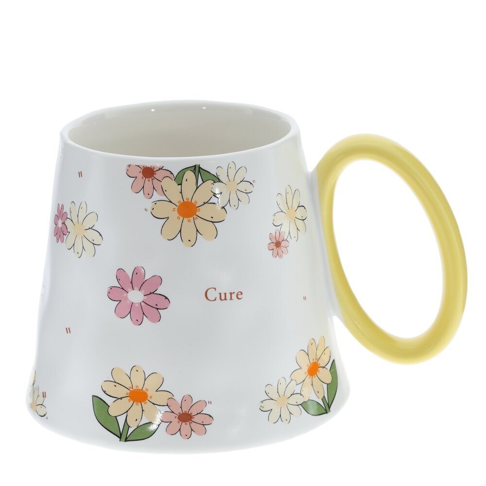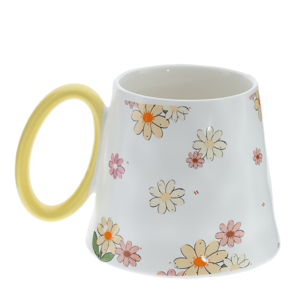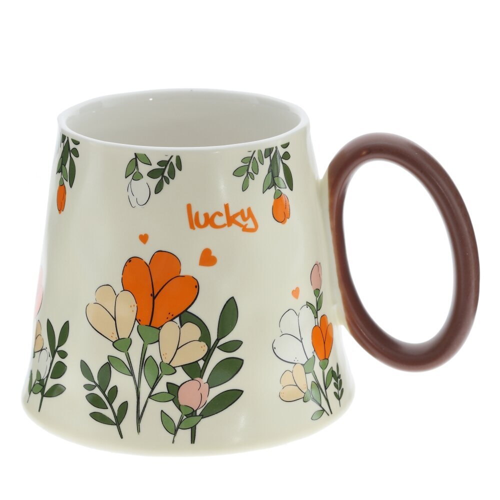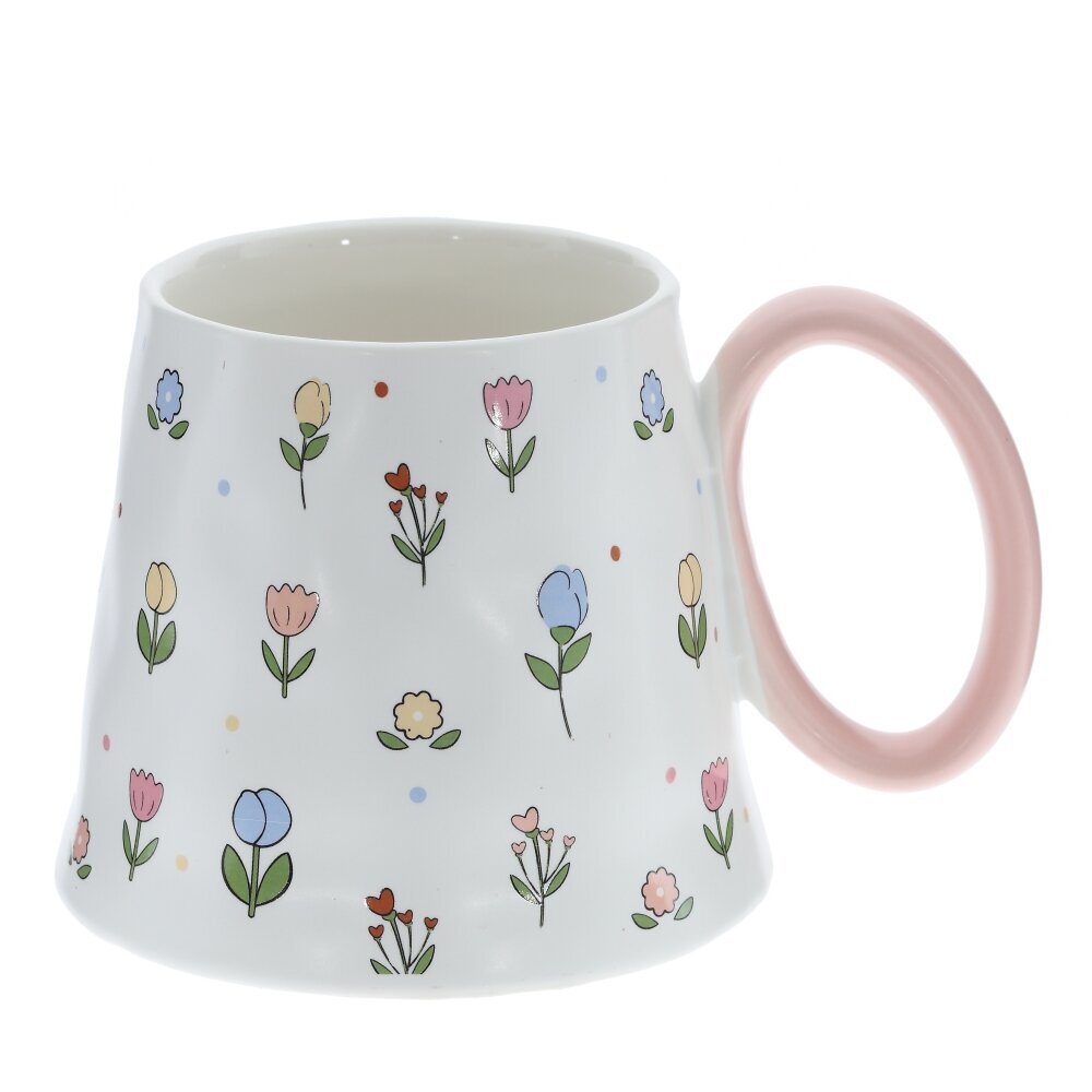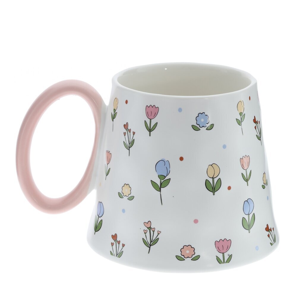 Кружка из фарфора объемом 350 мл с нежно?кремовой поверхностью, украшенной мелкими цветами в белых, розовых и оранжевых тонах. Корпус расширяется к низу и имеет мягко волнистый силуэт, создавая эффект изделия ручной работы; широкое основание добавляет устойчивости. Глянцевая глазурь легко отмывается и приятно блестит. Крупная округлая ручка окрашена в ярко?красный цвет и удобна для захвата. Кружка подойдет для чая, кофе, какао, станет милым акцентом на кухне и симпатичным подарком. Представлено в четырех вариантах.