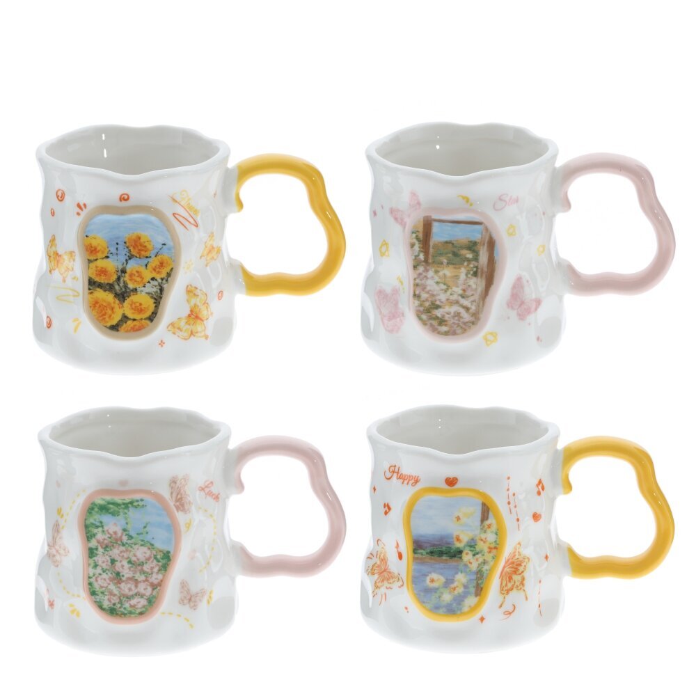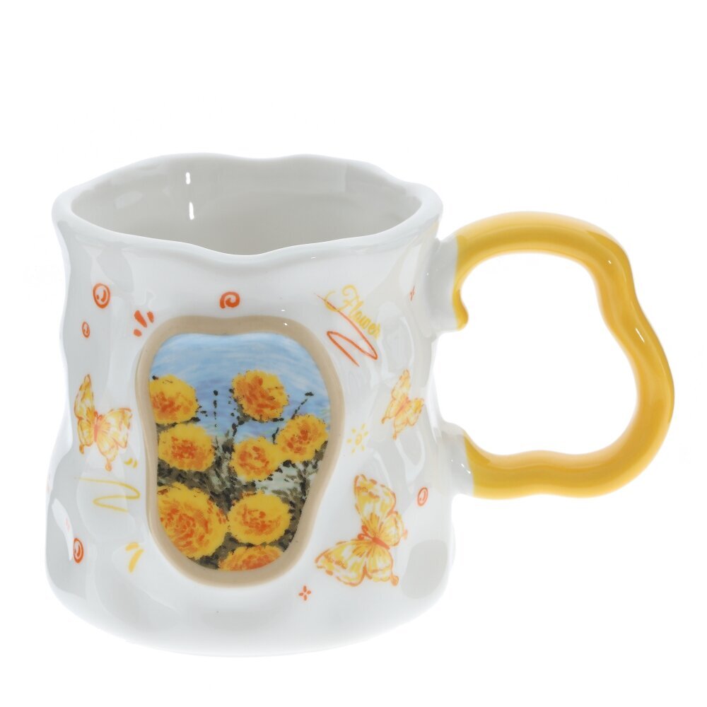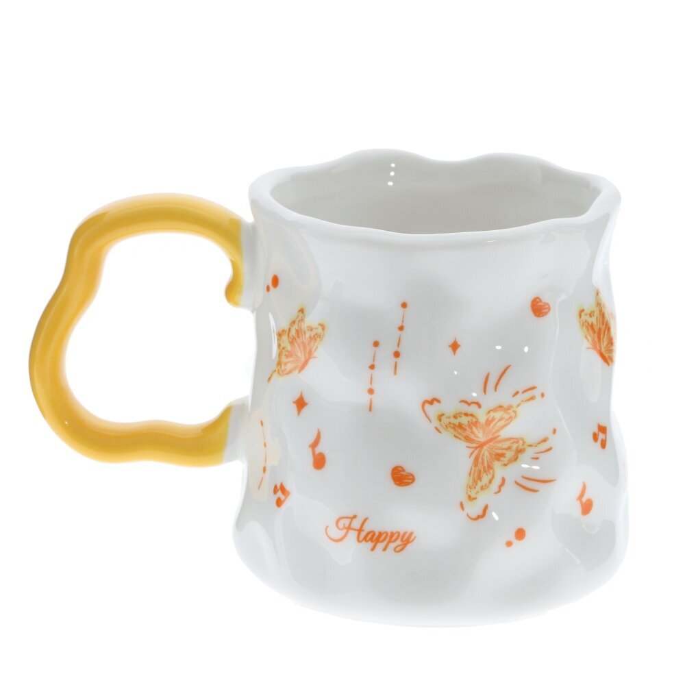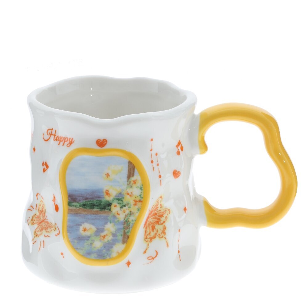 Красивая фарфоровая кружка объёмом 350 мл для чая, кофе или какао. Белоснежное глянцевое покрытие украшено жёлто?оранжевым декором: бабочки, нотки, сердечки и надпись Happy. В центре — картинка с цветами и пейзажем в мягкой жёлтой рамке. Форма корпуса слегка волнистая, что придаёт изделию игривый, «ручной» характер. Ручка ярко?жёлтая, фигурная, удобна для захвата. Толстые стенки хорошо держат тепло, пить приятно. Кружка станет милым акцентом на кухне и подойдёт в подарок тем, кто любит уютные и нарядные вещи. представлено в четырех вариантах.