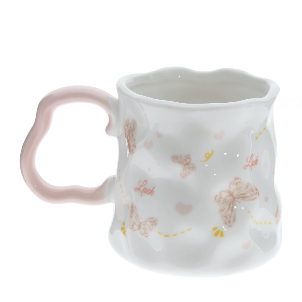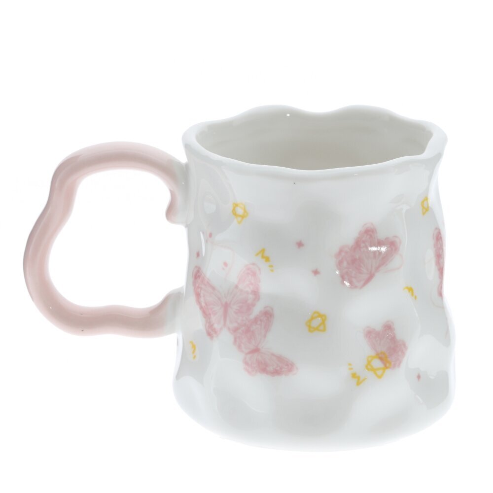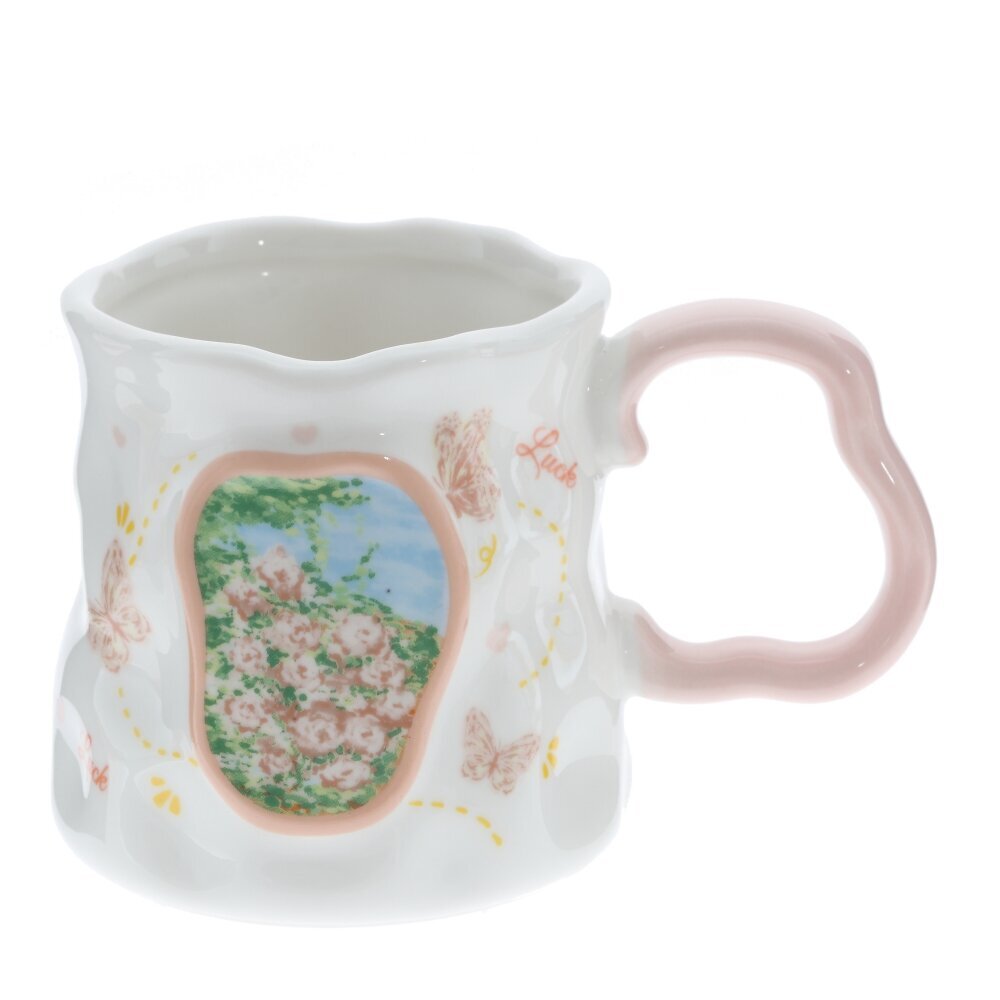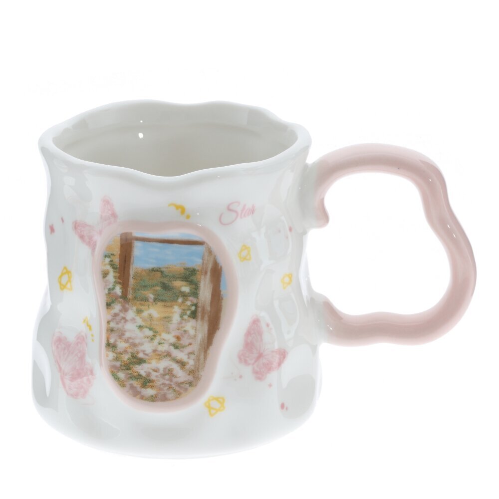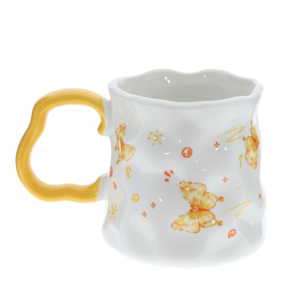 Красивая фарфоровая кружка объёмом 350 мл для чая, кофе или какао. Белоснежное глянцевое покрытие украшено жёлто?оранжевым декором: бабочки, нотки, сердечки и надпись Happy. В центре — картинка с цветами и пейзажем в мягкой жёлтой рамке. Форма корпуса слегка волнистая, что придаёт изделию игривый, «ручной» характер. Ручка ярко?жёлтая, фигурная, удобна для захвата. Толстые стенки хорошо держат тепло, пить приятно. Кружка станет милым акцентом на кухне и подойдёт в подарок тем, кто любит уютные и нарядные вещи. представлено в четырех вариантах.