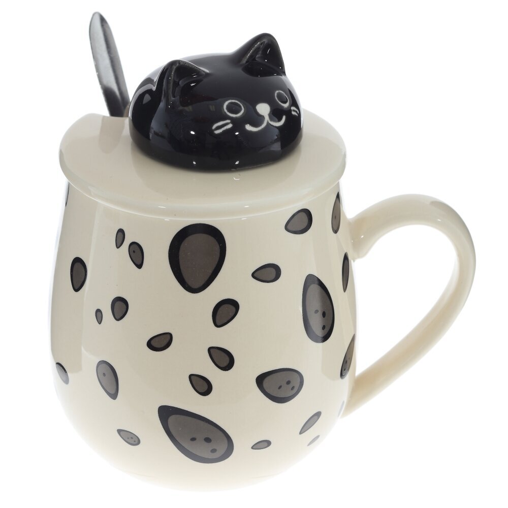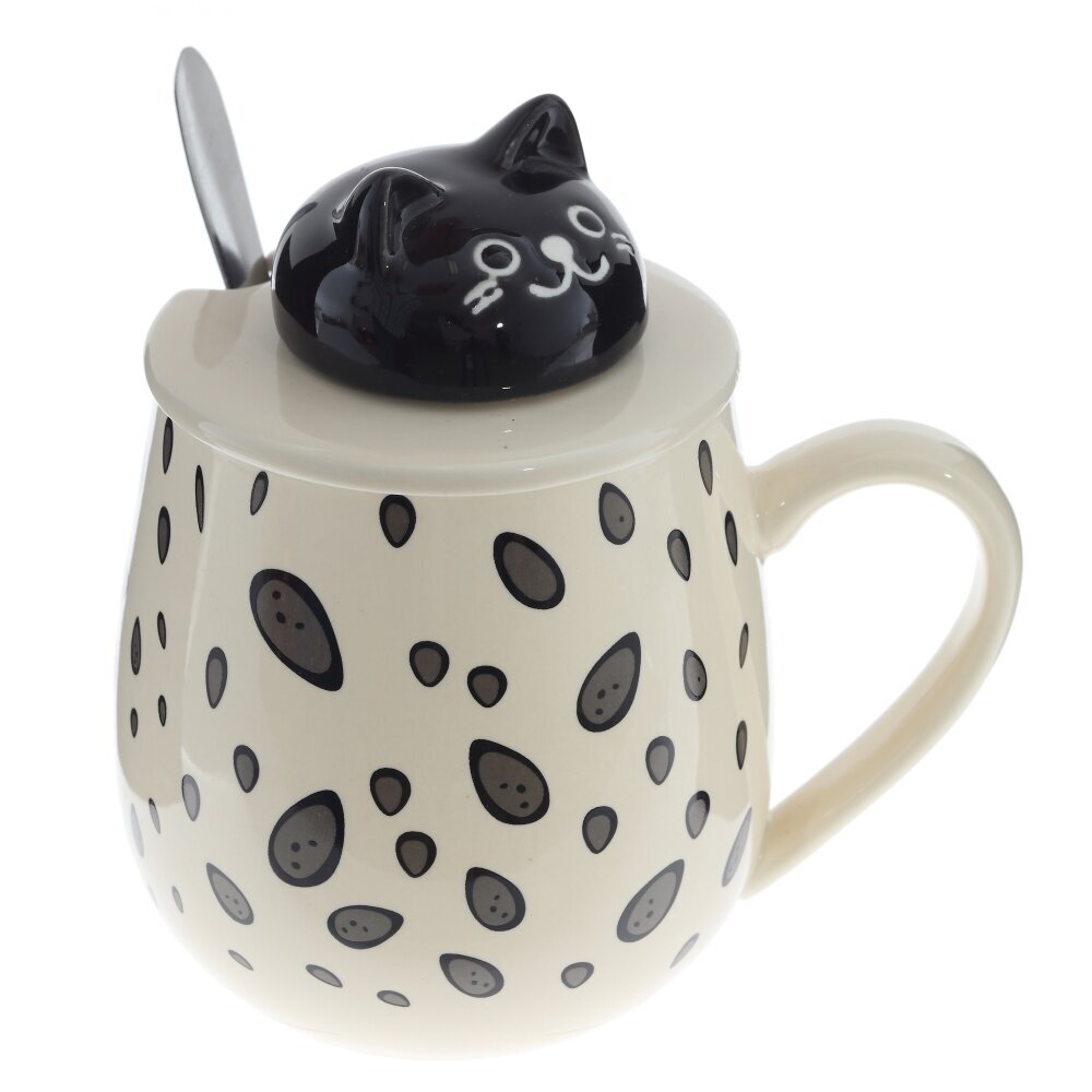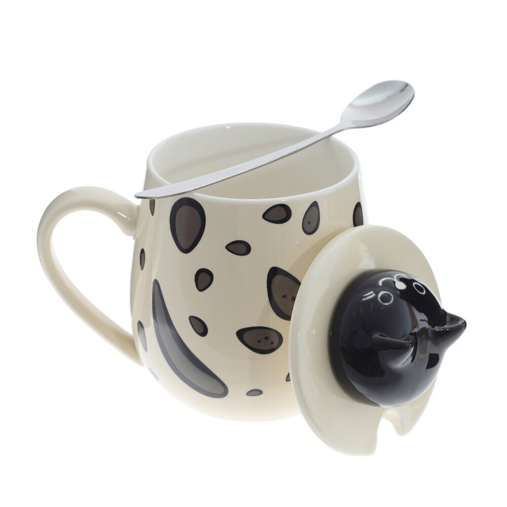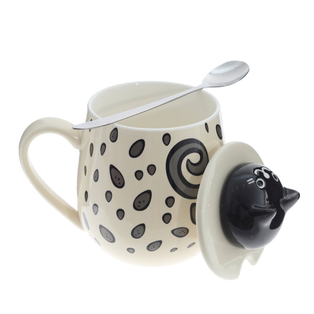 Очаровательная кружка объемом 350 мл с крышкой и ложкой. Корпус из гладкого фарфора кремового оттенка украшён игривым принтом из тёмных «капелек». На крышке — ручка?фигурка котика, за которую легко поднимать крышку; прорезь позволяет хранить ложку внутри. Ложка выполнена из коррозионностойкой стали. Крышка помогает дольше сохранять напиток горячим и защищает от пыли, а округлая форма и широкая ручка делают кружку удобной для ежедневного использования дома и в офисе. Идеальна для чая, кофе или какао и станет милым подарком любителям котиков и стильной посуды. представлено в четырех вариантах.