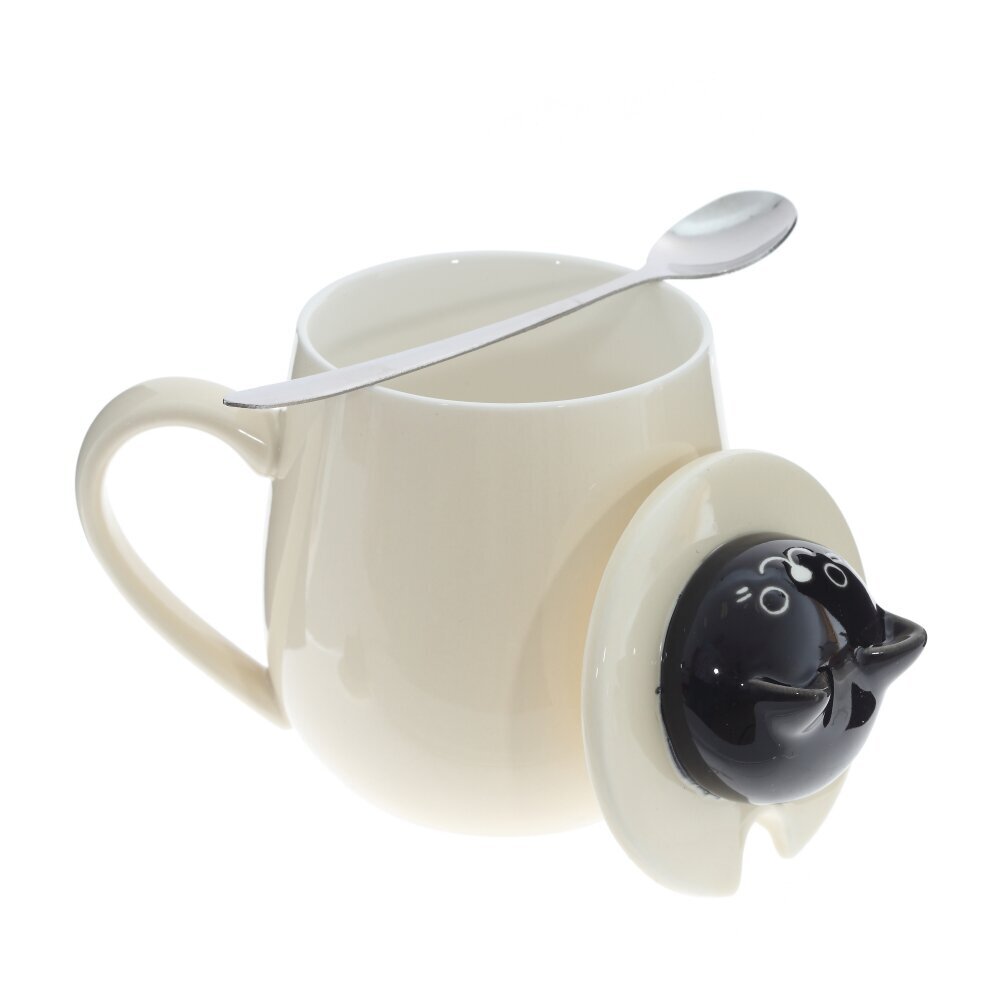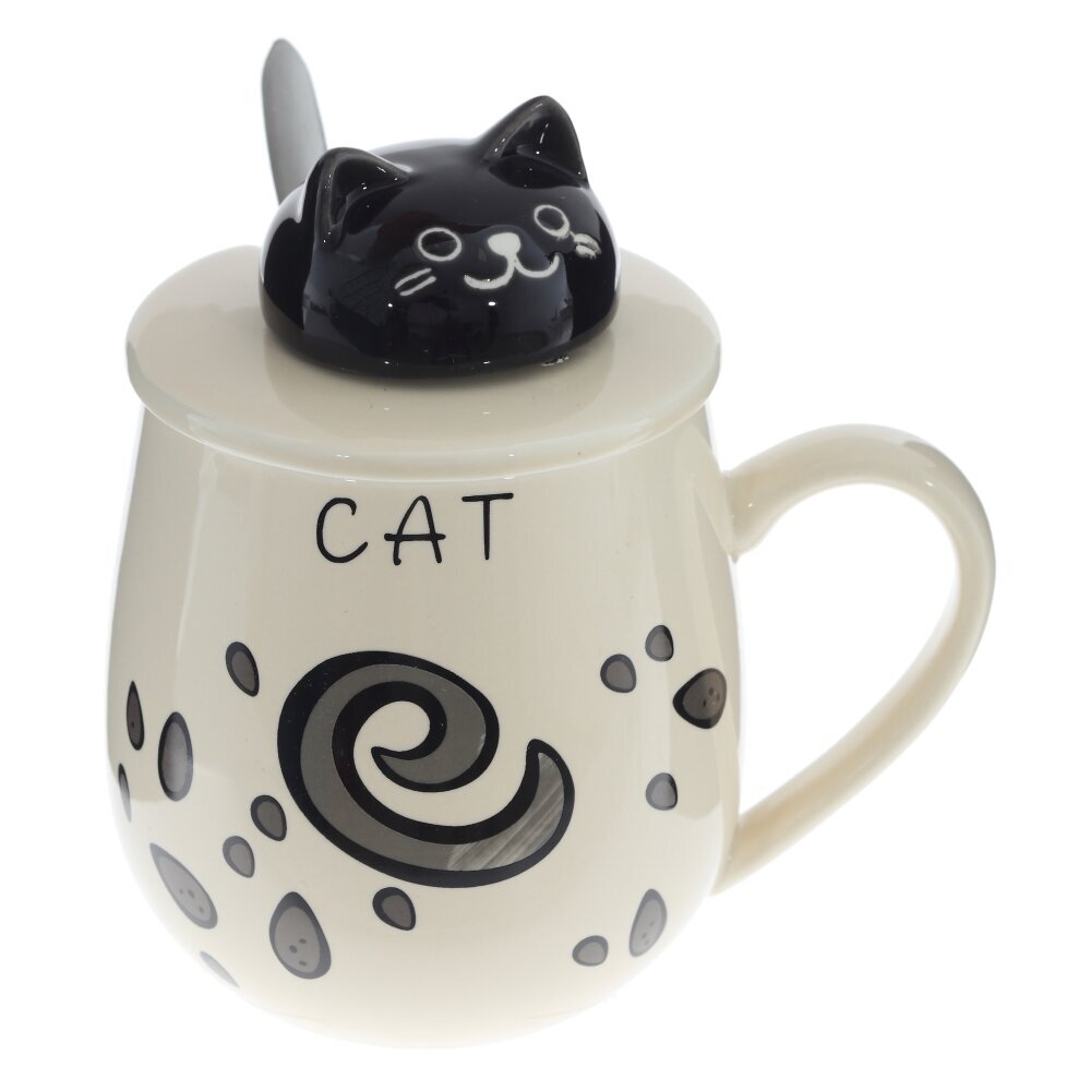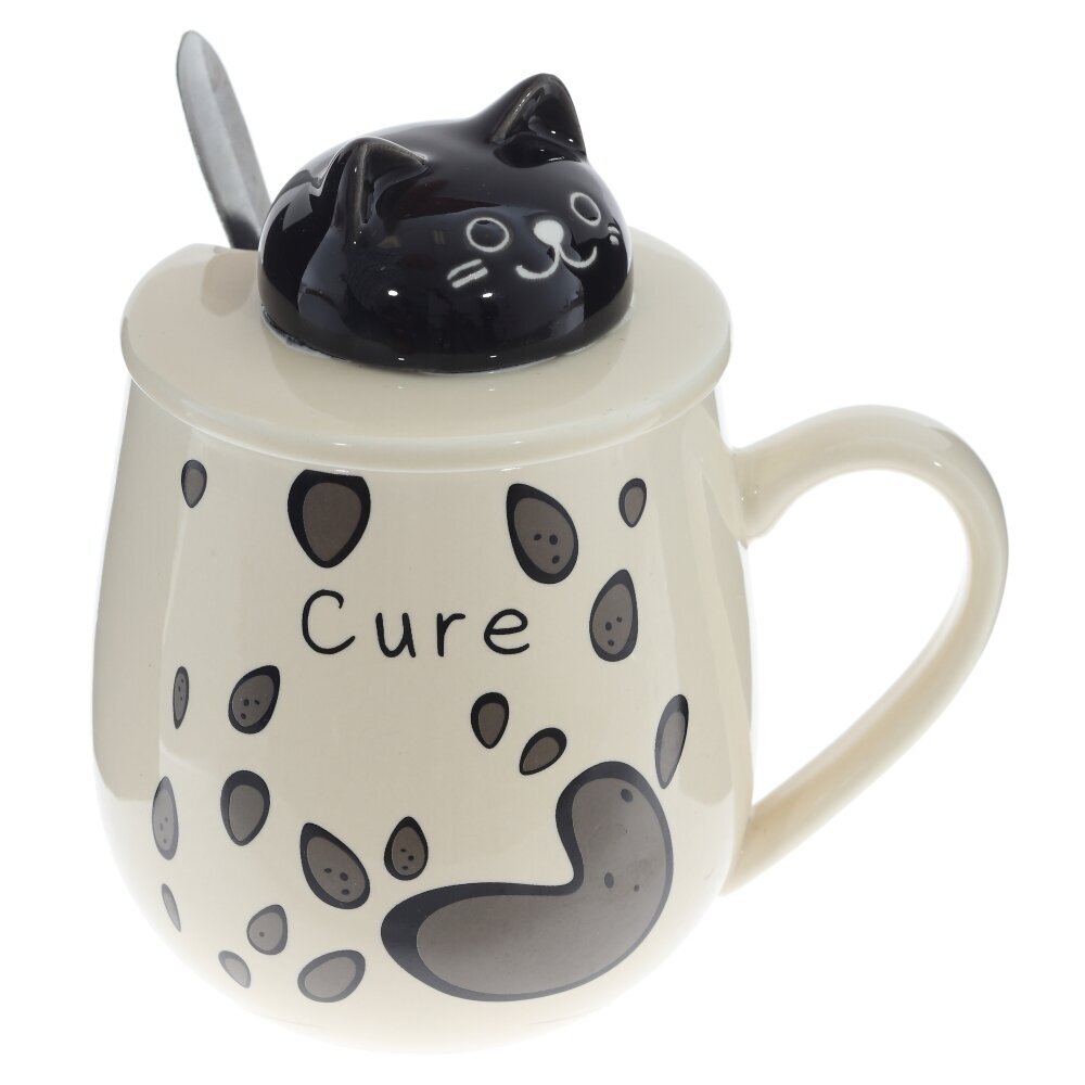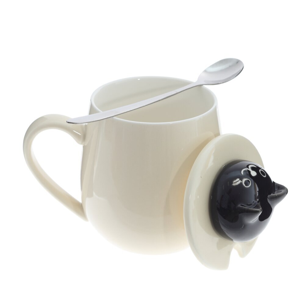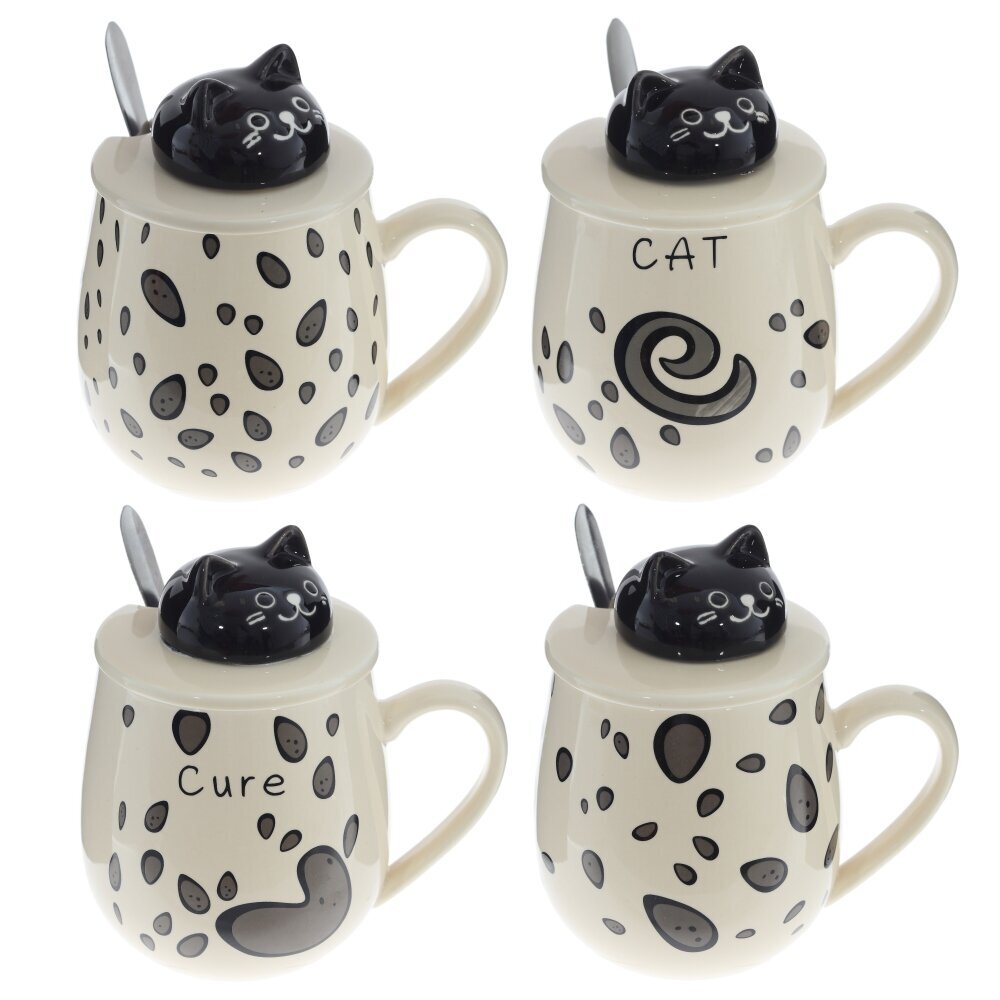 Очаровательная кружка объемом 350 мл с крышкой и ложкой. Корпус из гладкого фарфора кремового оттенка украшён игривым принтом из тёмных «капелек». На крышке — ручка?фигурка котика, за которую легко поднимать крышку; прорезь позволяет хранить ложку внутри. Ложка выполнена из коррозионностойкой стали. Крышка помогает дольше сохранять напиток горячим и защищает от пыли, а округлая форма и широкая ручка делают кружку удобной для ежедневного использования дома и в офисе. Идеальна для чая, кофе или какао и станет милым подарком любителям котиков и стильной посуды. представлено в четырех вариантах.