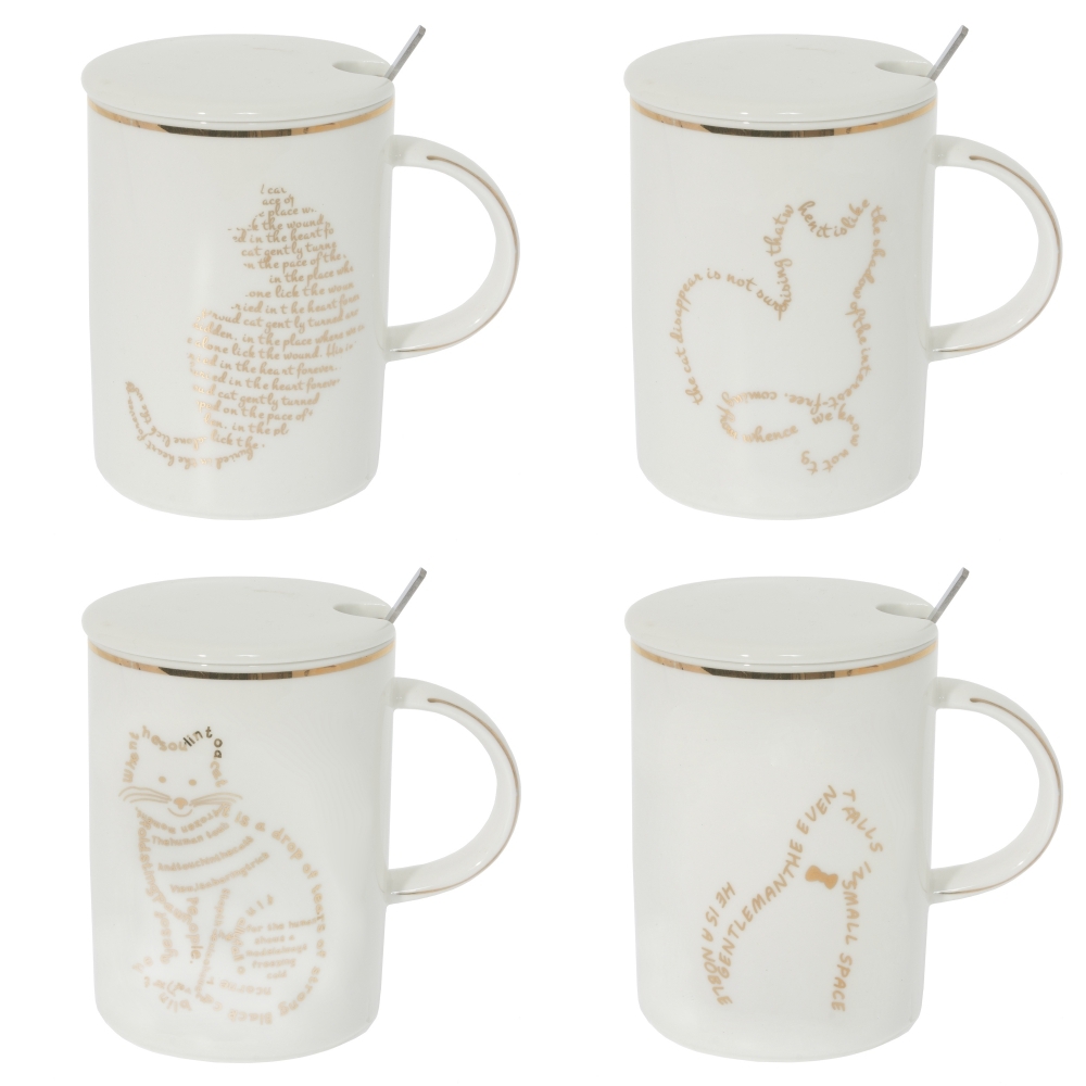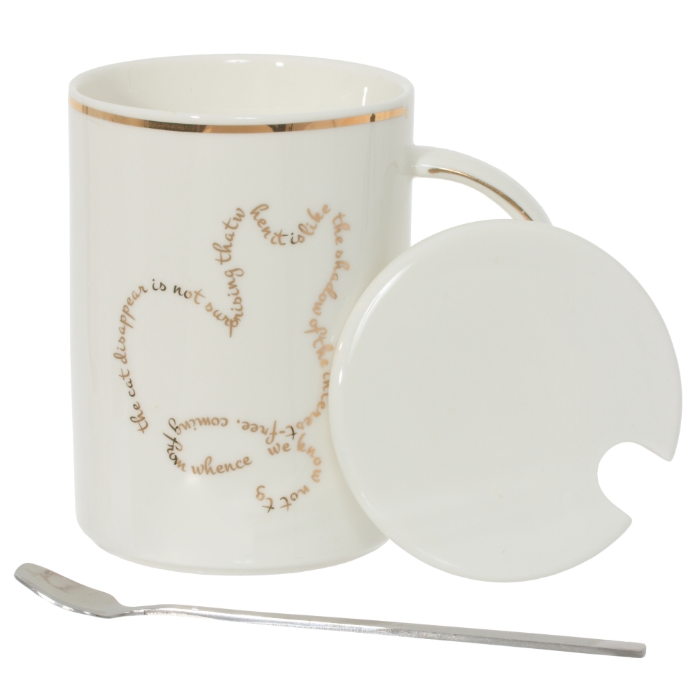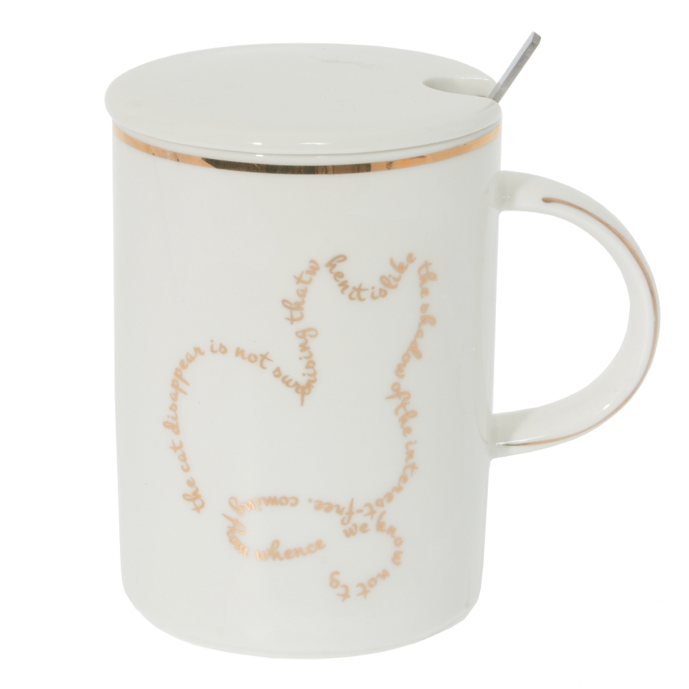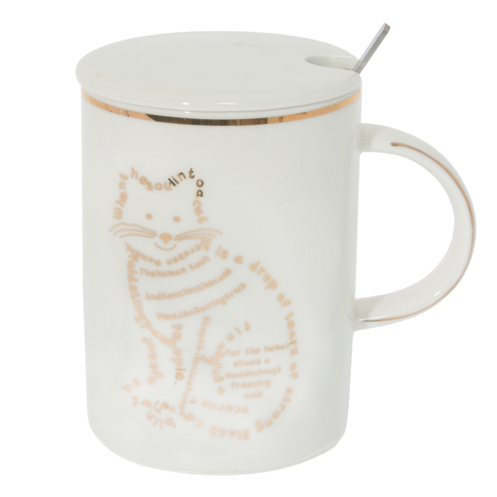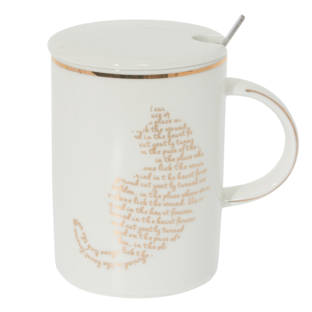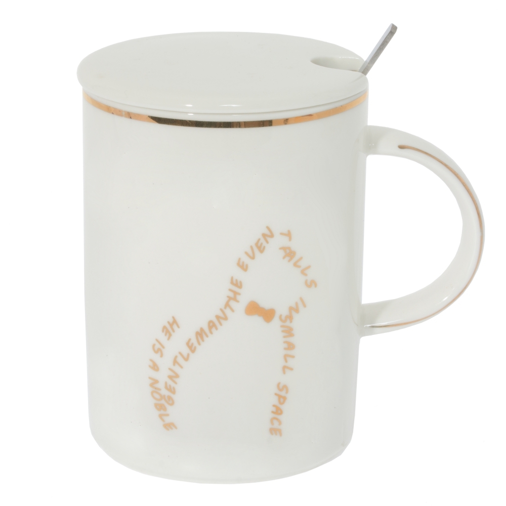 Кружка с крышкой и ложкой, изготовлена из фарфора и коррозионностойкой стали. Объем: 400 мл. Представлена в четырех вариантах.