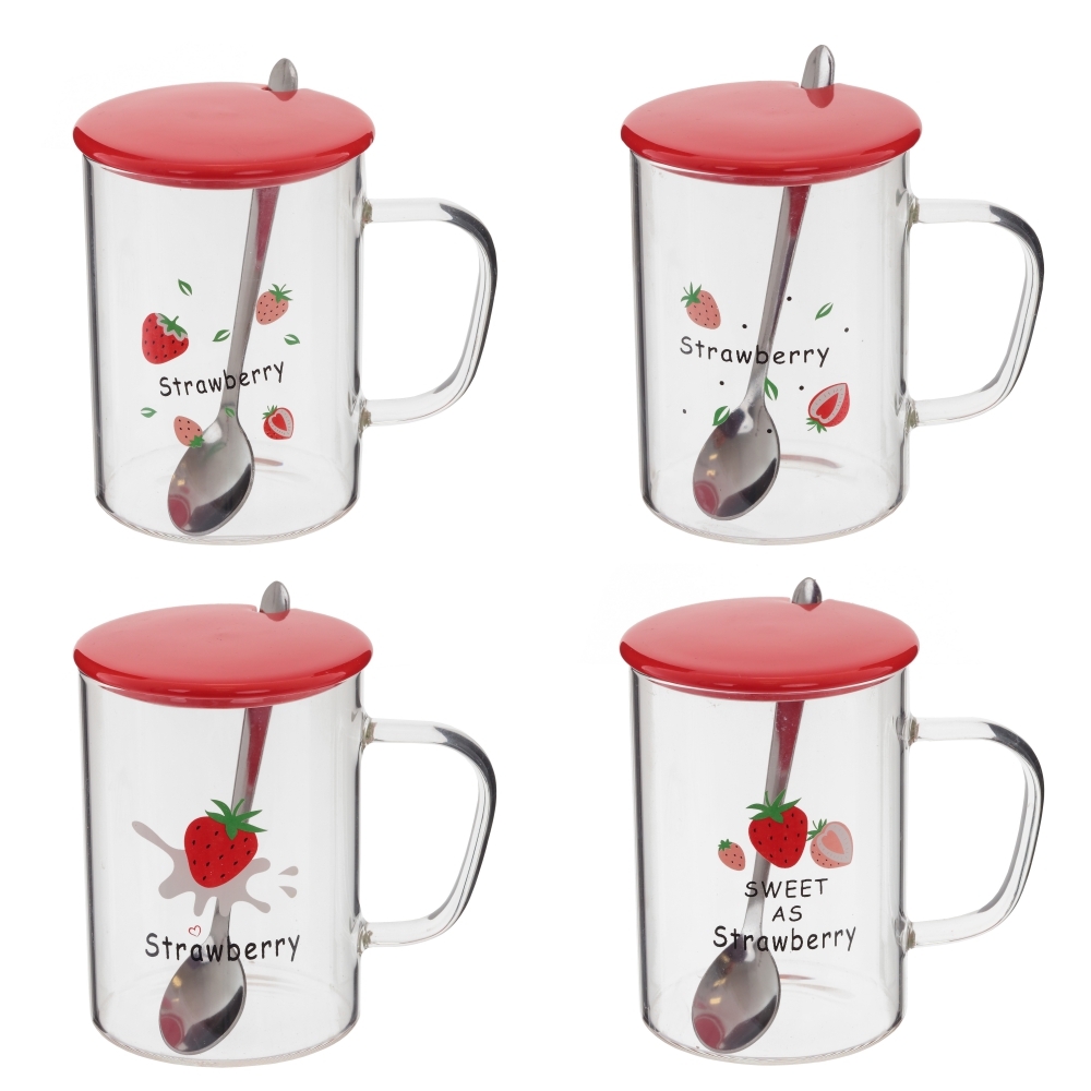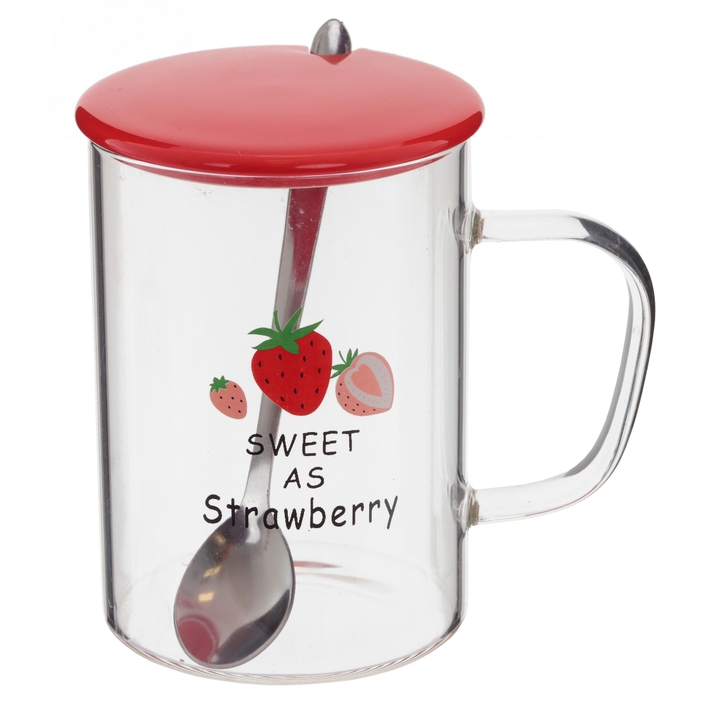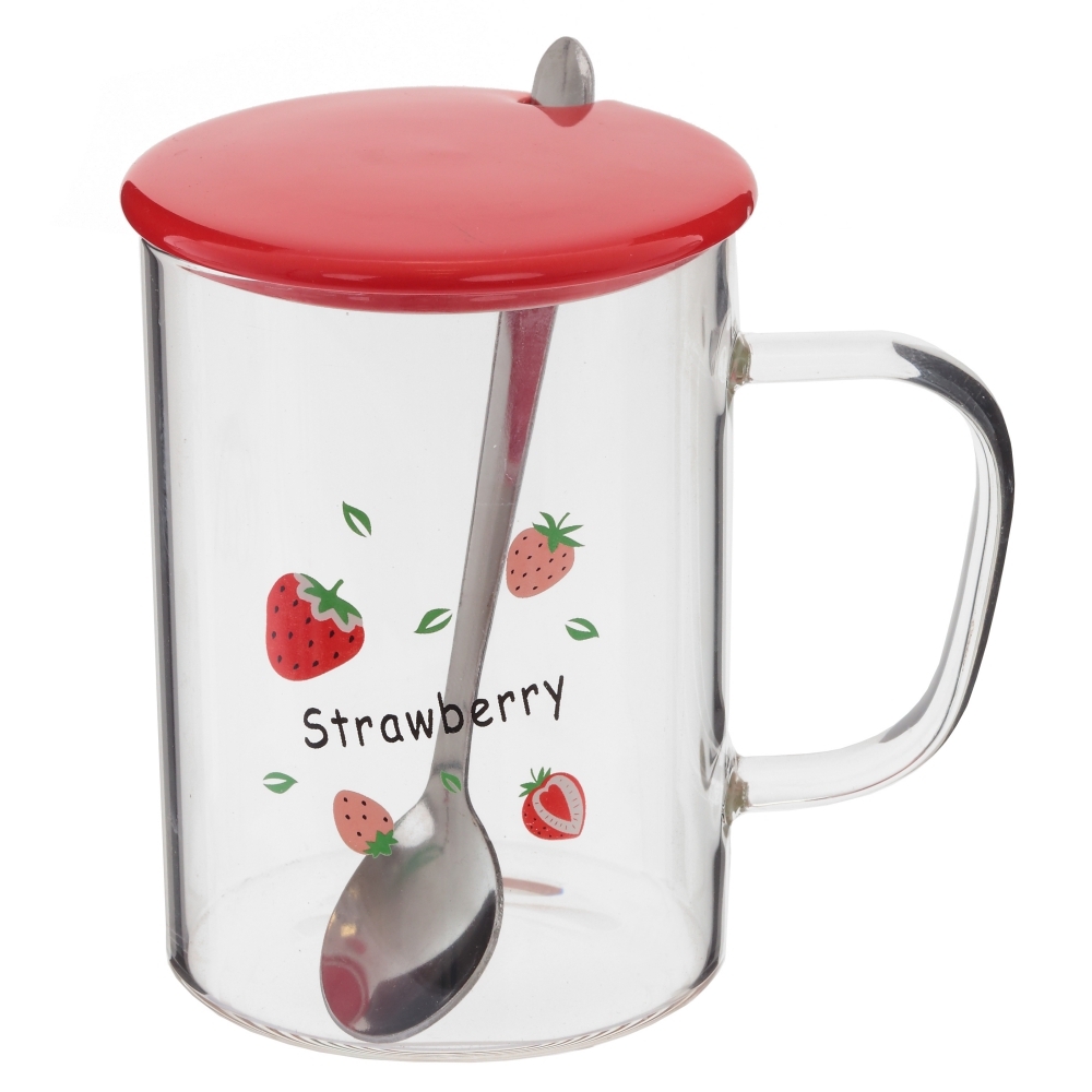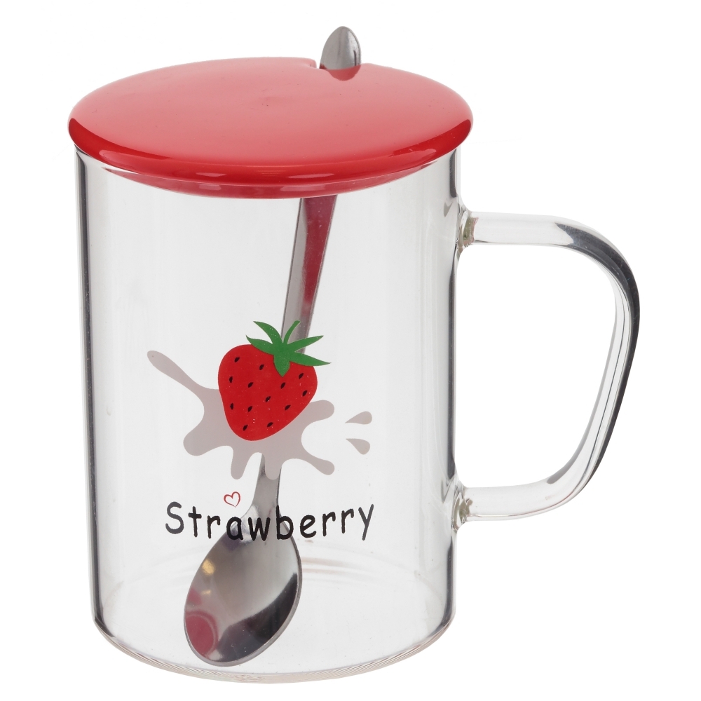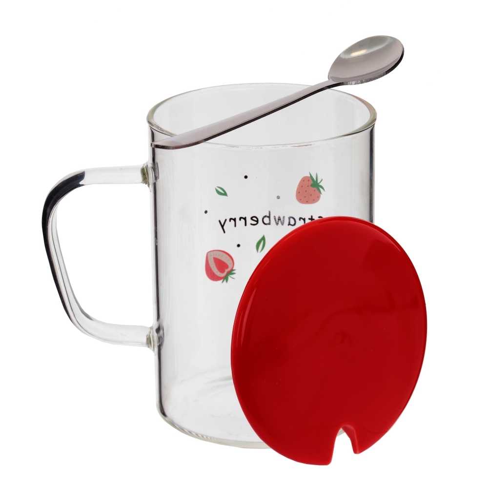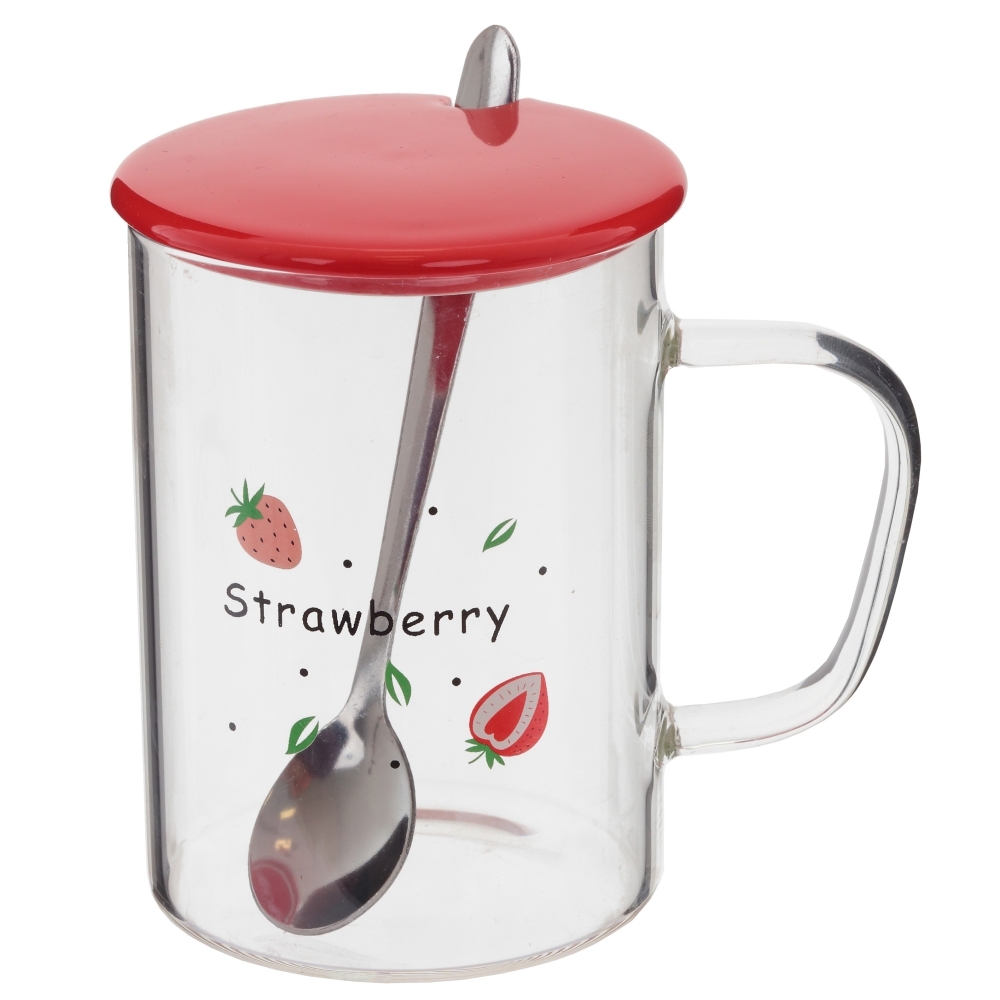 Стеклянная кружка с красной керамической крышкой и металлической ложкой представляет собой сочетание оригинального дизайна и высокого качества.