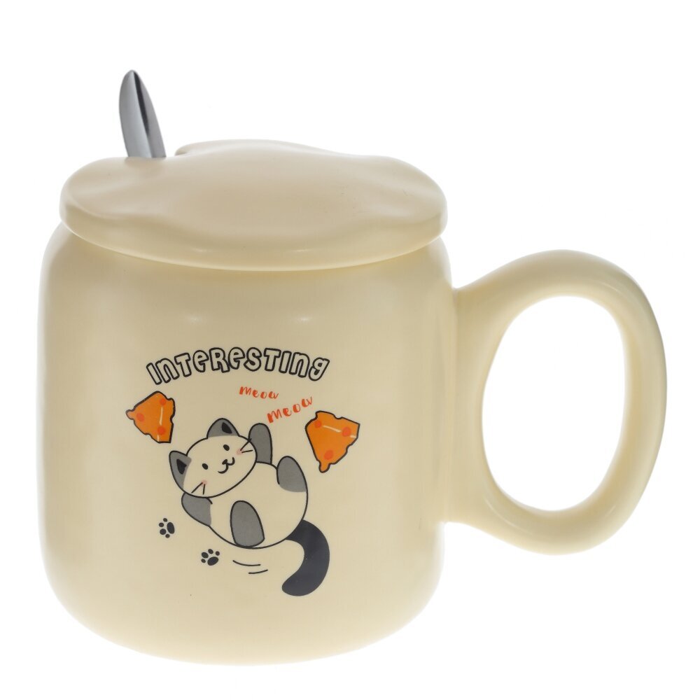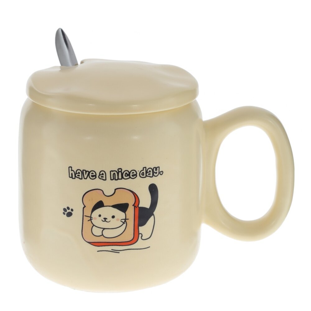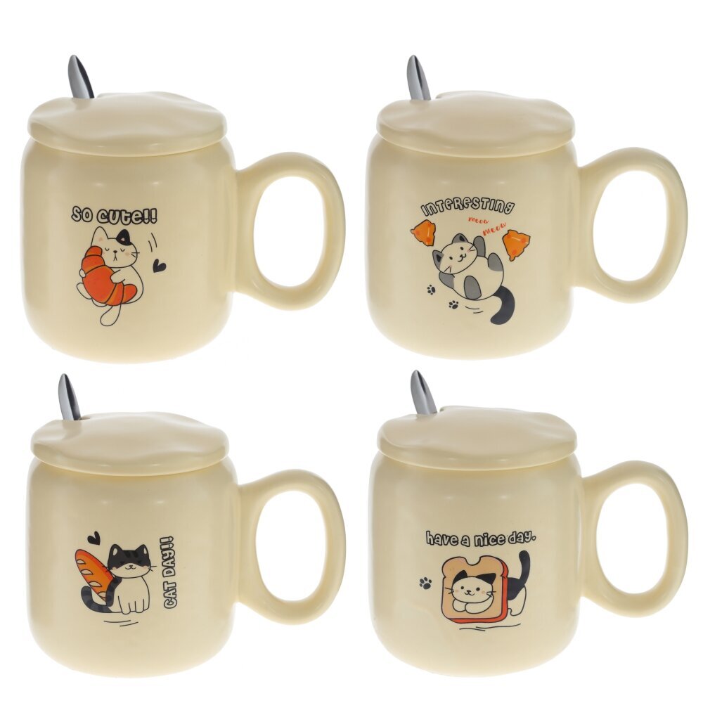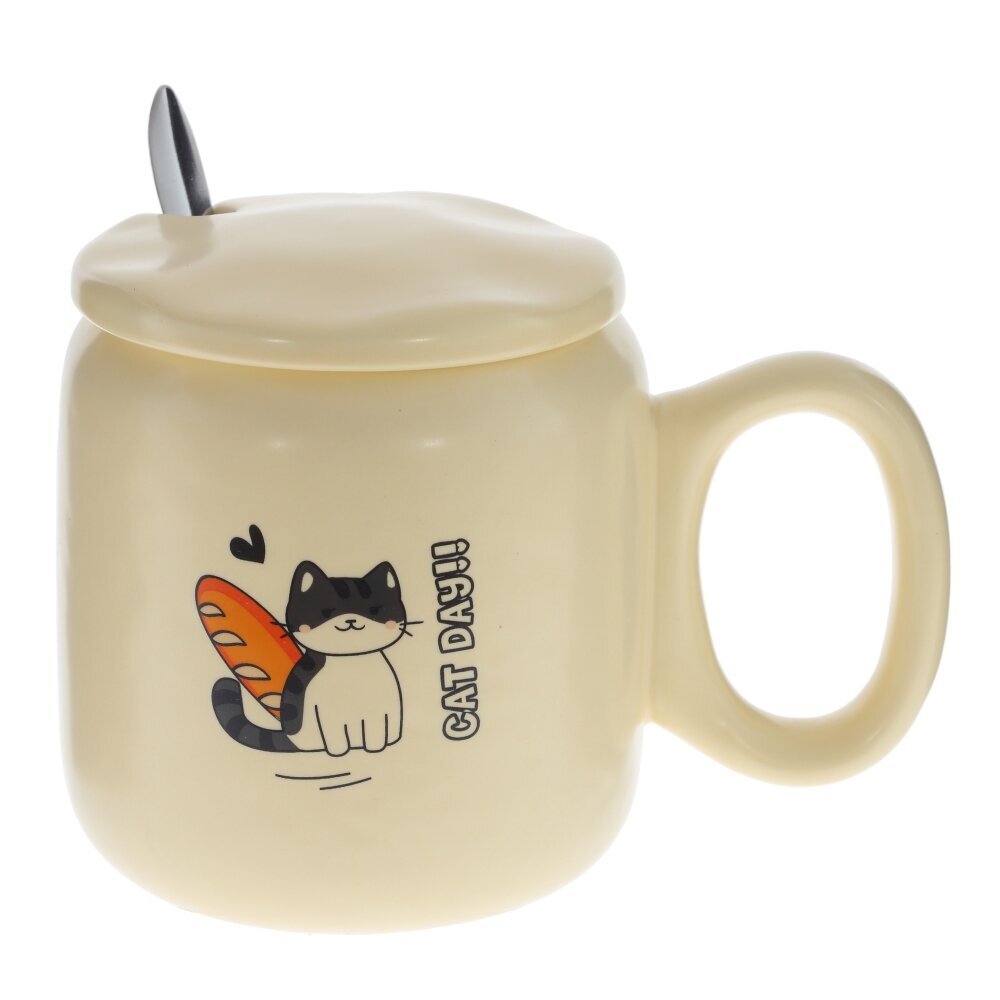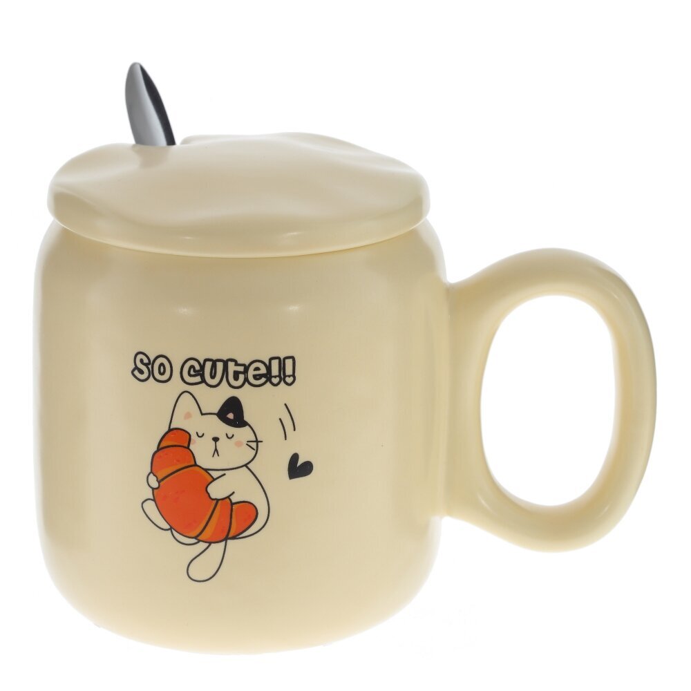 Очаровательная кружка с крышкой и ложкой на 450 мл — практичный и милый аксессуар для дома или офиса. Изготовлена из гладкого фарфора приятного кремового оттенка; на корпусе — забавный рисунок котика с круассаном и надписью “SO CUTE!!”. Плотно прилегающая фарфоровая крышка дольше сохраняет тепло напитка, а выемка позволяет удобно разместить входящую в комплект металлическую ложку. Широкая ручка и округлая форма делают кружку удобной для ежедневного использования: идеально подходит для чая, кофе, какао или травяных настоев. Прекрасная идея подарка для любителей уютных вещей. Уход: можно мыть в посудомоечной машине, избегайте абразивов; не используйте в СВЧ вместе с металлической ложкой. Материалы: фарфор, металл. Объем: 450 мл. Представлено в четырех вариантах.