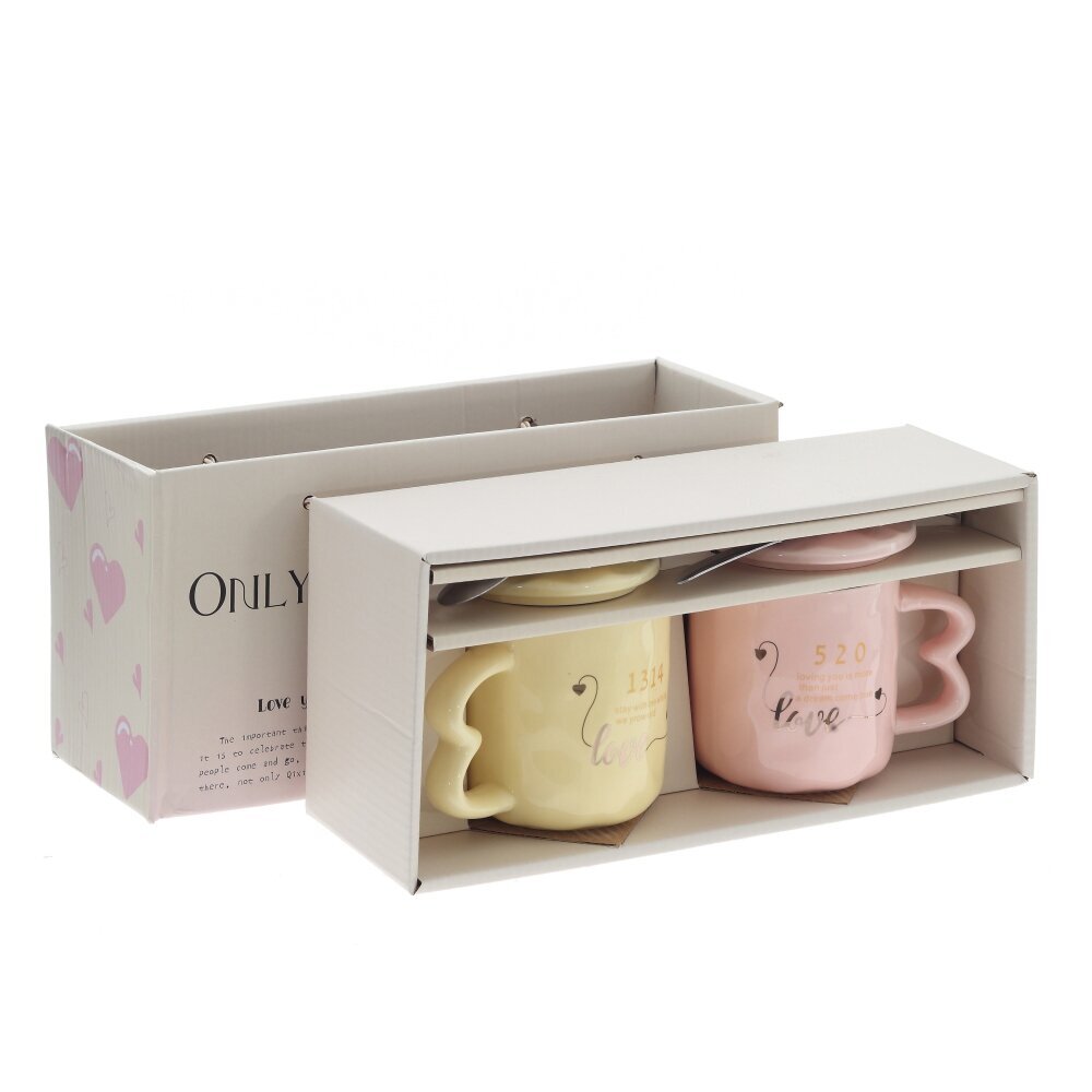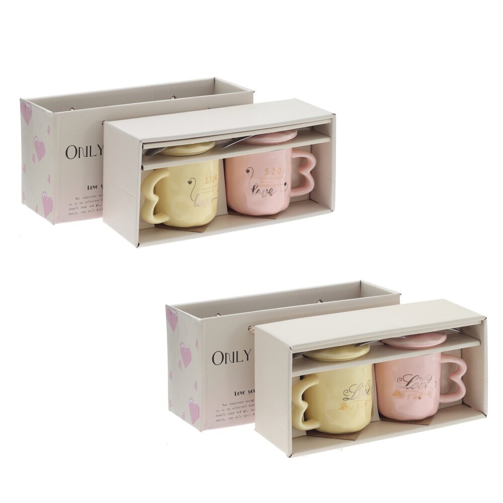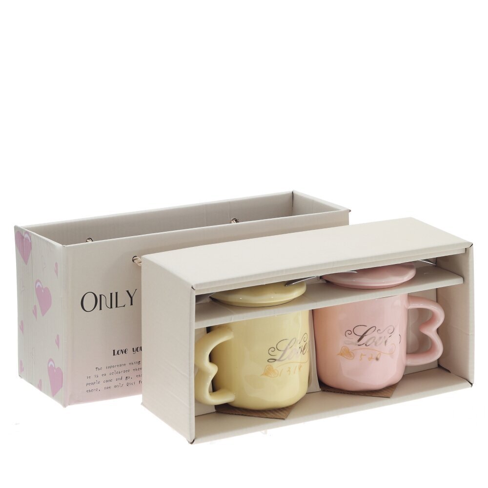 Набор из 2-х кружек с крышкой и ложкой, 300 мл. Материалы: фарфор, металл. Две изящные кружки пастельных оттенков — нежно?кремовая и розовая — украшены надписью Love и лаконичными золотистыми элементами. Фирменная деталь — удобные ручки в форме сердечек, которые приятно лежат в руке и создают романтическое настроение. Фарфоровые крышки с мягким рельефом помогают дольше сохранять тепло напитка, а прорезь позволяет оставлять металлическую ложку внутри, не снимая крышку. Объем 300 мл удобен для чая, кофе, какао или горячего шоколада. Гладкая глазурованная поверхность легко очищается, устойчивое дно обеспечивает надежную установку на столе. Набор гармонично смотрится в домашней кухне и офисе, станет трогательным подарком для пары, на годовщину, свадьбу или День святого Валентина. Представлено в двух вариантах.