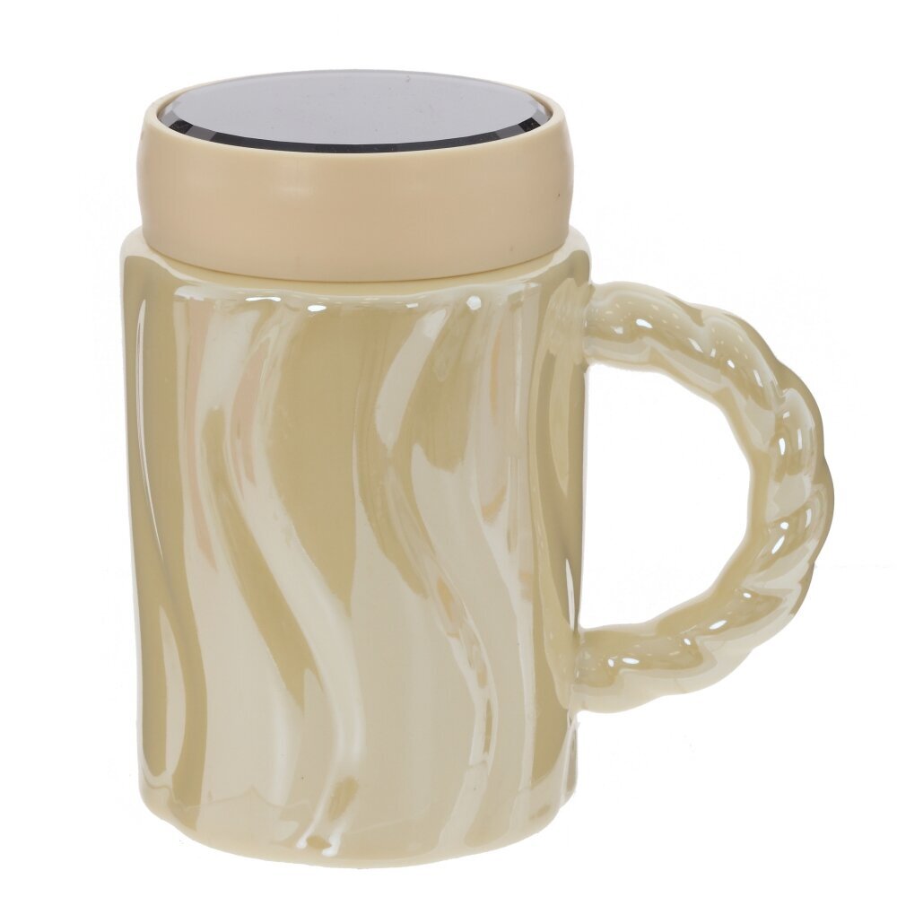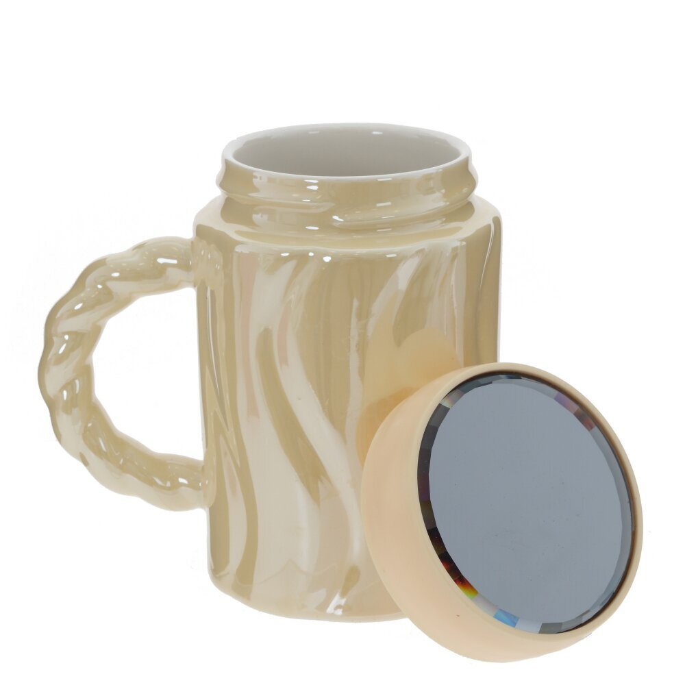 Стильная кружка с крышкой объёмом 380 мл — практичный и эффектный аксессуар для дома и офиса. Корпус выполнен из прочного фарфора с глянцевым покрытием. Оригинальная фигурная ручка обеспечивает удобный хват и придаёт изделию декоративный вид. Плотная крышка из полимерных материалов оснащена стеклянной зеркальной вставкой: напиток дольше остаётся горячим, а поверхность можно использовать как небольшое зеркальце. Кружка идеально подходит для чая, кофе, какао и станет удачным подарком любителям необычной посуды.