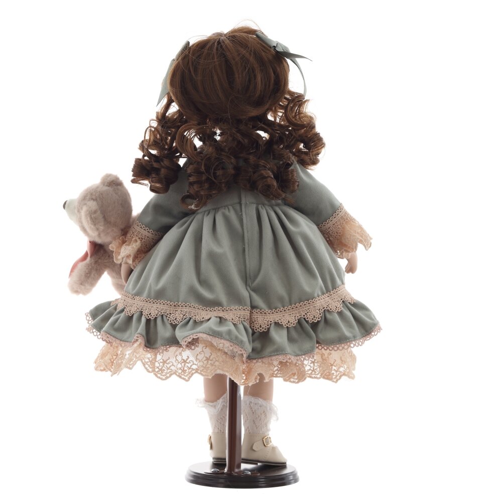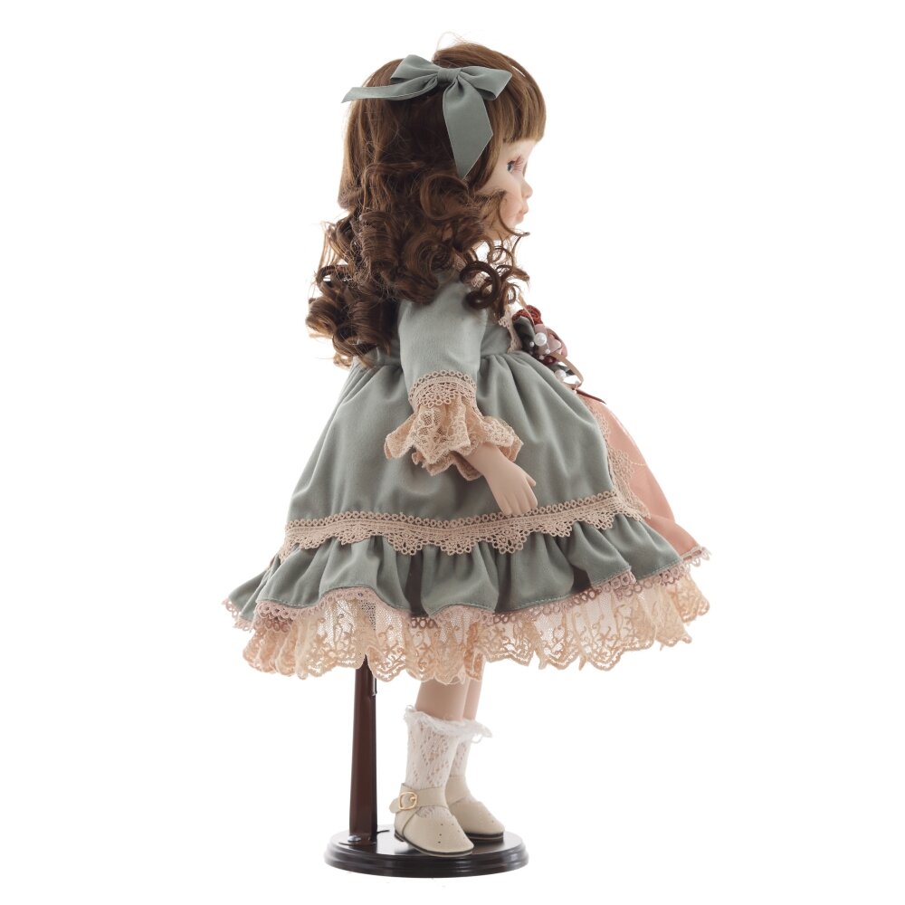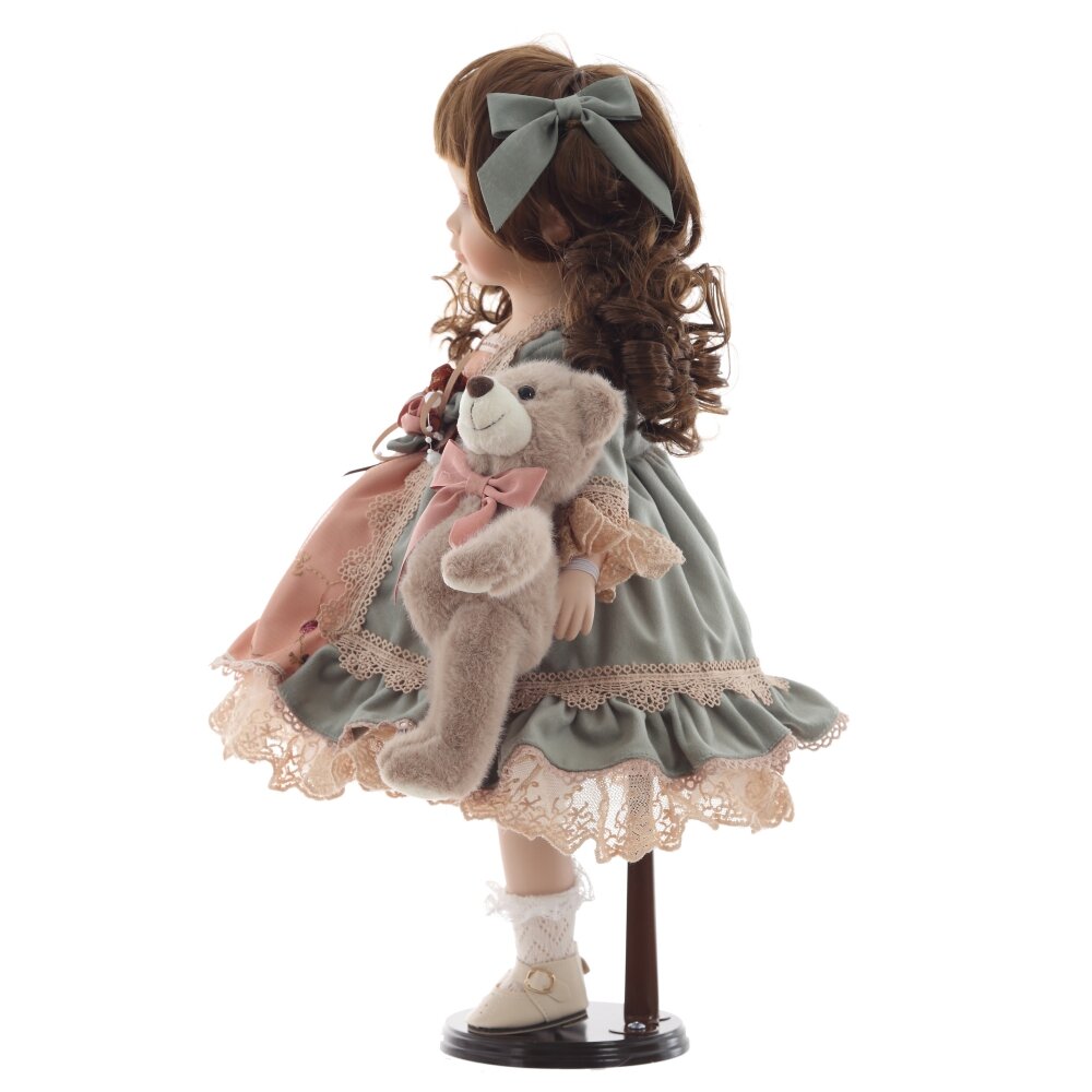 Элегантная коллекционная кукла с изящными чертами лица и выразительными глазами станет прекрасным украшением интерьера или ценной частью вашей коллекции. Кукла одета в роскошное платье нежных оттенков с кружевами и декоративными элементами. Её каштановые, кудрявые волосы аккуратно уложены и украшены атласными лентами. В руках кукла держит милого плюшевого мишку с бантиком, который придаёт ей ещё больше очарования. Детально проработанные черты лица, изысканная одежда и аксессуары делают эту куклу идеальным подарком для коллекционеров и ценителей винтажных игрушек. Она стоит на специальной подставке, что позволяет удобно размещать её на полке или в витрине.