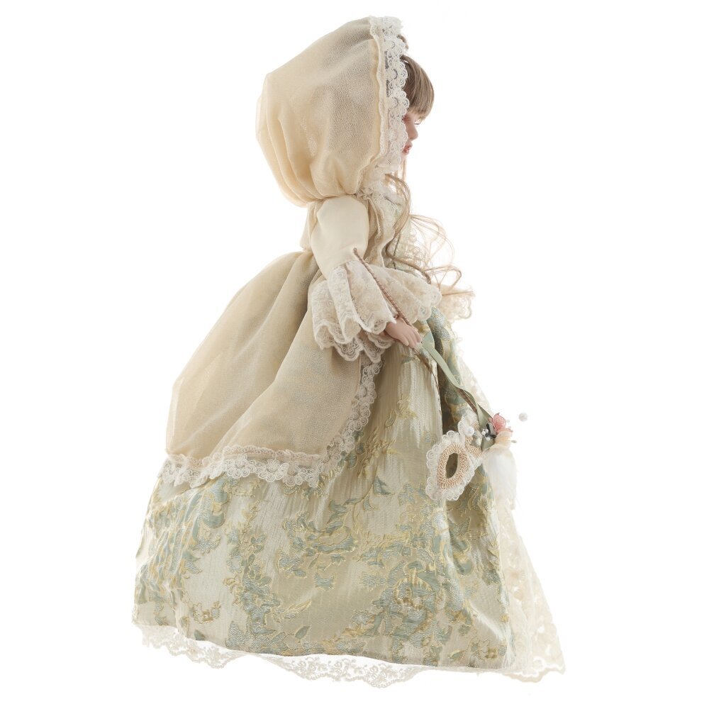 Элегантная коллекционная кукла. Изящное фарфоровое лицо куклы расписано вручную, придавая ей утончённое выражение. Волосы аккуратно уложены в прическу, дополняющую её аристократический образ. Наряд состоит из роскошного платья в пастельных тонах с кружевной отделкой, создавая эффект старинного аристократического костюма. В руках кукла держит элегантный аксессуар, гармонично сочетающийся с её образом. В комплект входит деревянная подставка, позволяющая удобно разместить куклу в интерьере. Эта кукла станет отличным украшением коллекции, прекрасно дополняя классический интерьер и внося в него нотки утончённости и исторического шарма.
