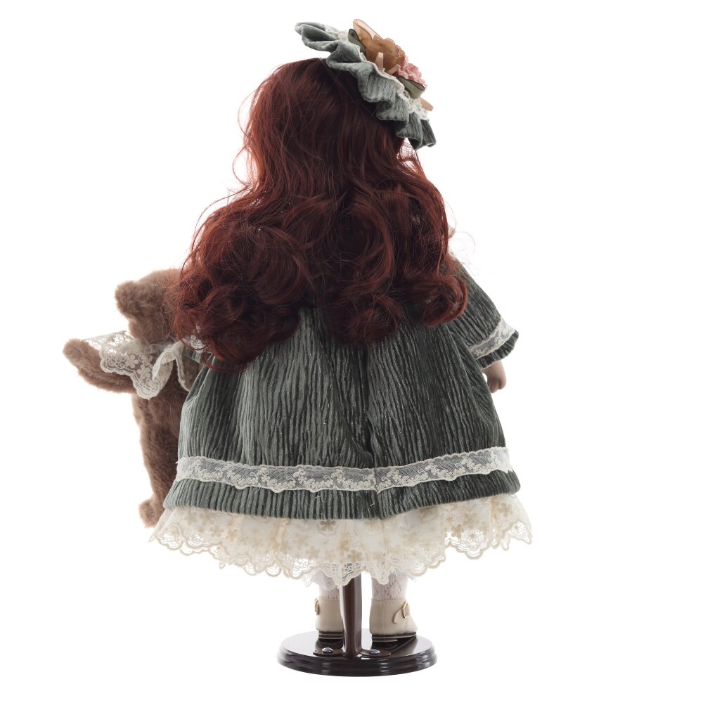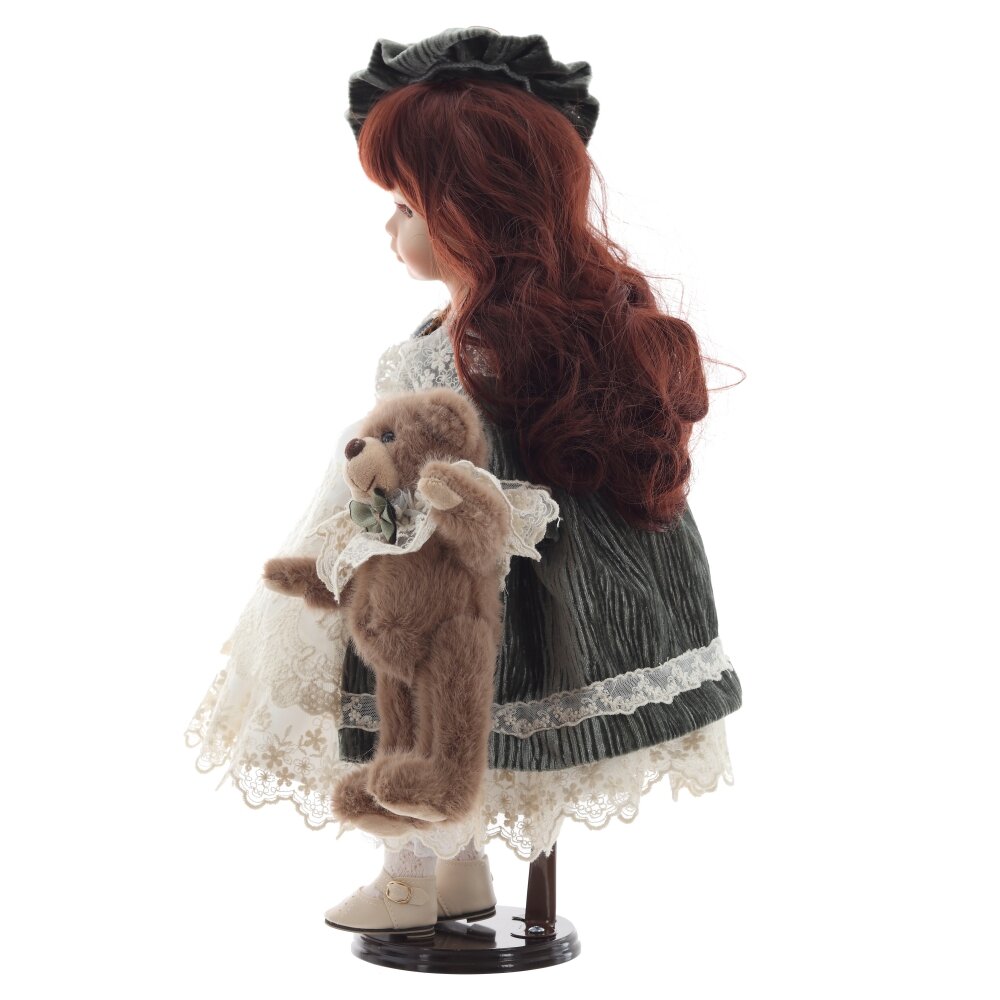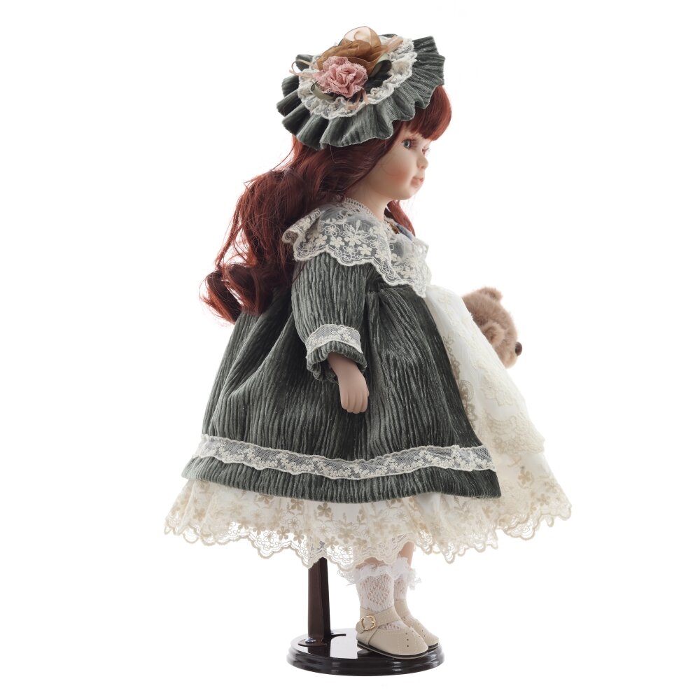 Элегантная коллекционная кукла в винтажном стиле станет прекрасным украшением интерьера и отличным подарком. Она одета в роскошное платье зеленого цвета с кружевной отделкой, дополненное многослойной юбкой из белого кружева. На голове у куклы изящный головной убор, гармонирующий с нарядом. У куколки реалистичные черты лица, выразительные глаза и аккуратно уложенные волосы. В руках она держит милого плюшевого медвежонка с атласным бантом. Кукла установлена на специальную подставку для удобного размещения. Этот изысканный предмет создан для коллекционеров и любителей классических кукол.