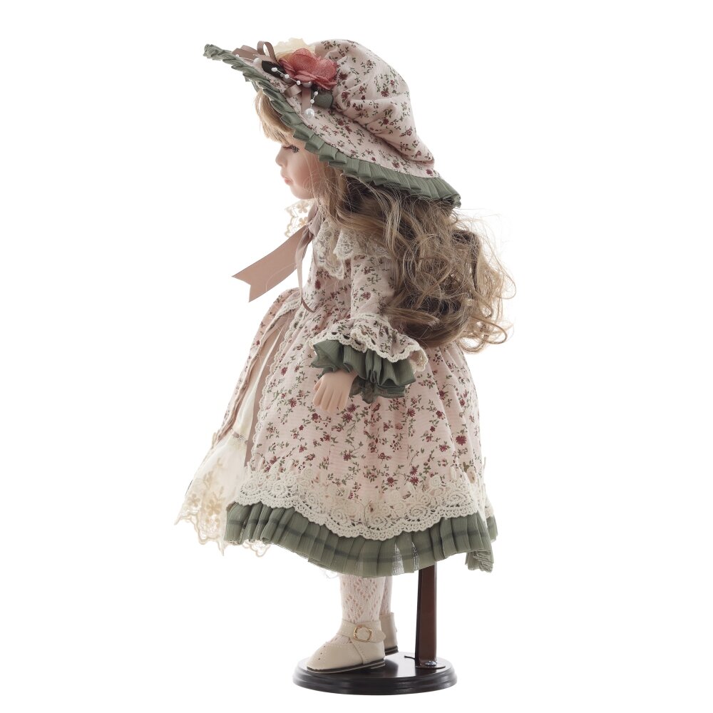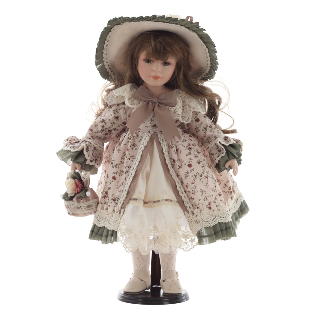 Элегантная коллекционная кукла в винтажном стиле станет прекрасным украшением интерьера и отличным подарком для ценителей изысканных вещей. У нее нежное фарфоровое лицо с аккуратно прорисованными чертами, длинные волнистые волосы и выразительный взгляд. Кукла одета в нарядное платье с цветочным узором, украшенное кружевом и лентами, а также носит изысканную шляпку с рюшами. В руках она держит маленькую корзинку с цветами, дополняющую утонченный образ. Изящные ботиночки и вязаные носочки завершают антураж настоящей аристократической дамы. Такая кукла станет отличным дополнением коллекции или изысканным подарком для любителей винтажных аксессуаров.