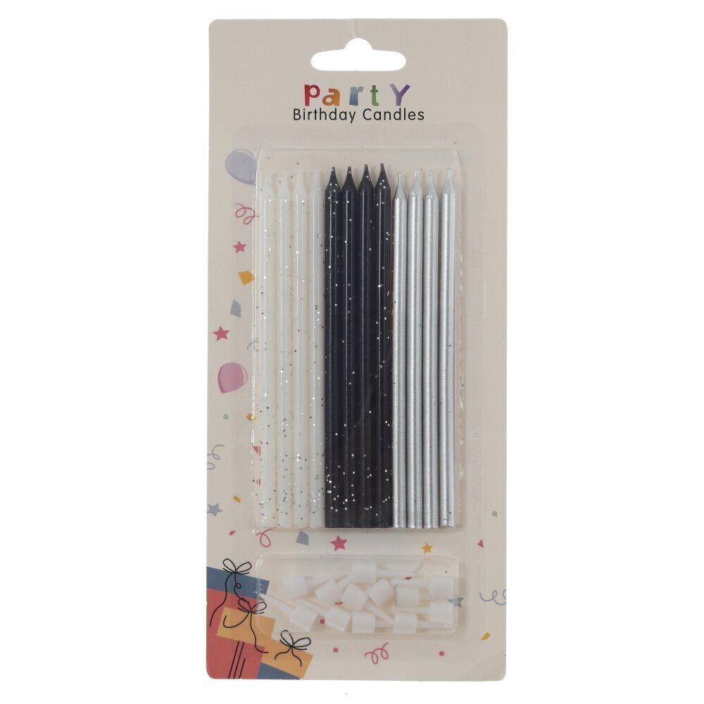 Набор из 12 тонких свечей для торта, материал — парафин. В комплекте три благородных оттенка: белые с серебристым мерцанием, глубокие черные с блестками и элегантные серебристые — по несколько штук каждого цвета. Свечи удлиненные и аккуратные, создают изящный вертикальный акцент на торте и подходят к любому оформлению — от классического до современного минимализма. Внизу упаковки — пластиковые держатели?подставки, с которыми свечи легко и ровно устанавливаются в бисквит или крем. Упаковка-блистер с подвесом, удобна для хранения и дарения. Отличный выбор для дня рождения, юбилея или фотосессии праздничного десерта. Рекомендации: зажигать перед подачей, не оставлять без присмотра и легковоспламеняющихся предметов.