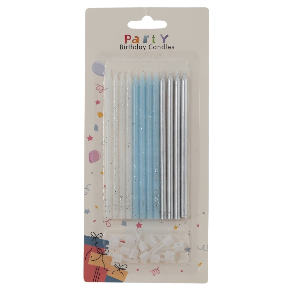 Набор праздничных свечей для торта, 12 шт. Изготовлены из парафина. В комплекте три оттенка: белые, небесно?голубые и серебристые, все украшены мелкими блестками для мерцающего эффекта. Свечи тонкие и удлиненные, с заострённым верхом и стандартным фитилем, их удобно расставлять на десерте. Внизу упаковки — белые пластиковые держатели, которые надежно фиксируют свечи в креме и помогают сохранить поверхность торта. Идеальны для дня рождения, юбилея и любых домашних праздников, универсальная палитра гармонично сочетается с классическими и современными тортами.