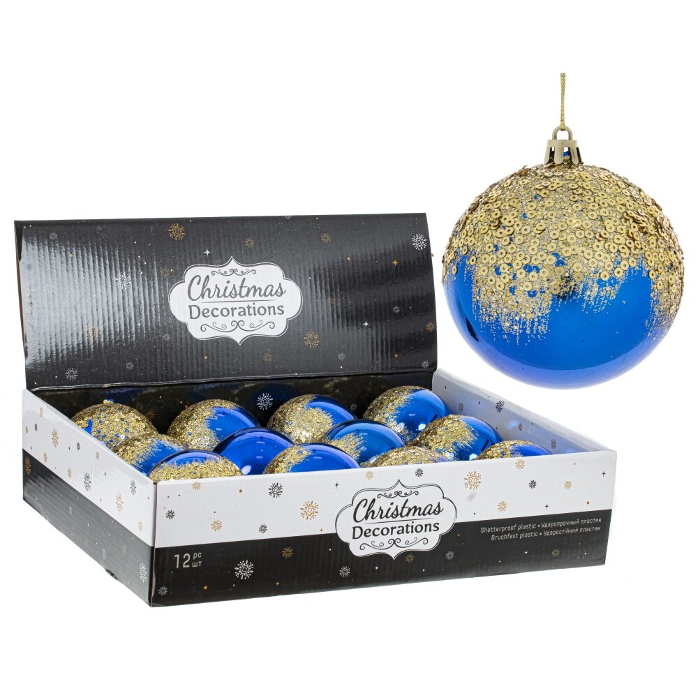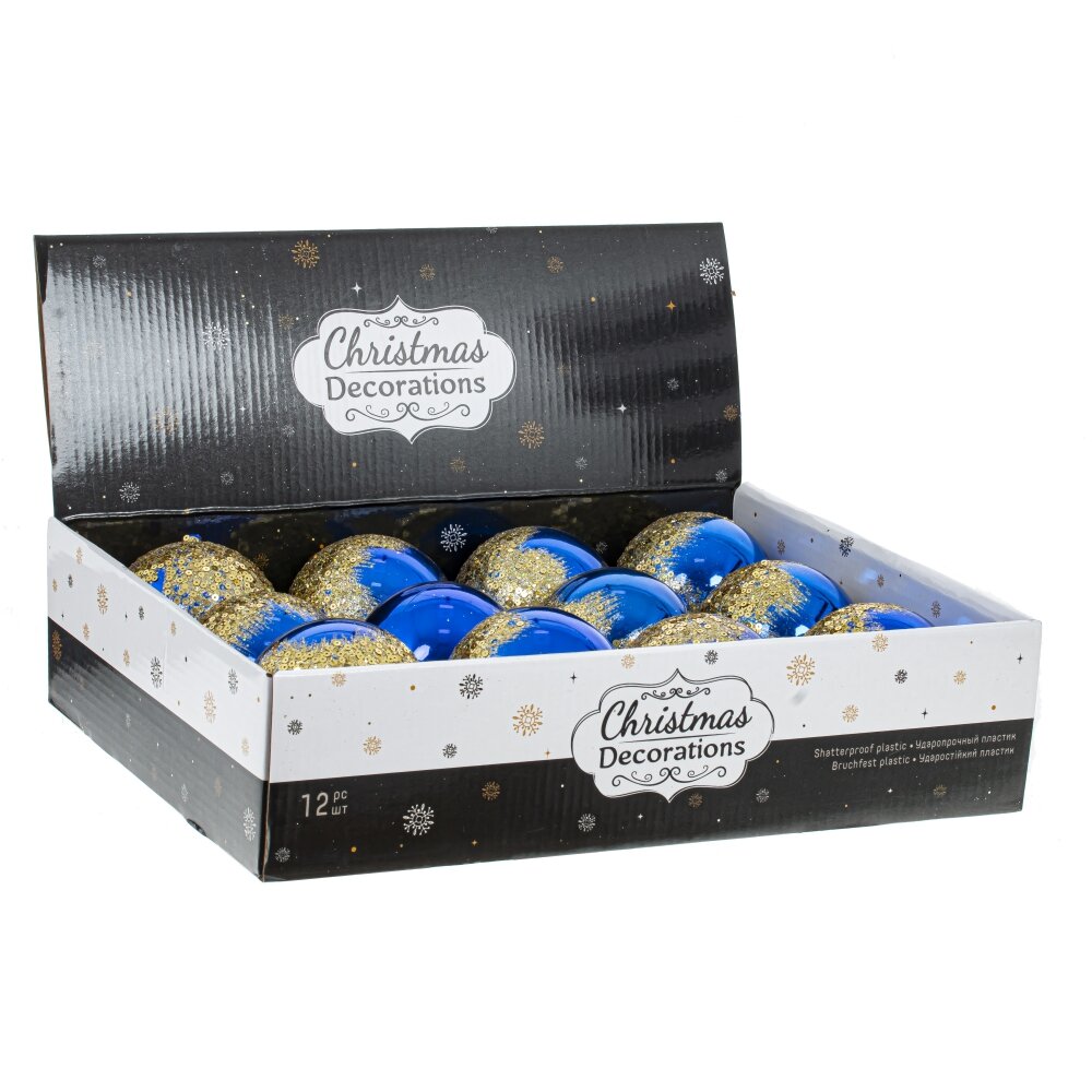 Набор из 12-ти шаров для елки в шоу-боксе. Эти новогодние шары из пластика, непременно, порадуют вас своим изяществом и прекрасно дополнят праздничный наряд лесной красавицы.