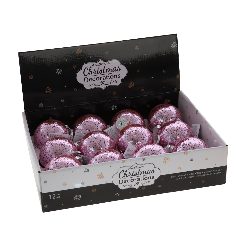 Набор из 12-ти шаров для елки в шоу-боксе. Эти новогодние шары из пластика, непременно порадуют вас своим изяществом и прекрасно дополнят праздничный наряд лесной красавицы.