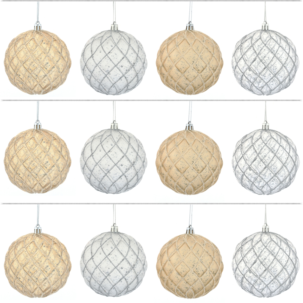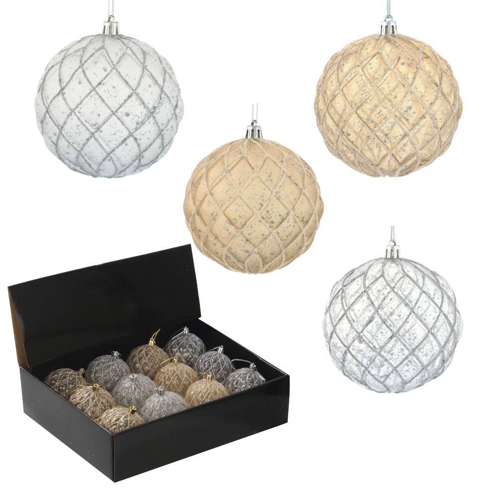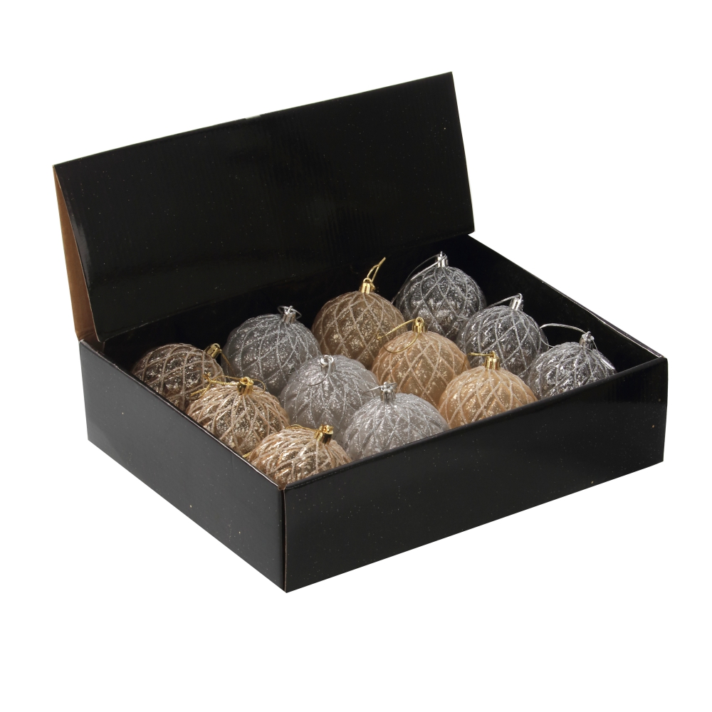 Набор из 12-ти шаров для елки в шоу-боксе. Эти новогодние шары из пластика, непременно порадуют вас своим изяществом и прекрасно дополнят праздничный наряд лесной красавицы.