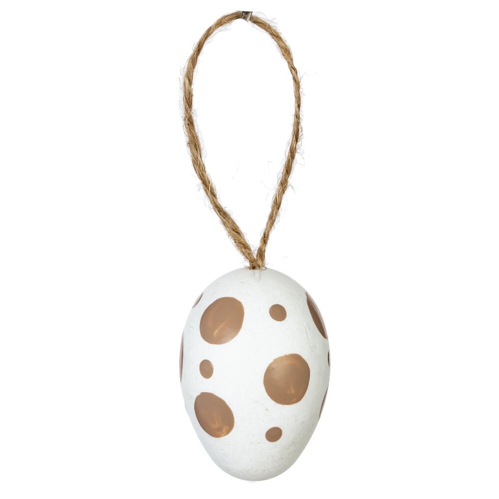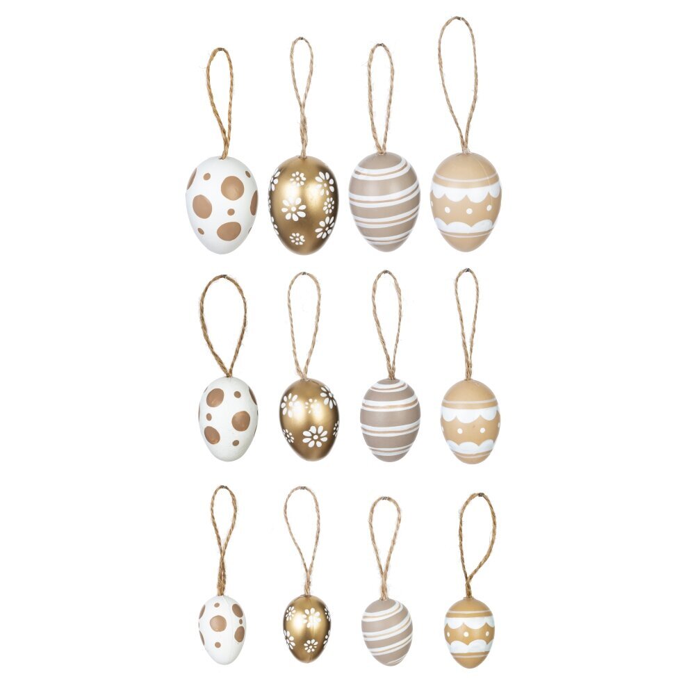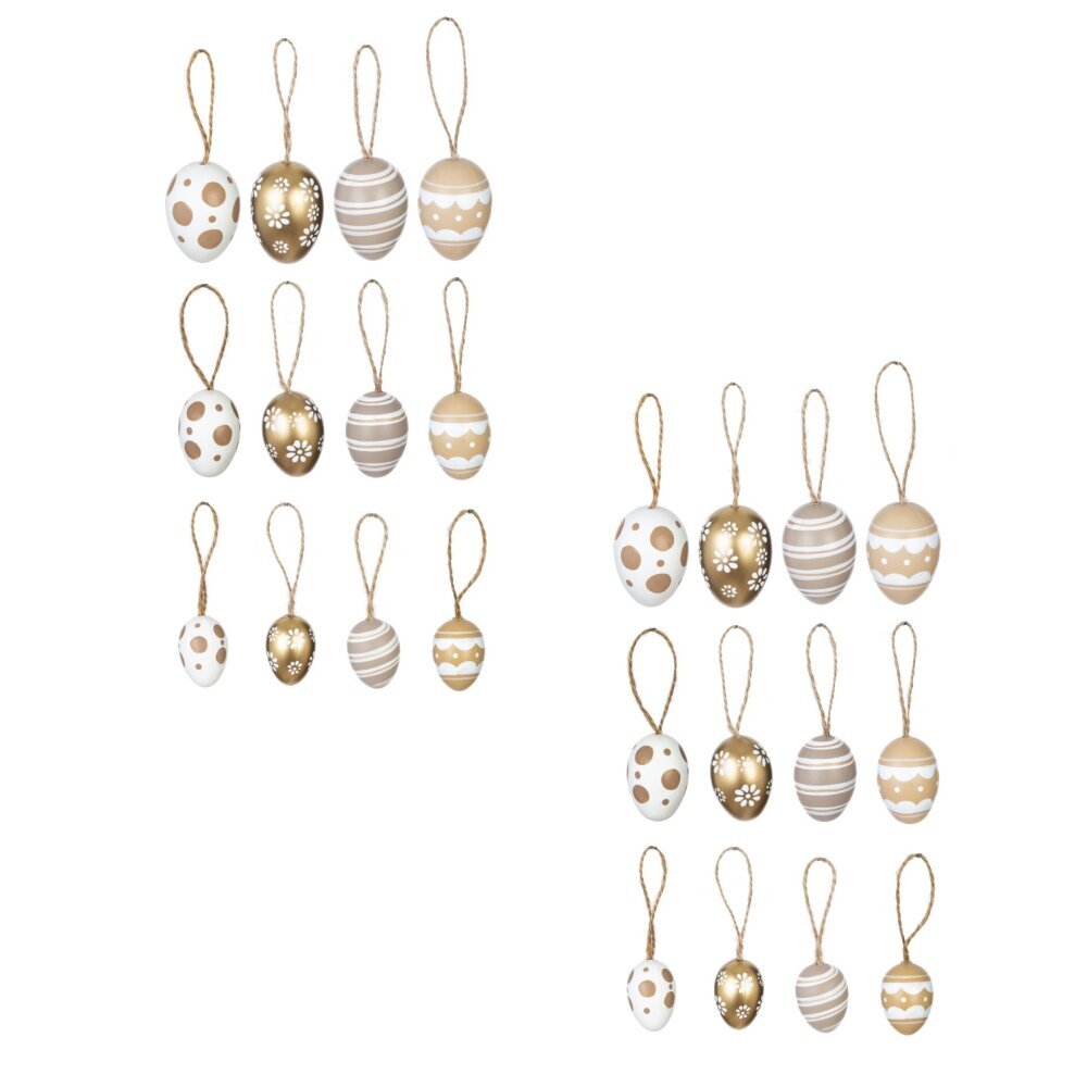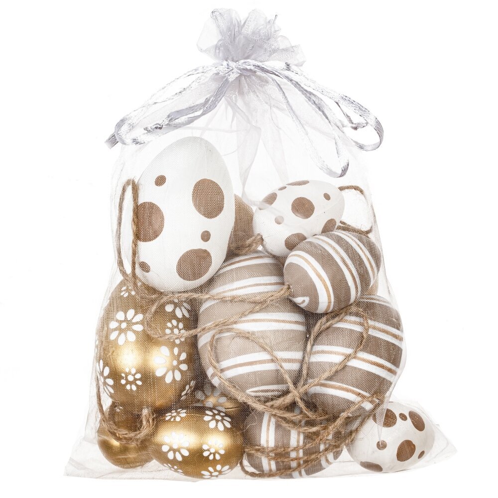 Набор из 16-ти подвесных декоративных изделий «Яйцо» — стильное решение для пасхального оформления интерьера. Яйца выполнены из прочных полимерных материалов и оформлены в гармоничной гамме: белый, бежевый и золотой цвета с горохом, полосами и цветочным орнаментом. Каждое изделие снабжено льняной верёвочкой для подвешивания, что позволяет легко использовать их для украшения пасхального дерева, веточек, корзин, праздничного стола, венков и подарочных композиций. Лёгкие и безопасные, яйца подойдут для дома, офиса, витрин и фотозон, создавая уютную весеннюю атмосферу и подчеркивая тему светлого праздника Пасхи. Набор упакован в прозрачный подарочный мешочек.