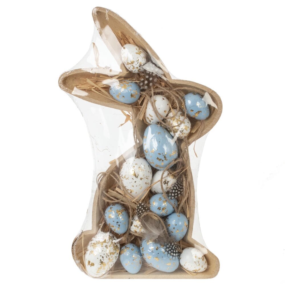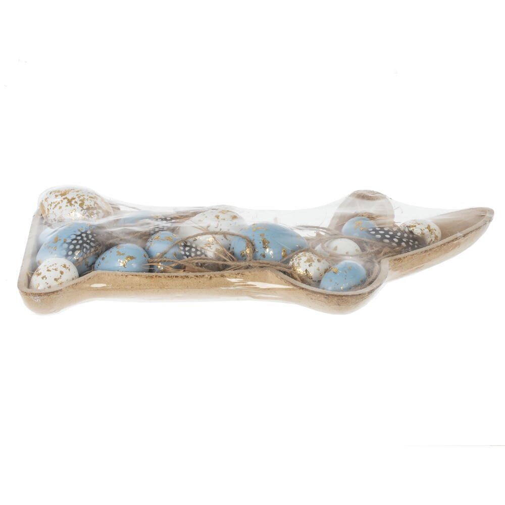 Набор из 16-ти декоративных изделий подвесных«Яйцо» – изящное пасхальное украшение для дома и праздничного стола. В комплект входят яйца из полимерных материалов в нежной гамме: небесно-голубые и белые, украшенные золотистыми крапинками. Элементы дополнены декоративной соломой и перьями, упакованы в поднос в форме зайца, что делает набор готовым подарочным решением. Подходит для оформления пасхальных деревьев, композиций, корзин, венков, сервировки стола, декора камина, подоконников и фотозон. Легкие и прочные изделия можно использовать многократно, сочетать с живыми цветами, свечами и текстилем в светлых тонах, создавая атмосферу уюта и весеннего обновления.