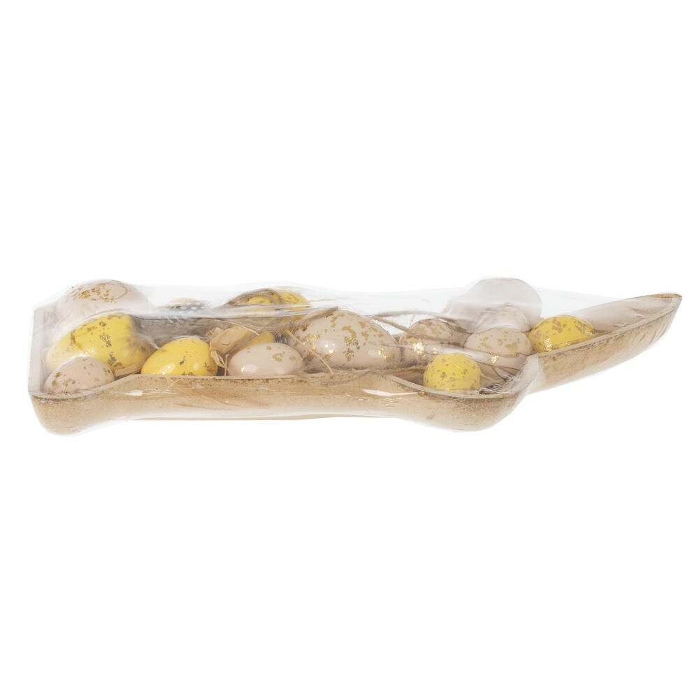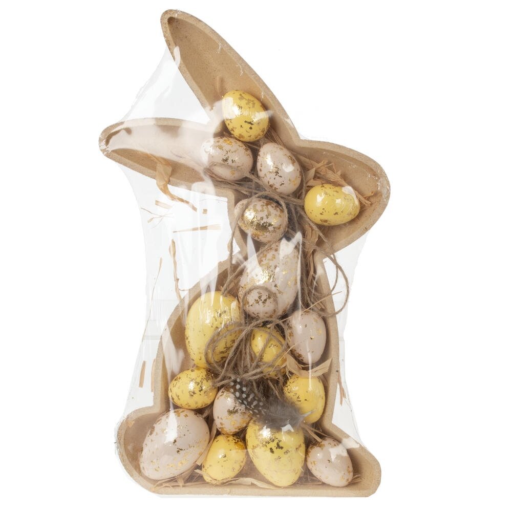Набор из 16-ти декоративных изделий подвесных «Яйцо» – изящное пасхальное украшение для дома и праздничного стола. В комплект входят яйца из полимерных материалов в нежной гамме: желтые и бежевые, украшенные золотистыми крапинками. Элементы дополнены декоративной соломой и перьями, упакованы в поднос в форме зайца, что делает набор готовым подарочным решением. Подходит для оформления пасхальных деревьев, композиций, корзин, венков, сервировки стола, декора камина, подоконников и фотозон. Легкие и прочные изделия можно использовать многократно, сочетать с живыми цветами, свечами и текстилем в светлых тонах, создавая атмосферу уюта и весеннего обновления.