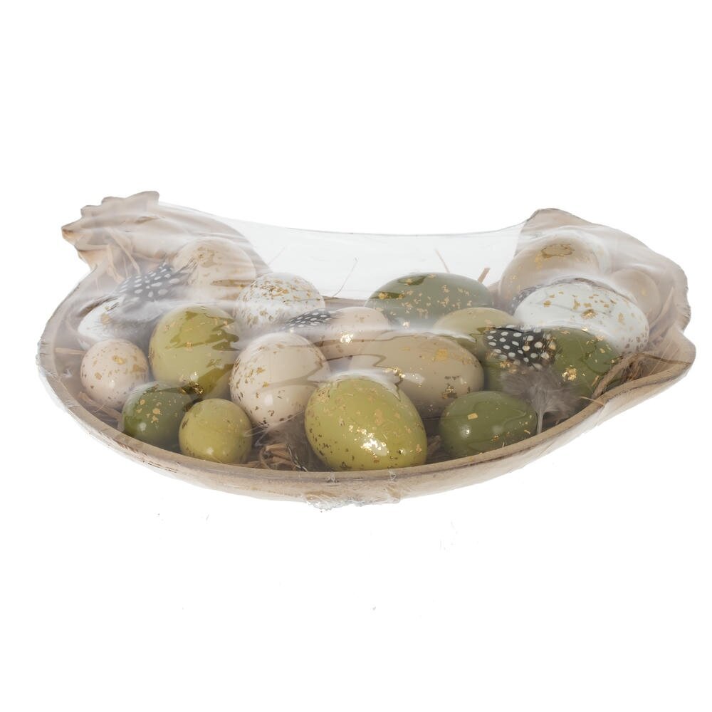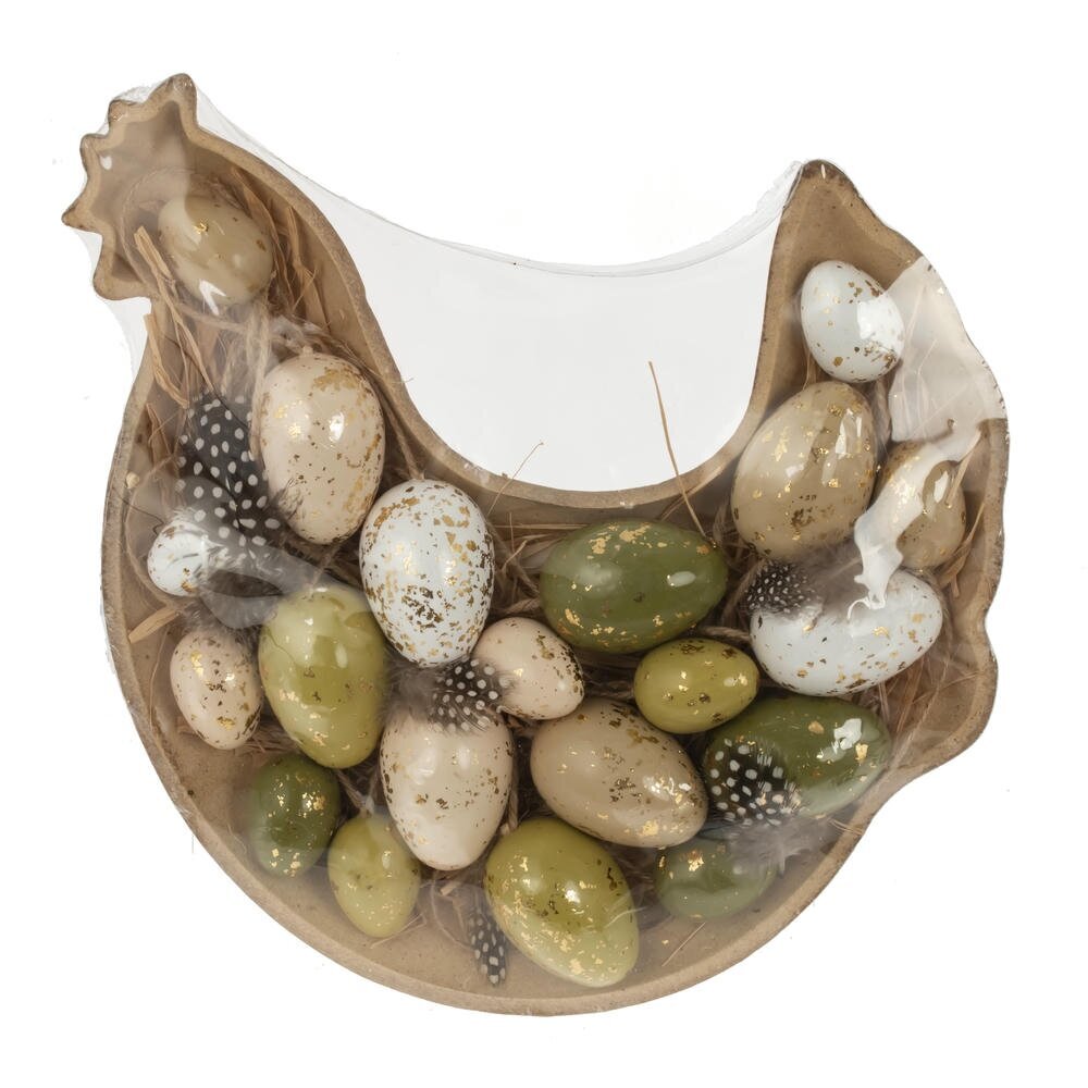 Набор из 18-ти декоративных изделий подвесных «Яйцо» – изящное пасхальное украшение для дома и праздничного стола. В комплект входят яйца из полимерных материалов в нежной гамме: бежевые и зеленые, украшенные золотистыми крапинками. Элементы дополнены декоративной соломой и перьями, упакованы в поднос в форме курочки, что делает набор готовым подарочным решением. Подходит для оформления пасхальных деревьев, композиций, корзин, венков, сервировки стола, декора камина, подоконников и фотозон. Легкие и прочные изделия можно использовать многократно, сочетать с живыми цветами, свечами и текстилем в светлых тонах, создавая атмосферу уюта и весеннего обновления.