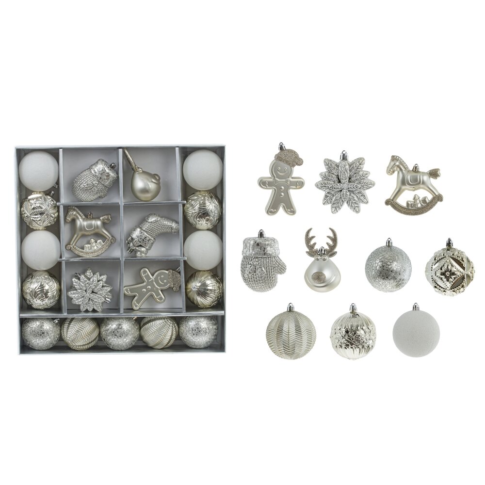 Каждое украшение в наборе выполнено из прочного и легкого полимерного материала, что делает его удобным для подвешивания на елку. Глиттер, рассыпанный по поверхности украшений, придает им особый блеск и изящество, словно они покрыты искрящимся инеем. Данный набор - это не просто украшения, это стильный акцент, который принесет в ваш дом волшебство Нового года.